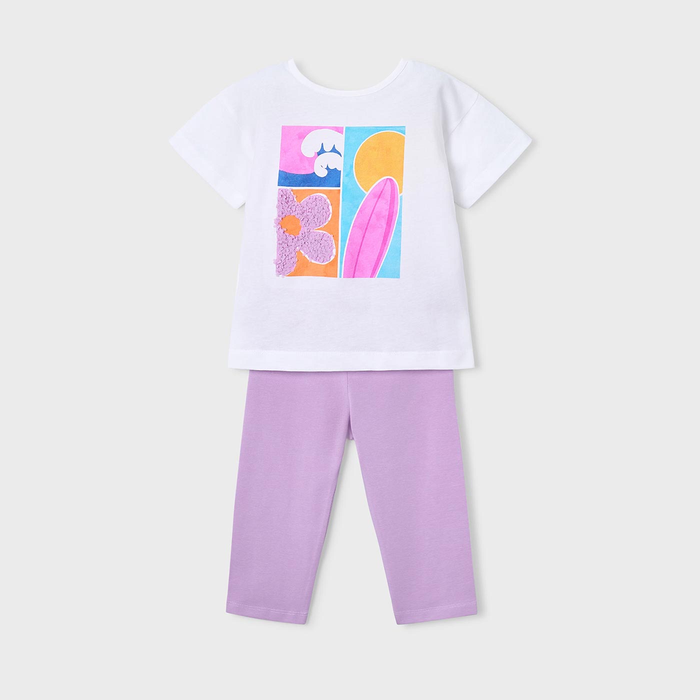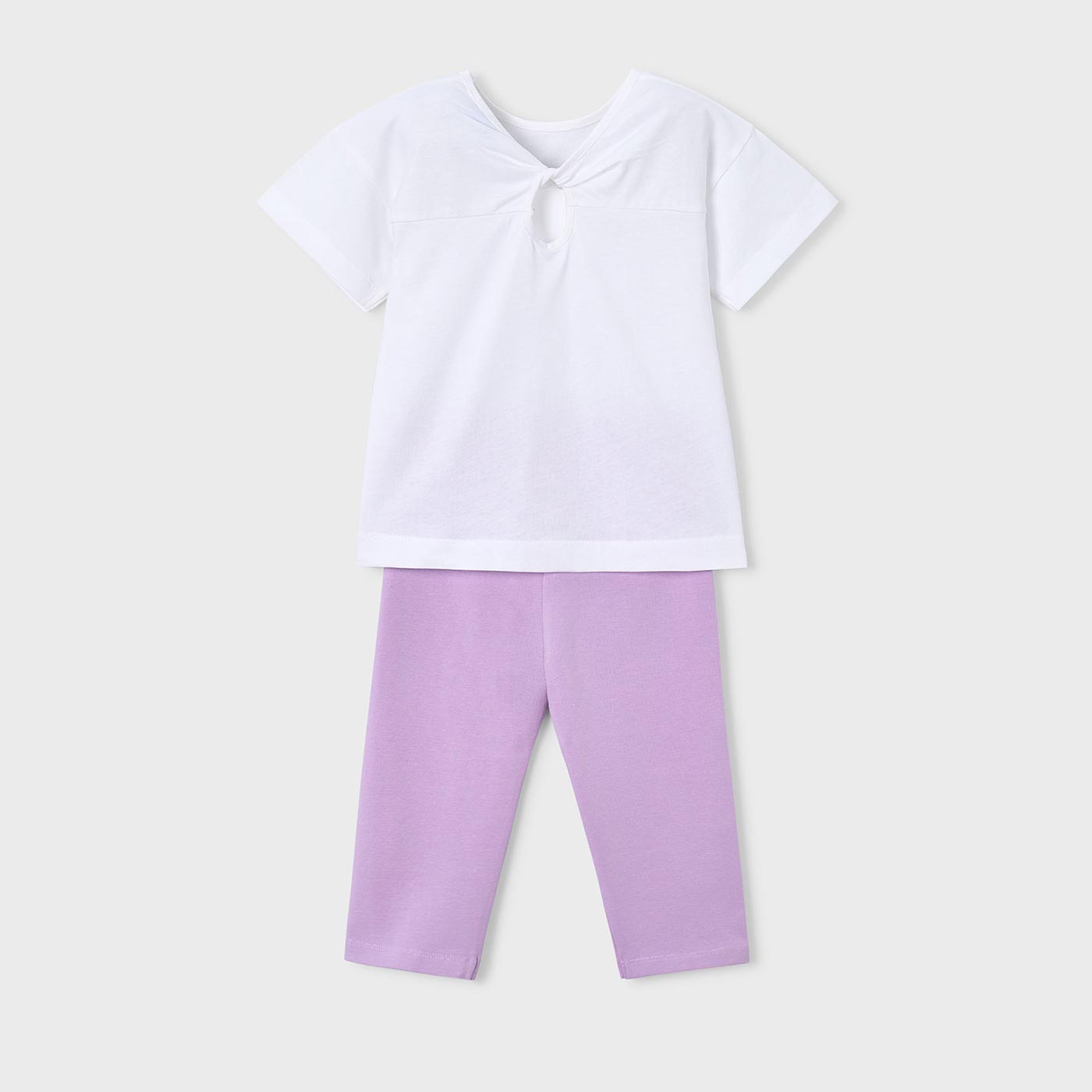 Το παιδικό σετ Mayoral για κορίτσια σε κομψό συνδυασμό λευκού και λιλά αποτελεί ιδανική επιλογή για άνετες και στιλάτες καλοκαιρινές εμφανίσεις. Το σετ περιλαμβάνει κοντομάνικη μπλούζα με μοντέρνο, πολύχρωμο print στο μπροστινό μέρος και κολάν κάπρι σε απαλή λιλά απόχρωση.Η μπλούζα διαθέτει χαλαρή γραμμή και ιδιαίτερη λεπτομέρεια ανοίγματος στο πίσω μέρος, προσθέτοντας μια μοντέρνα πινελιά, ενώ το βαμβακερό ύφασμα χαρίζει δροσερή αίσθηση. Το κάπρι κολάν είναι ελαστικό, εφαρμόζει άνετα και επιτρέπει ελευθερία κινήσεων, ιδανικό για παιχνίδι και καθημερινές δραστηριότητες.Ένα ολοκληρωμένο σύνολο που συνδυάζει άνεση, ποιότητα και σύγχρονο design, με την υπογραφή της Mayoral.