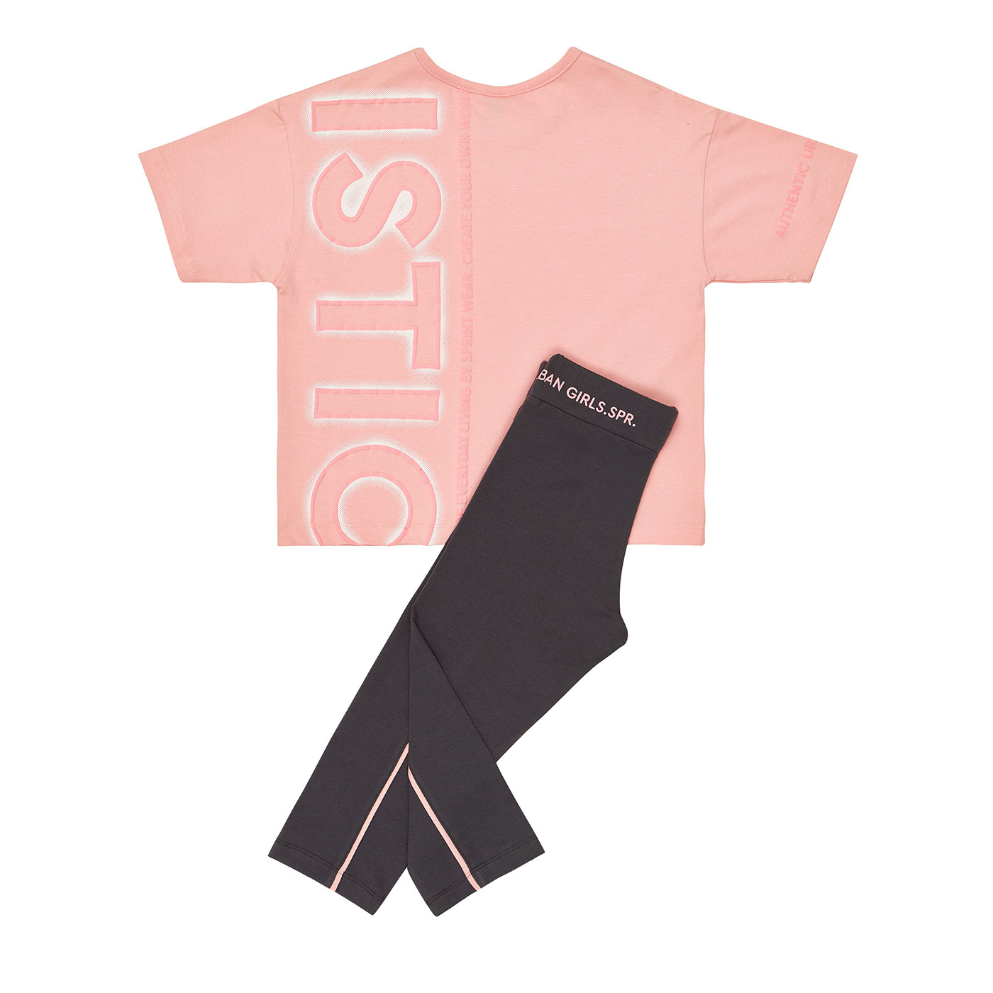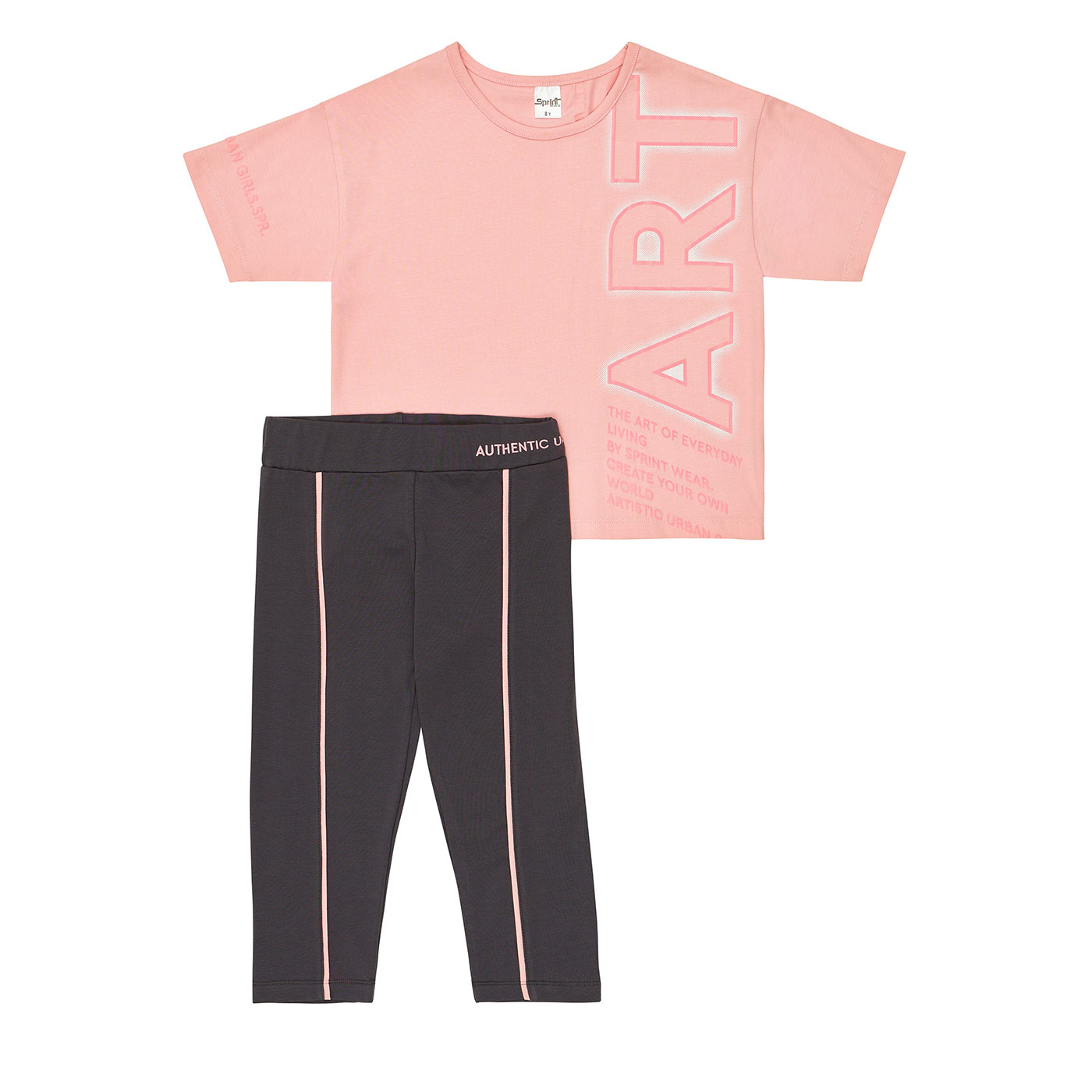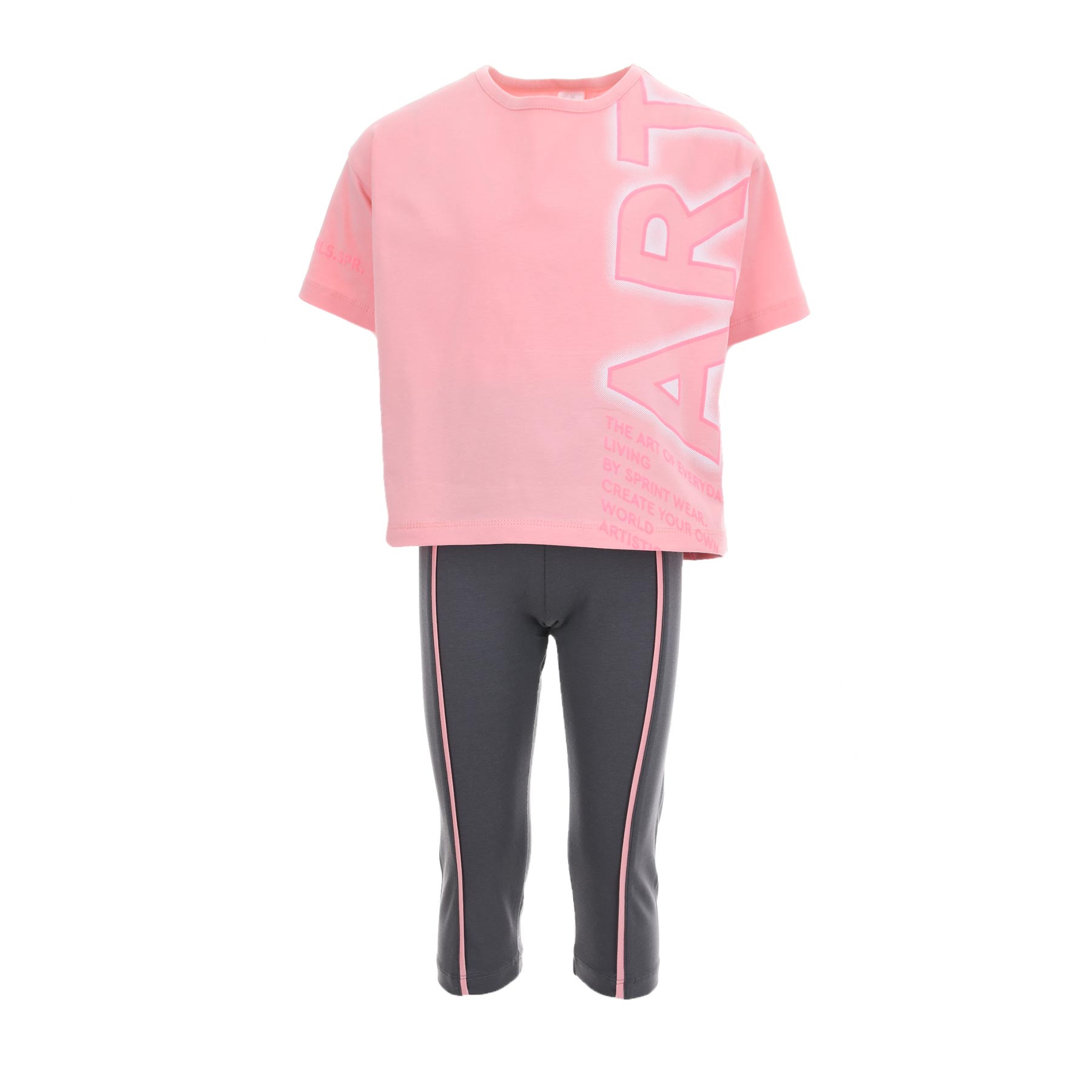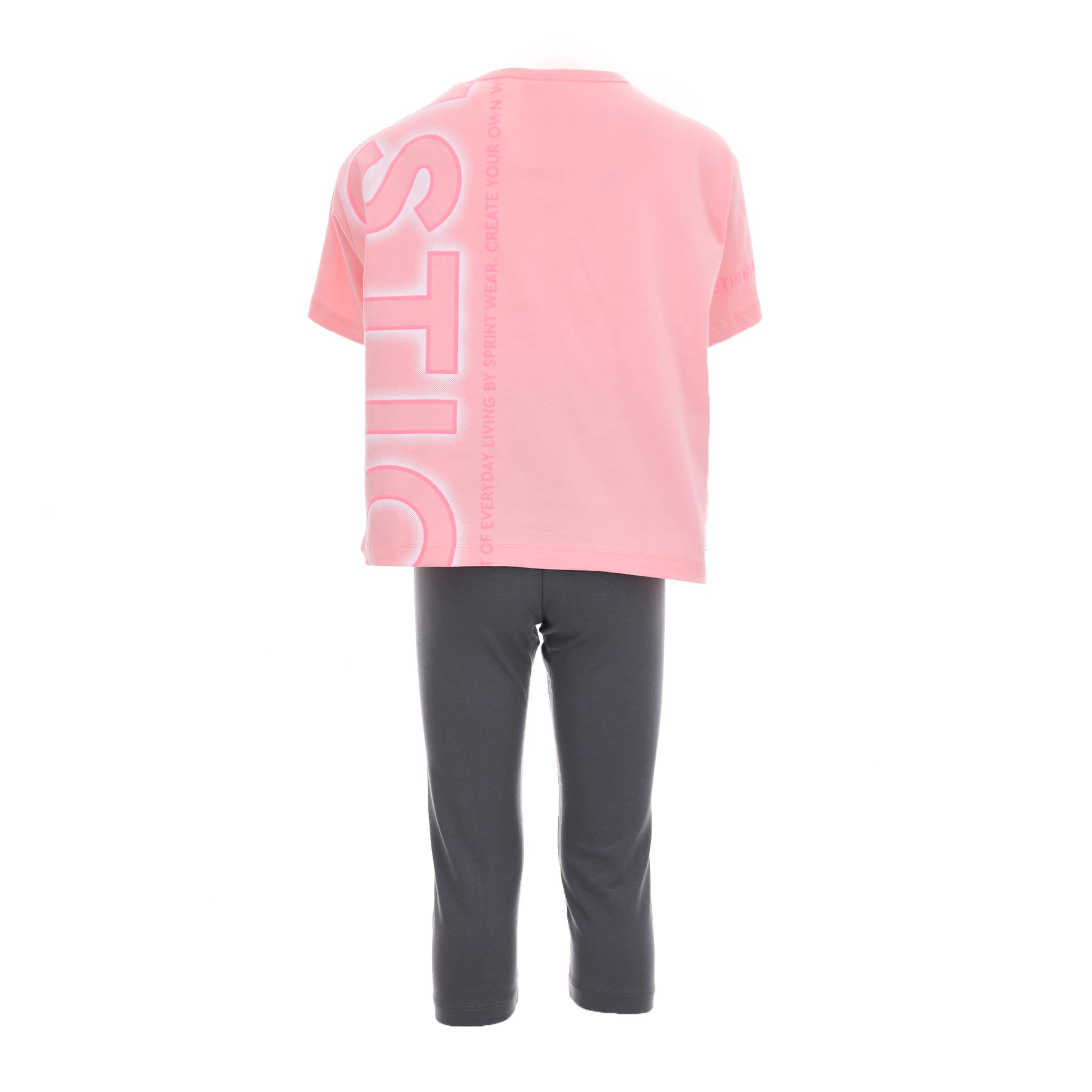 Το παιδικό σετ Sprint σε σομόν- γκρι απόχρωση είναι η ιδανική επιλογή για κορίτσια που αγαπούν την άνεση και το μοντέρνο sporty στυλ. Αποτελείται από κοντομάνικο μπλουζάκι και κολάν κάπρι, σχεδιασμένα για ελευθερία κινήσεων και καθημερινή χρήση.Το t-shirt διαθέτει σύγχρονο print με ροζ λεπτομέρειες που χαρίζουν δυναμικό χαρακτήρα, ενώ το κάπρι κολάν αγκαλιάζει απαλά το σώμα χωρίς να πιέζει. Ένα σετ που φοριέται άνετα στο σχολείο, στη βόλτα ή στις δραστηριότητες.