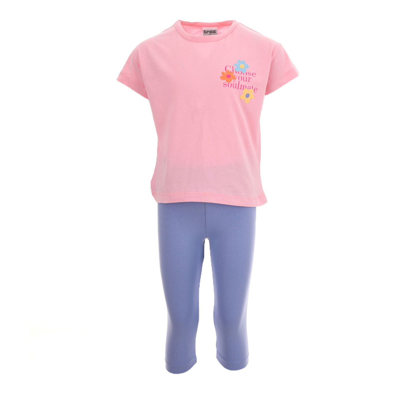 Γλυκό, χαρούμενο και άνετο, το παιδικό σετ Trax ροζ- μωβ είναι ιδανικό για τις καθημερινές καλοκαιρινές εμφανίσεις των κοριτσιών. Ένα μοντέρνο σύνολο 2 τεμαχίων που συνδυάζει απαλά χρώματα, παιχνιδιάρικα σχέδια και άνετη εφαρμογή, προσφέροντας ελευθερία κινήσεων όλη μέρα.Το σετ περιλαμβάνει ροζ κοντομάνικη μπλούζα με χαριτωμένο floral τύπωμα και μήνυμα, καθώς και μωβ κολάν κάπρι που ολοκληρώνει ένα φρέσκο και καλοκαιρινό look. Ιδανική επιλογή για δραστήρια κορίτσια που θέλουν να νιώθουν άνετα και στιλάτα.