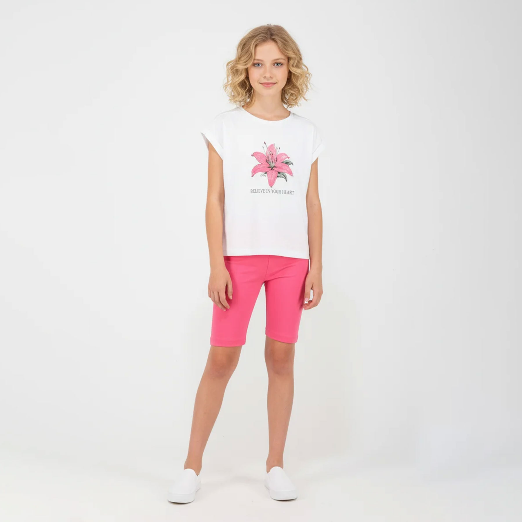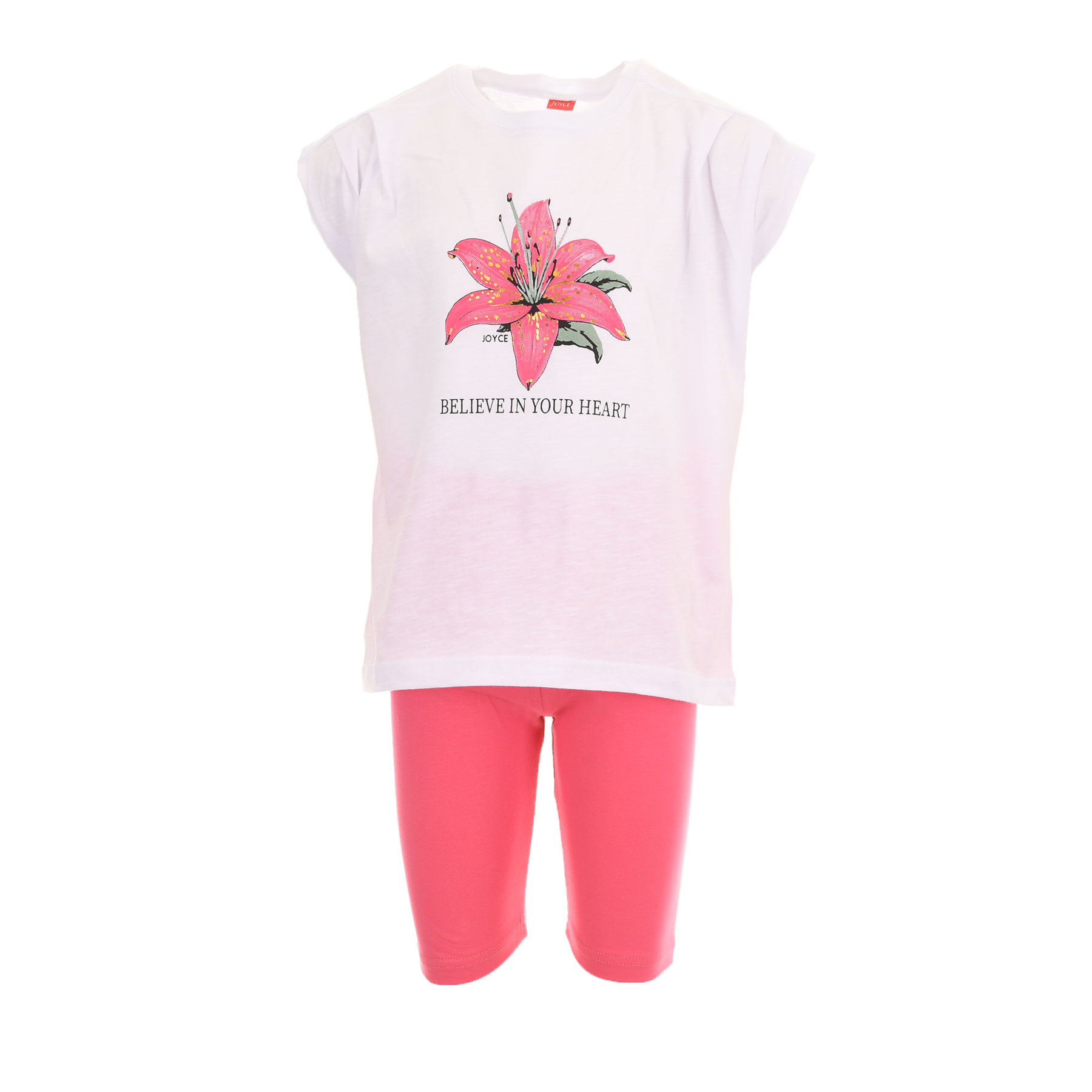 Ένα χαρούμενο και καλοκαιρινό σετ Joyce για κορίτσια που αγαπούν τα χρώματα και την άνεση. Το σετ αποτελείται από λευκό μπλουζάκι με εντυπωσιακό floral τύπωμα και μήνυμα Believe in your heart, συνδυασμένο με φούξια ποδηλατικό κολάν για άνεση και ελευθερία κινήσεων.Ιδανικό για μικρές fashion lovers που θέλουν στυλ χωρίς συμβιβασμούς στην άνεση.