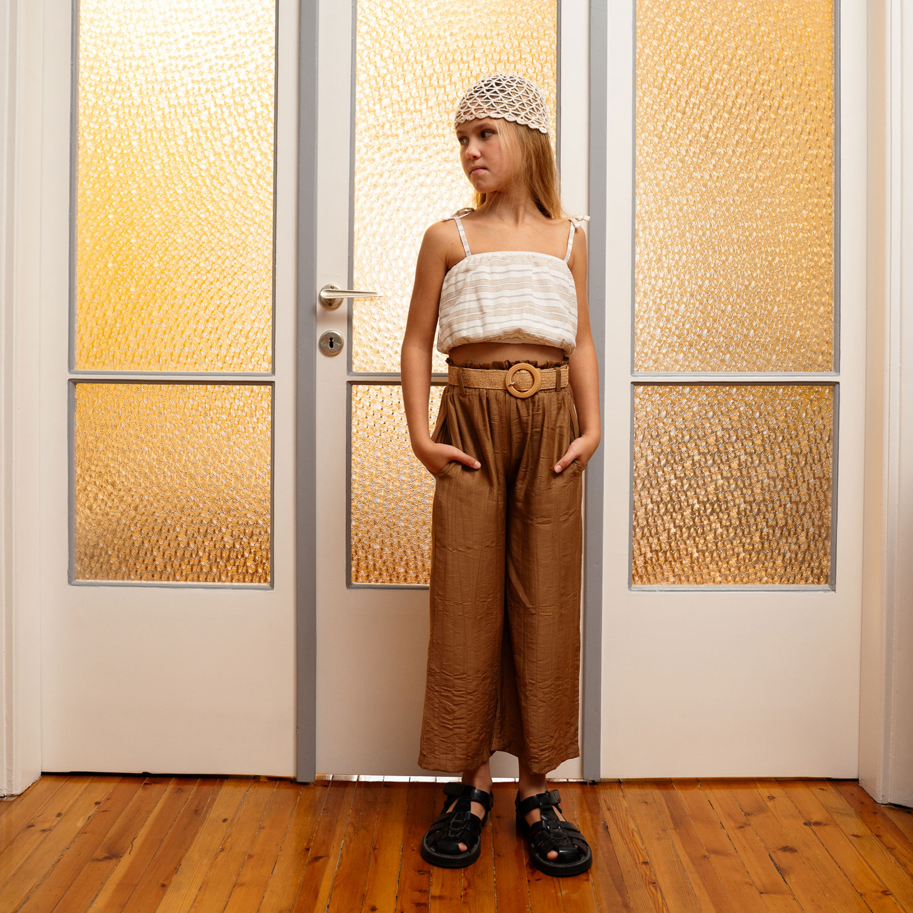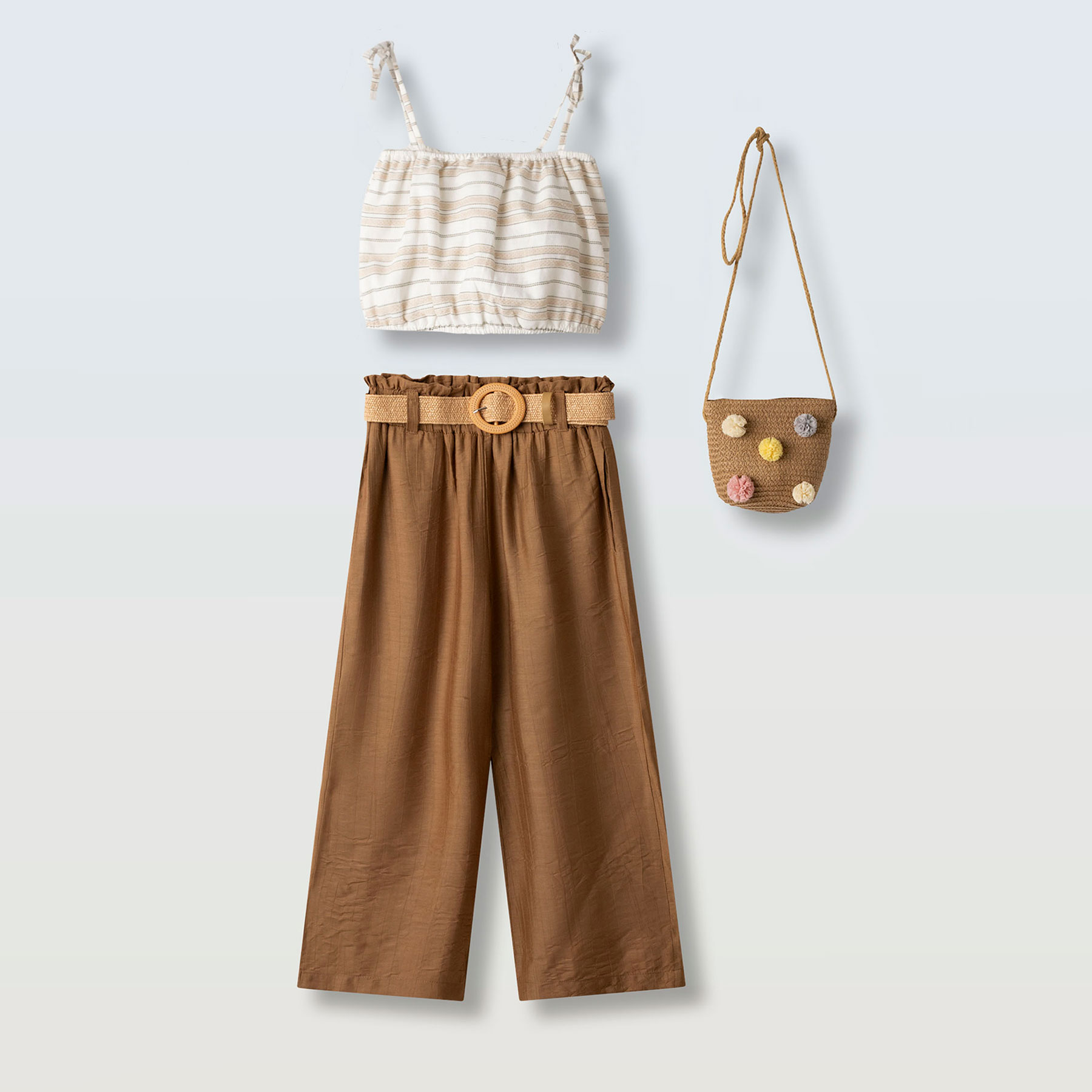 Κομψό, μοντέρνο και ιδανικό για καλοκαιρινές εμφανίσεις, το παιδικό σετ 3 τεμαχίων για κορίτσια Ebita σε μπεζ και καφέ αποχρώσεις αποτελεί μια υπέροχη επιλογή για μικρές fashion lovers. Το σετ περιλαμβάνει ένα ανάλαφρο crop top με λεπτές τιράντες και διακριτικό ριγέ μοτίβο, μία άνετη παντελόνα σε ζεστή καφέ απόχρωση και μία κομψή τσάντα ώμου που ολοκληρώνει το σύνολο.