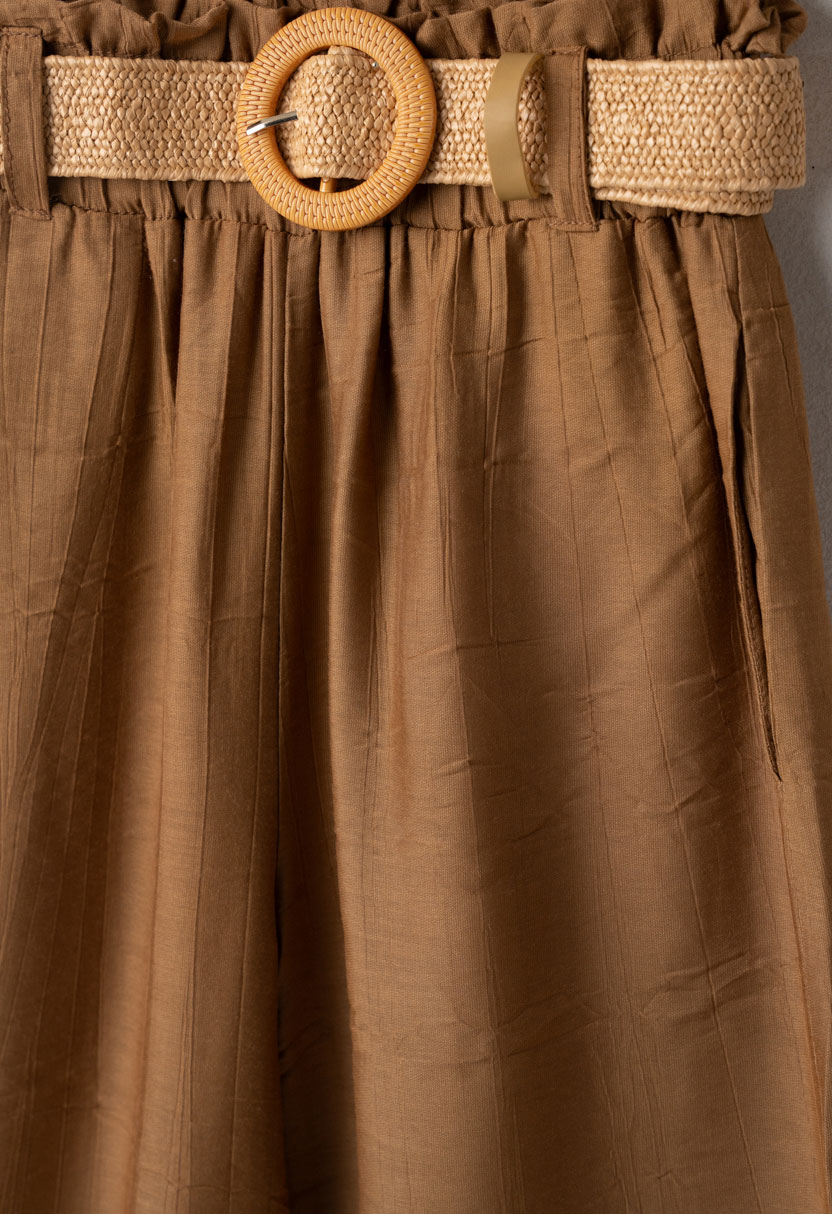 Η παντελόνα διαθέτει ελαστική μέση με διακοσμητική ζώνη και αγκράφα, προσφέροντας άνετη εφαρμογή και στυλ. Το ελαφρύ ύφασμα και η αέρινη γραμμή εξασφαλίζουν δροσερή αίσθηση και ελευθερία κινήσεων, καθιστώντας το ιδανικό για βόλτες, διακοπές και καλοκαιρινές εξόδους.