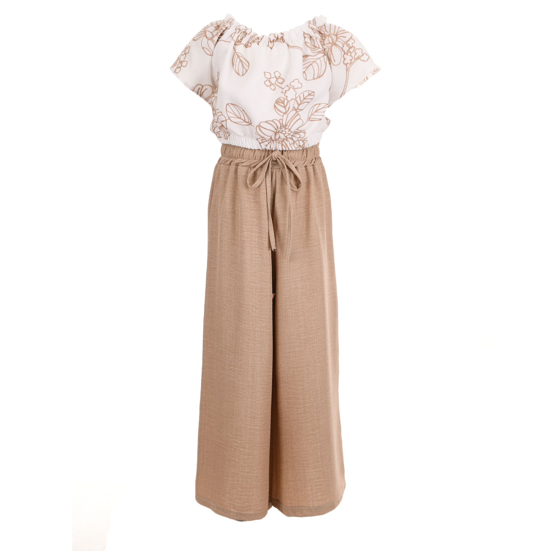 Το σετ είναι κατασκευασμένο από ελαφρύ και αναπνεύσιμο ύφασμα, ιδανικό για άνοιξη και καλοκαίρι. Η φαρδιά γραμμή της παντελόνας και η χαλαρή εφαρμογή του τοπ προσφέρουν άνεση ακόμη και σε πολύωρη χρήση.