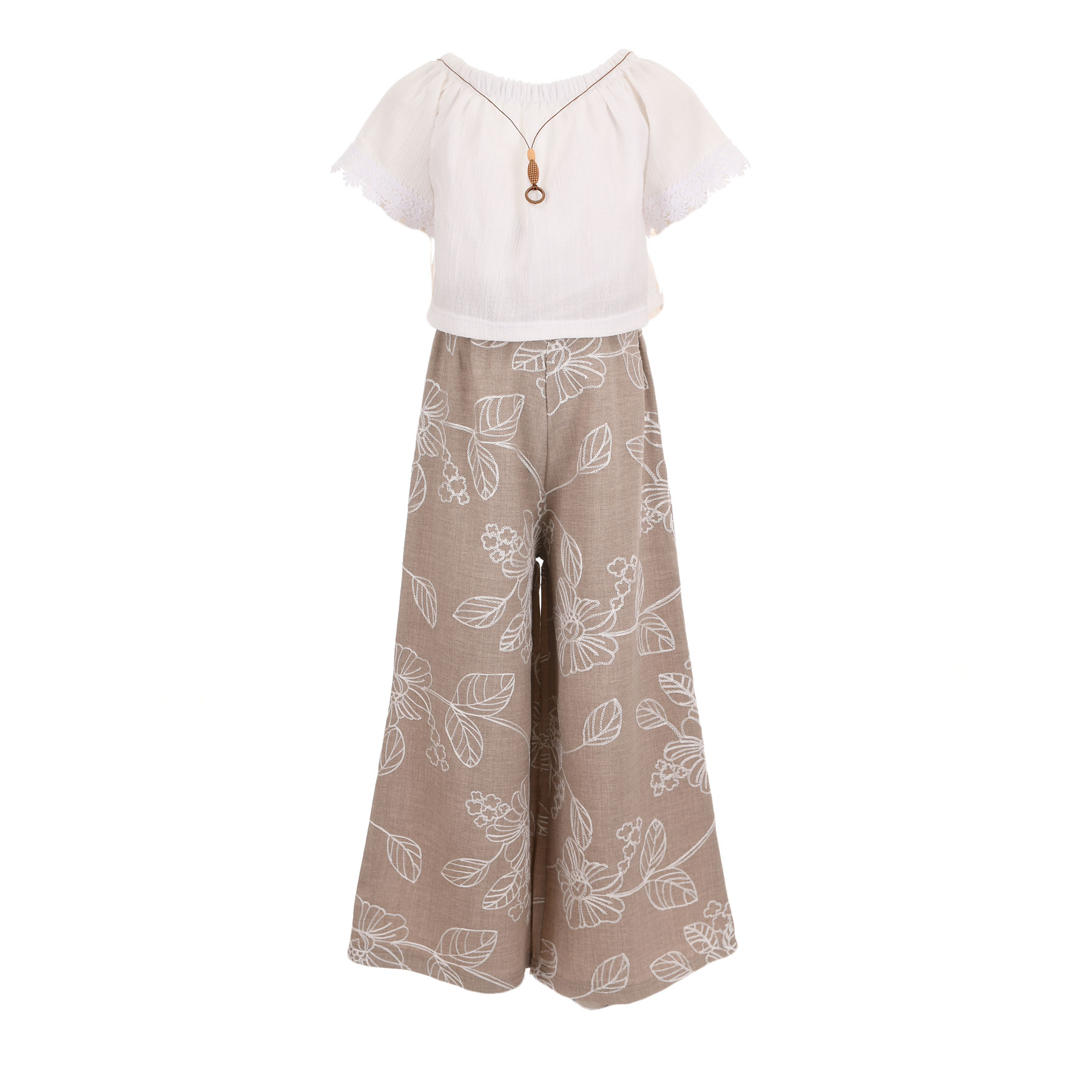 Ρομαντικό, κομψό και απόλυτα καλοκαιρινό, το παιδικό σετ Can Kids σε λευκό και μπεζ απόχρωση είναι η ιδανική επιλογή για κορίτσια που θέλουν να ξεχωρίζουν με διακριτική φινέτσα. Ο συνδυασμός του αέρινου λευκού τοπ με τη φαρδιά παντελόνα σε φυσικό μπεζ με λουλουδάτο μοτίβο δημιουργεί ένα outfit υψηλής αισθητικής, ιδανικό για ιδιαίτερες αλλά και καθημερινές εμφανίσεις.