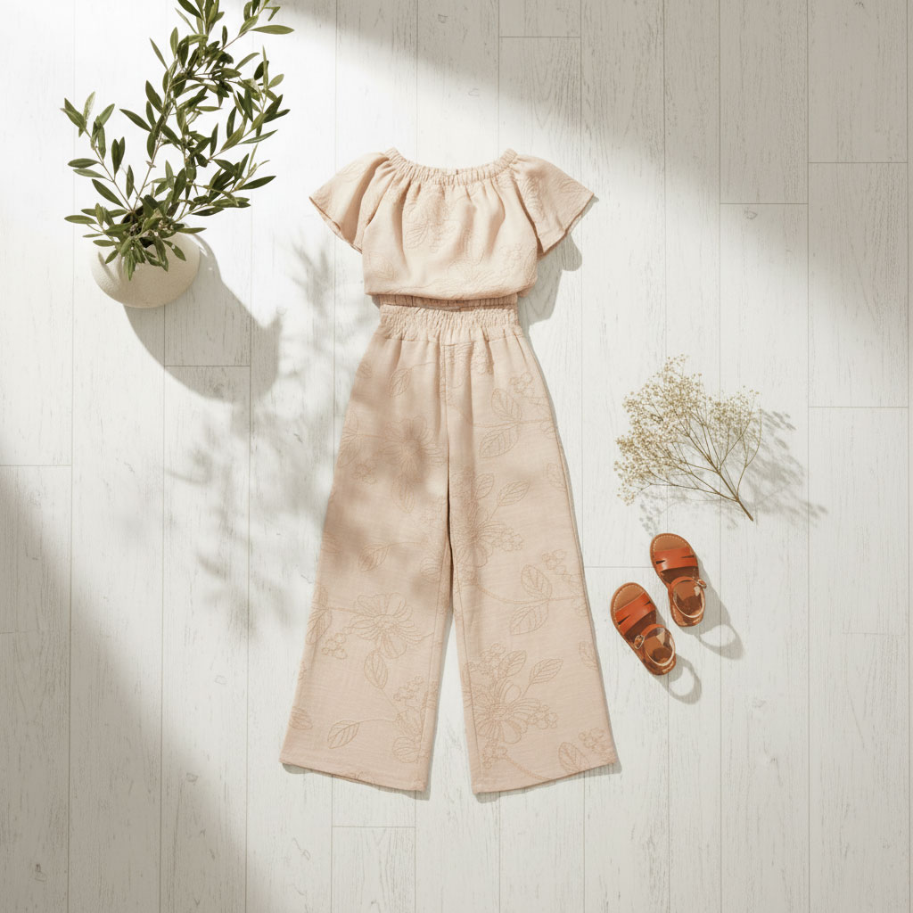 Το σύνολο δημιουργεί ένα μοντέρνο και stylish outfit που μπορεί να φορεθεί τόσο σε καθημερινές βόλτες όσο και σε πιο ιδιαίτερες περιστάσεις, όπως οικογενειακές εξόδους, καλοκαιρινές γιορτές ή διακοπές.