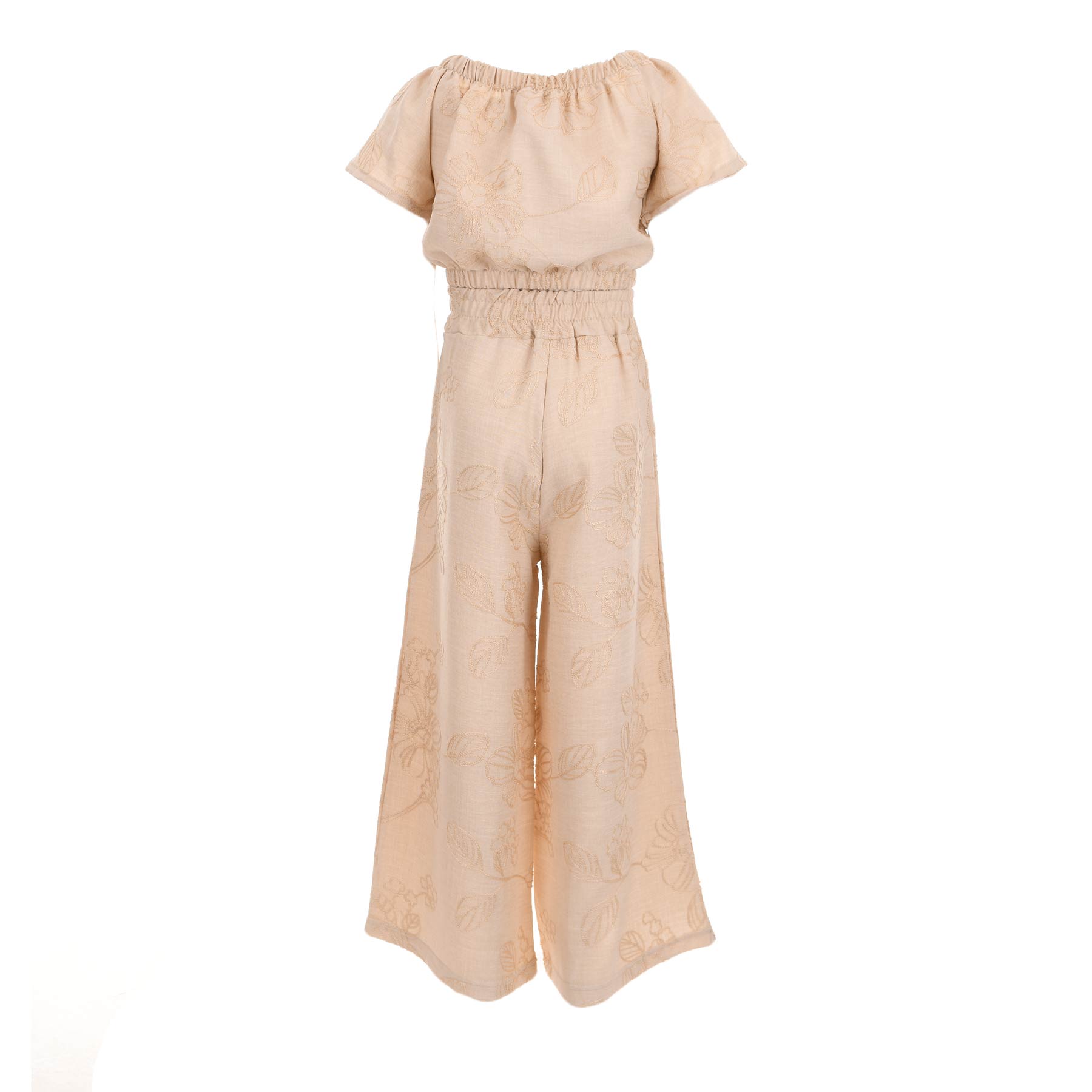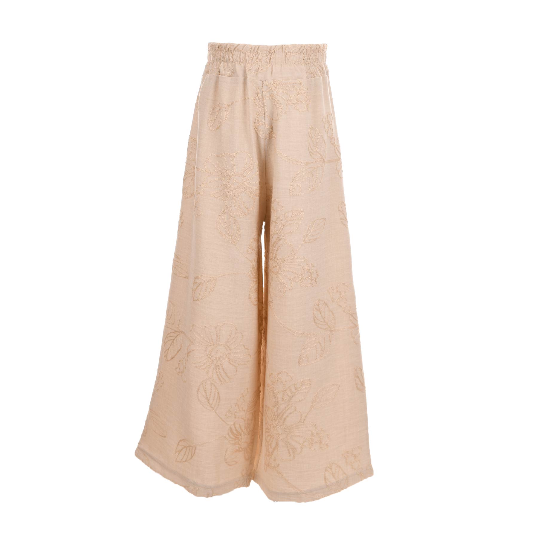 Η παντελόνα σε μπεζ απόχρωση διαθέτει φαρδιά γραμμή και ελαστική μέση για μεγαλύτερη άνεση στην κίνηση, ενώ το διακριτικό κέντημα με floral μοτίβα προσθέτει μια ρομαντική και elegant πινελιά. Το ελαφρύ και δροσερό ύφασμα το καθιστά ιδανική επιλογή για τις ζεστές ημέρες του καλοκαιριού.