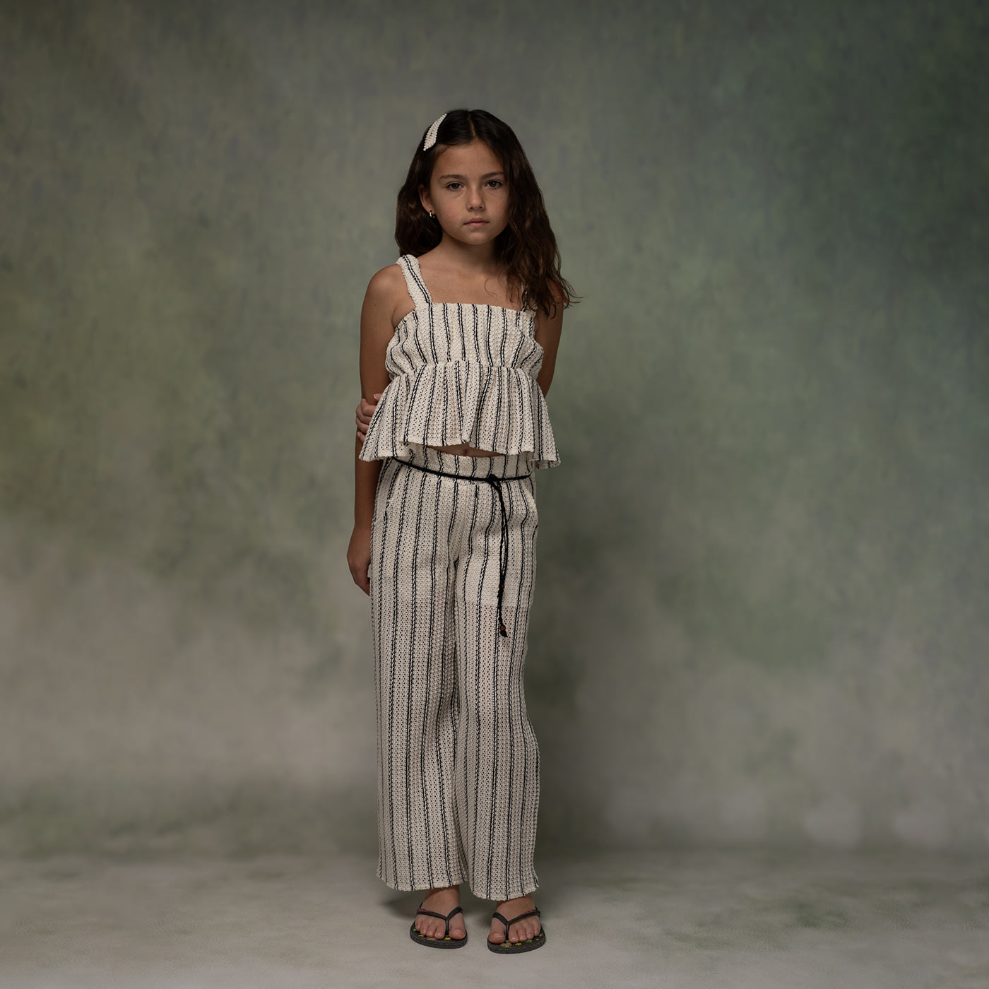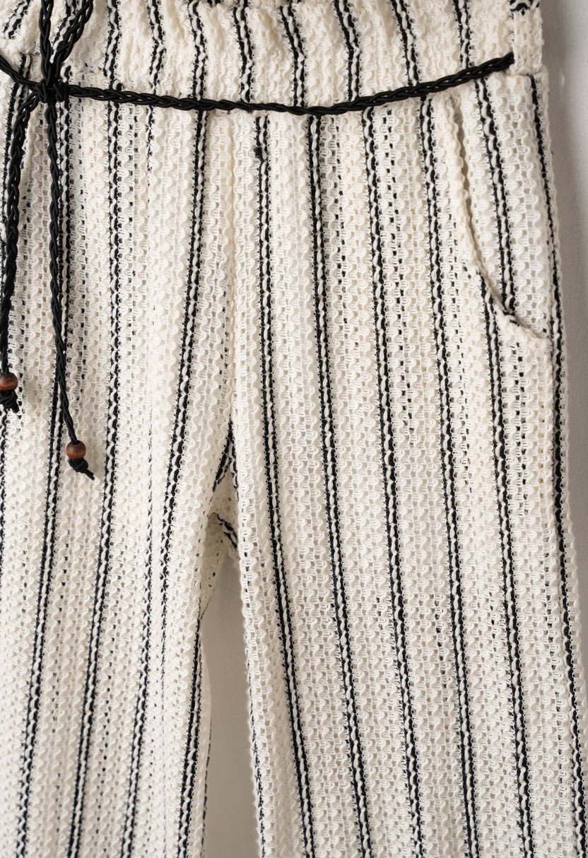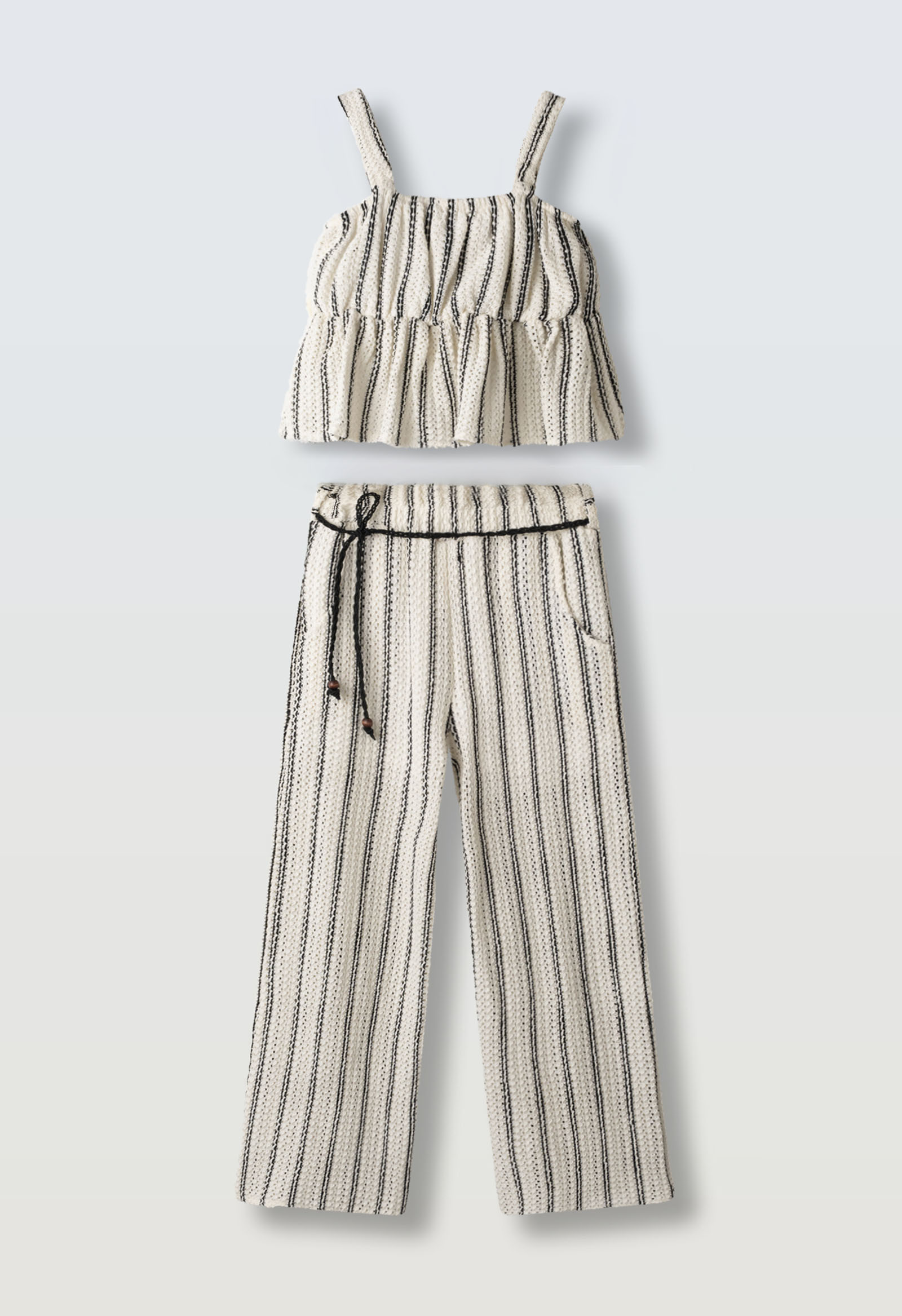Παιδικό καλοκαιρινό σετ για κορίτσια από τη Ebita σε κομψό λευκό-ριγέ σχέδιο, που συνδυάζει αμάνικο τοπ με βολάν και αέρινη παντελόνα. Το ύφασμα με ανάγλυφη υφή είναι ελαφρύ και δροσερό, ιδανικό για τις ζεστές ημέρες, ενώ οι κάθετες ρίγες προσθέτουν στυλ και διαχρονική κομψότητα.Η παντελόνα διαθέτει άνετη εφαρμογή με ελαστική μέση και διακοσμητικό κορδόνι με χάντρες, προσφέροντας σταθερό κράτημα χωρίς πίεση. Το σετ επιτρέπει ελευθερία κινήσεων και αποτελεί ιδανική επιλογή για βόλτες, γιορτές, διακοπές και ιδιαίτερες καλοκαιρινές εμφανίσεις. Συνδυάζεται εύκολα με σανδάλια ή sneakers για ολοκληρωμένο fashion look.