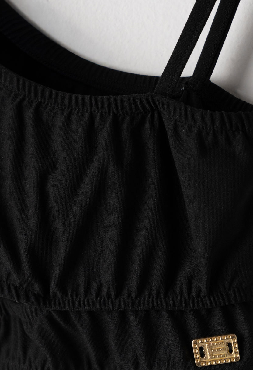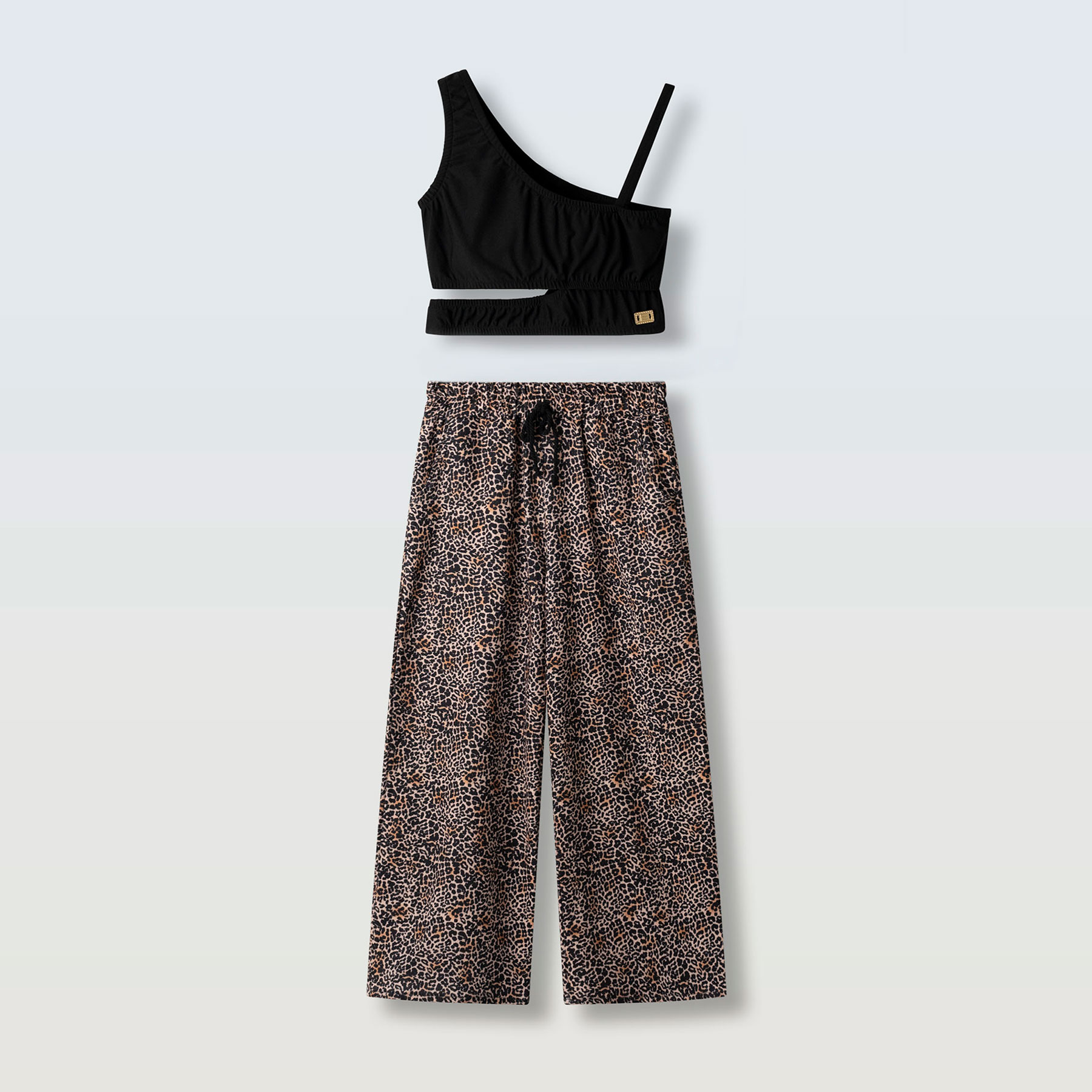 Μοντέρνο, εντυπωσιακό και γεμάτο στυλ, το παιδικό σετ με παντελόνα για κορίτσια Ebita σε μαύρο και animal print είναι ιδανικό για μικρές fashion lovers που θέλουν να ξεχωρίζουν. Το σετ αποτελείται από κομψό τοπ με ιδιαίτερο ασύμμετρο σχεδιασμό και μία λεπτή τιράντα, δημιουργώντας μια μοντέρνα και δυναμική εμφάνιση.