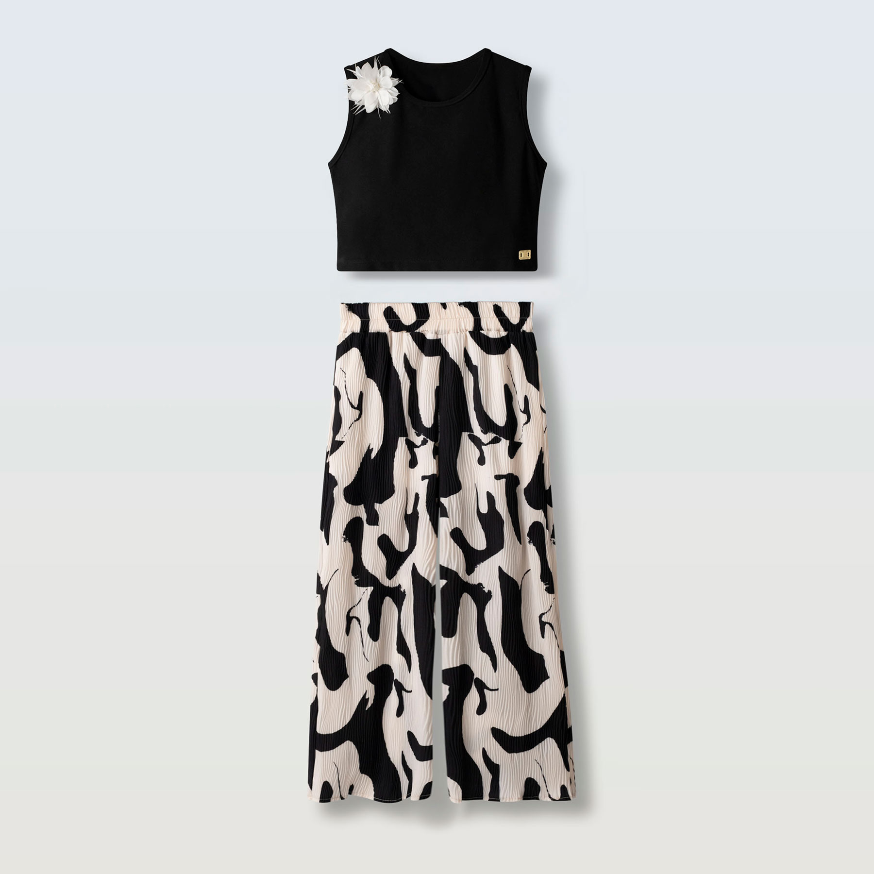 Ανανεώστε την καλοκαιρινή γκαρνταρόμπα των μικρών fashion lovers με το κομψό παιδικό σετ με παντελόνα για κορίτσια Ebita σε διαχρονικό μαύρο-ασπρόμαυρο συνδυασμό. Το σετ αποτελείται από μοντέρνα αμάνικη μπλούζα σε μαύρο χρώμα με διακριτικό διακοσμητικό λουλούδι στον ώμο και εντυπωσιακή παντελόνα με ασπρόμαυρο μοτίβο που χαρίζει μοναδικό στυλ και κίνηση.