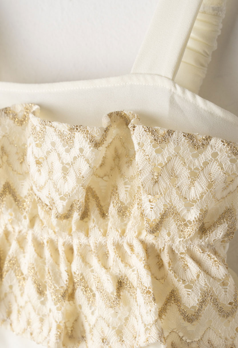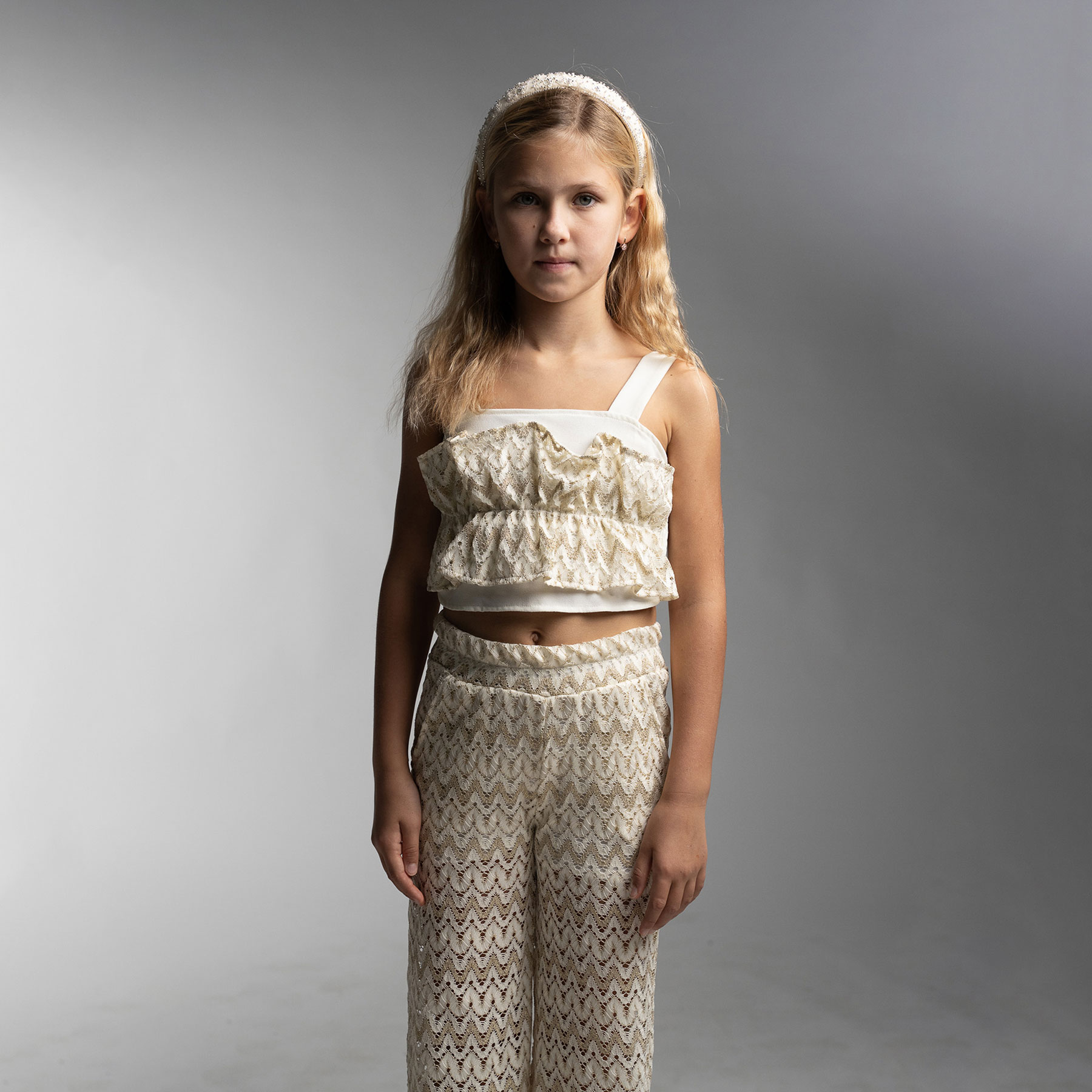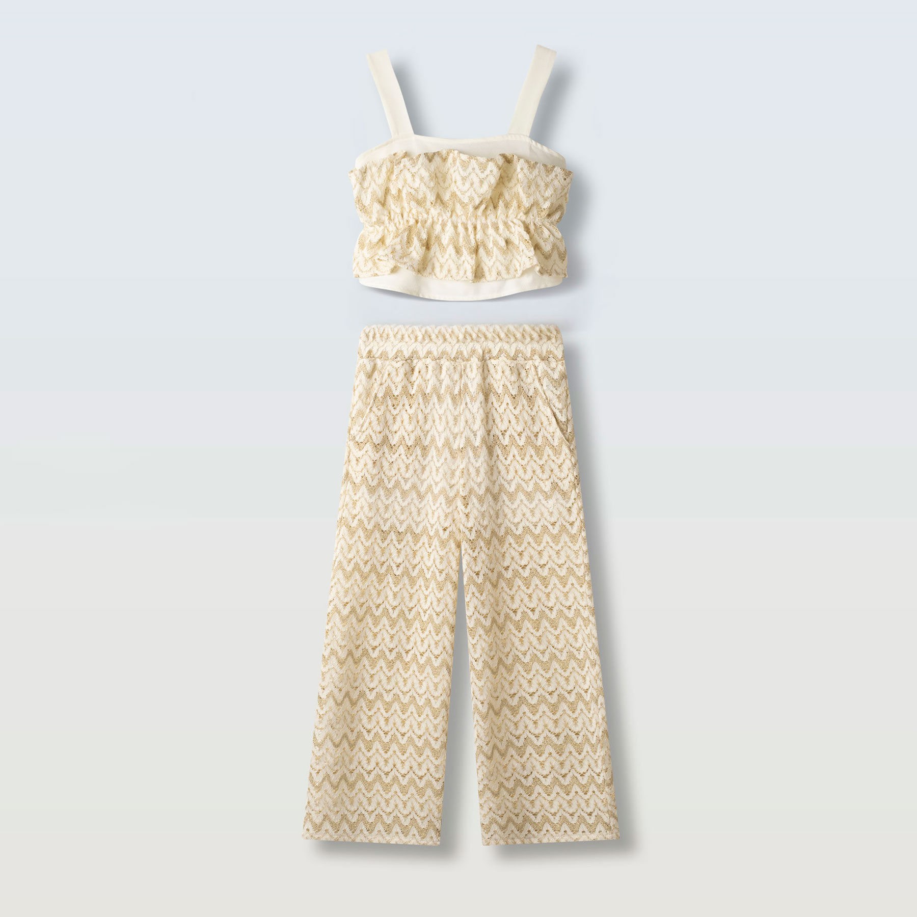 Λαμπερό, κομψό και ξεχωριστό, το παιδικό σετ με παντελόνα για κορίτσια Ebita σε χρυσή απόχρωση είναι η ιδανική επιλογή για εντυπωσιακές καλοκαιρινές εμφανίσεις. Το σετ αποτελείται από μοντέρνο crop top με φαρδιές τιράντες και κομψό βολάν στο μπροστινό μέρος, δημιουργώντας ένα φίνο και κοριτσίστικο στυλ.