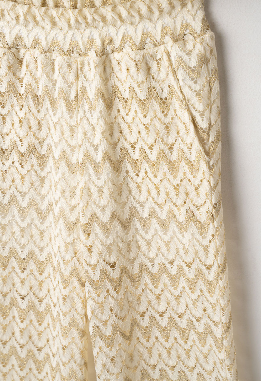 Η παντελόνα διαθέτει άνετη ελαστική μέση και αέρινη γραμμή που προσφέρει ελευθερία κινήσεων και άνεση όλη την ημέρα. Το ιδιαίτερο χρυσό μοτίβο προσδίδει μια elegant και φωτεινή αισθητική, ιδανική για καλοκαιρινές εκδηλώσεις, γιορτές ή ξεχωριστές εμφανίσεις.