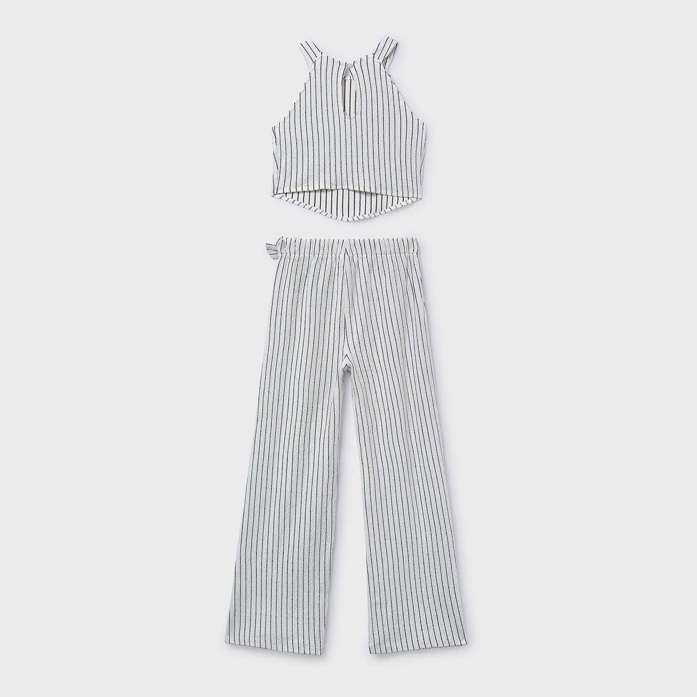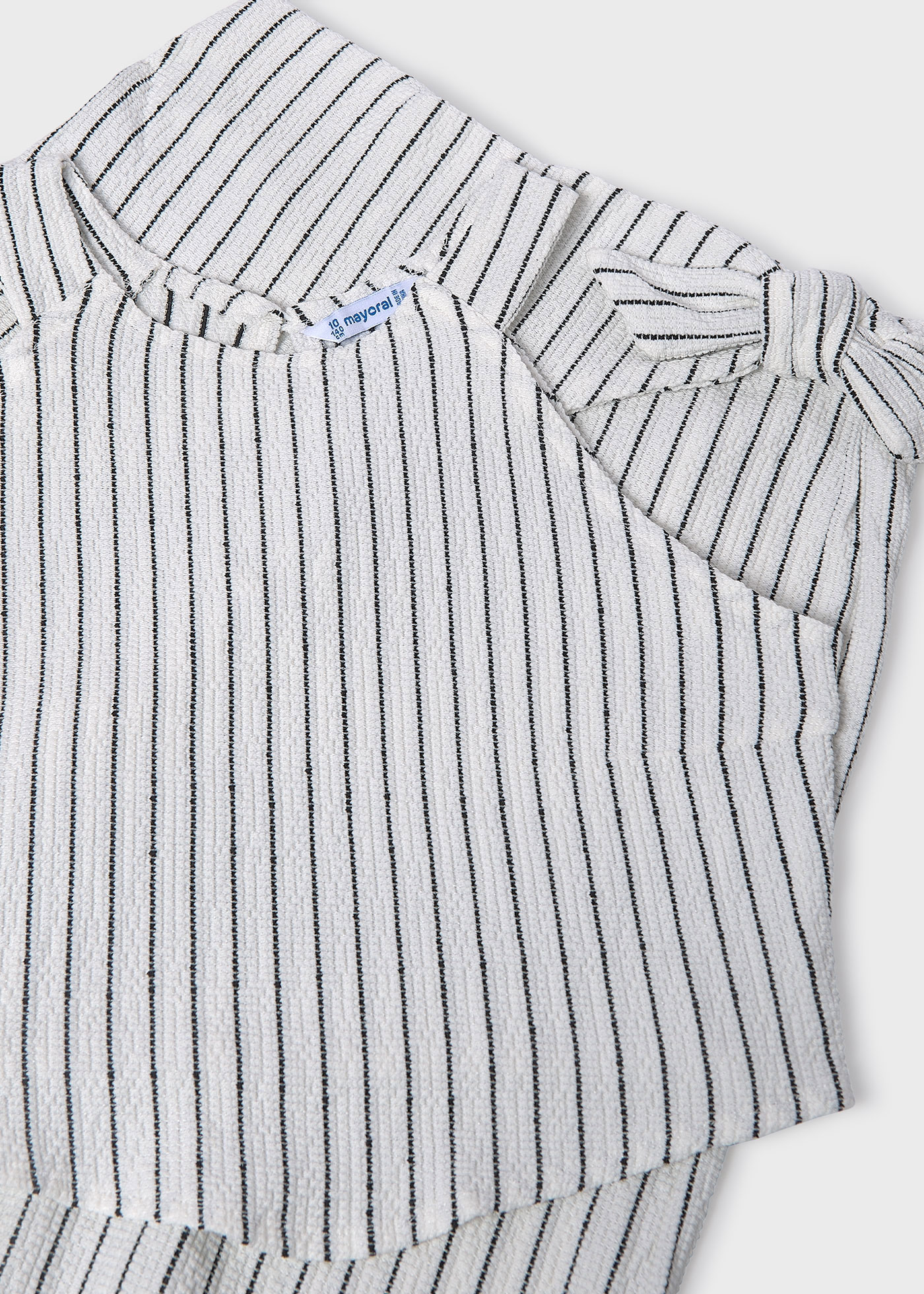 Κομψό και δροσερό καλοκαιρινό σύνολο από τη Mayoral, ιδανικό για μικρές δεσποινίδες που αγαπούν το στυλ και την άνεση. Το παιδικό σετ περιλαμβάνει ριγέ αμάνικο τοπ και ασορτί παντελόνα σε εκρού βάση με λεπτές μαύρες ρίγες, δημιουργώντας ένα διαχρονικό και μοντέρνο look.