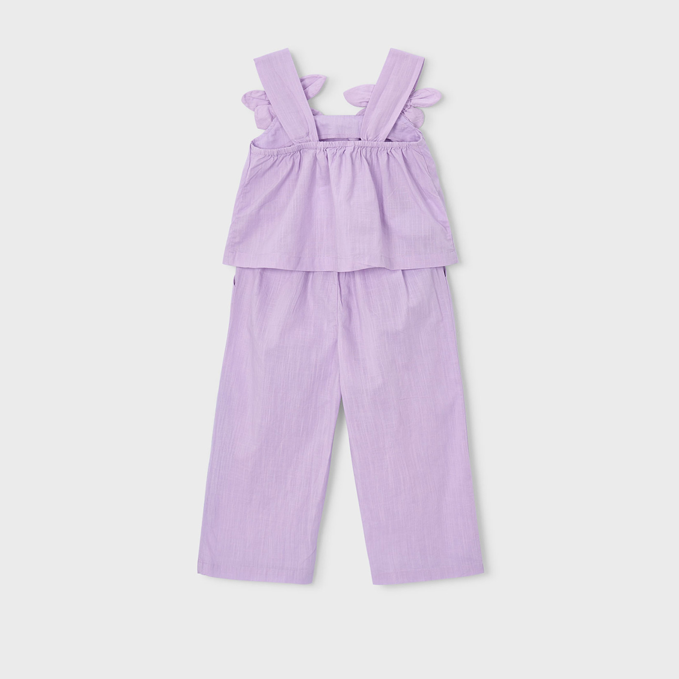 Το παιδικό σετ Mayoral σε λιλά απόχρωση είναι η ιδανική επιλογή για κορίτσια που αγαπούν το χρώμα, την άνεση και το μοντέρνο στυλ. Αποτελείται από αέρινο τοπ με τιράντες και διακοσμητικά λουλούδια στους ώμους, καθώς και παντελόνα με άνετη εφαρμογή, προσφέροντας ένα ολοκληρωμένο και καλοκαιρινό outfit για κάθε περίσταση.Το ελαφρύ και δροσερό ύφασμα εξασφαλίζει άνεση καθ όλη τη διάρκεια της ημέρας, ενώ η λιλά απόχρωση χαρίζει ζωντάνια και παιχνιδιάρικη διάθεση. Ο ιδιαίτερος σχεδιασμός με τα υφασμάτινα λουλούδια προσθέτει μια ξεχωριστή, κοριτσίστικη πινελιά που κάνει το σύνολο να ξεχωρίζει.Ιδανικό για καλοκαιρινές βόλτες, διακοπές, γιορτές ή καθημερινές εμφανίσεις με στυλ, το παιδικό σετ με παντελόνα Mayoral συνδυάζεται εύκολα με πέδιλα, sneakers ή μπαλαρίνες.