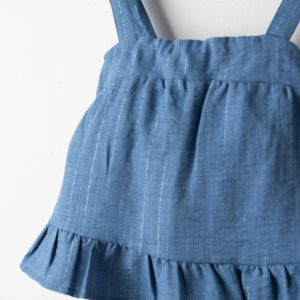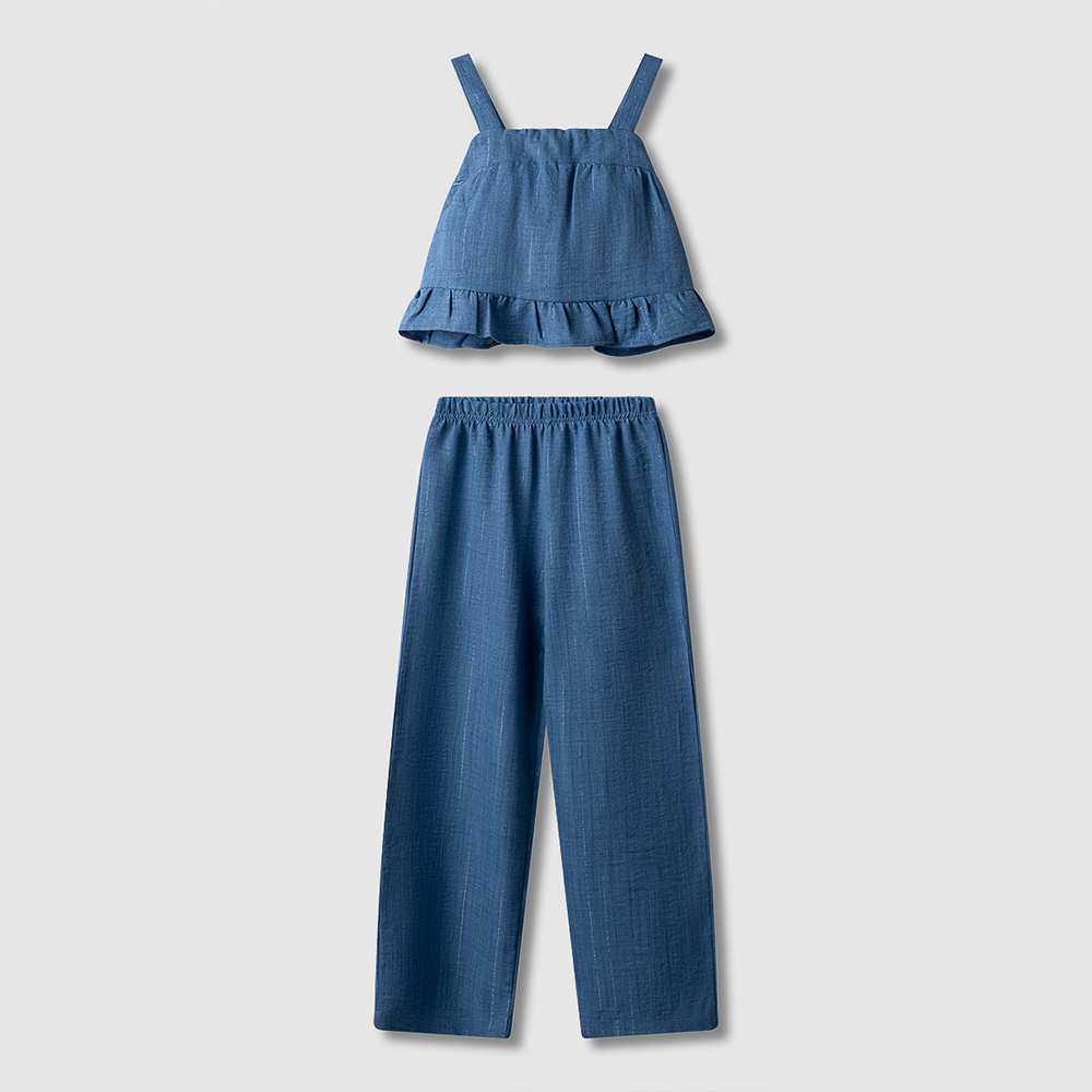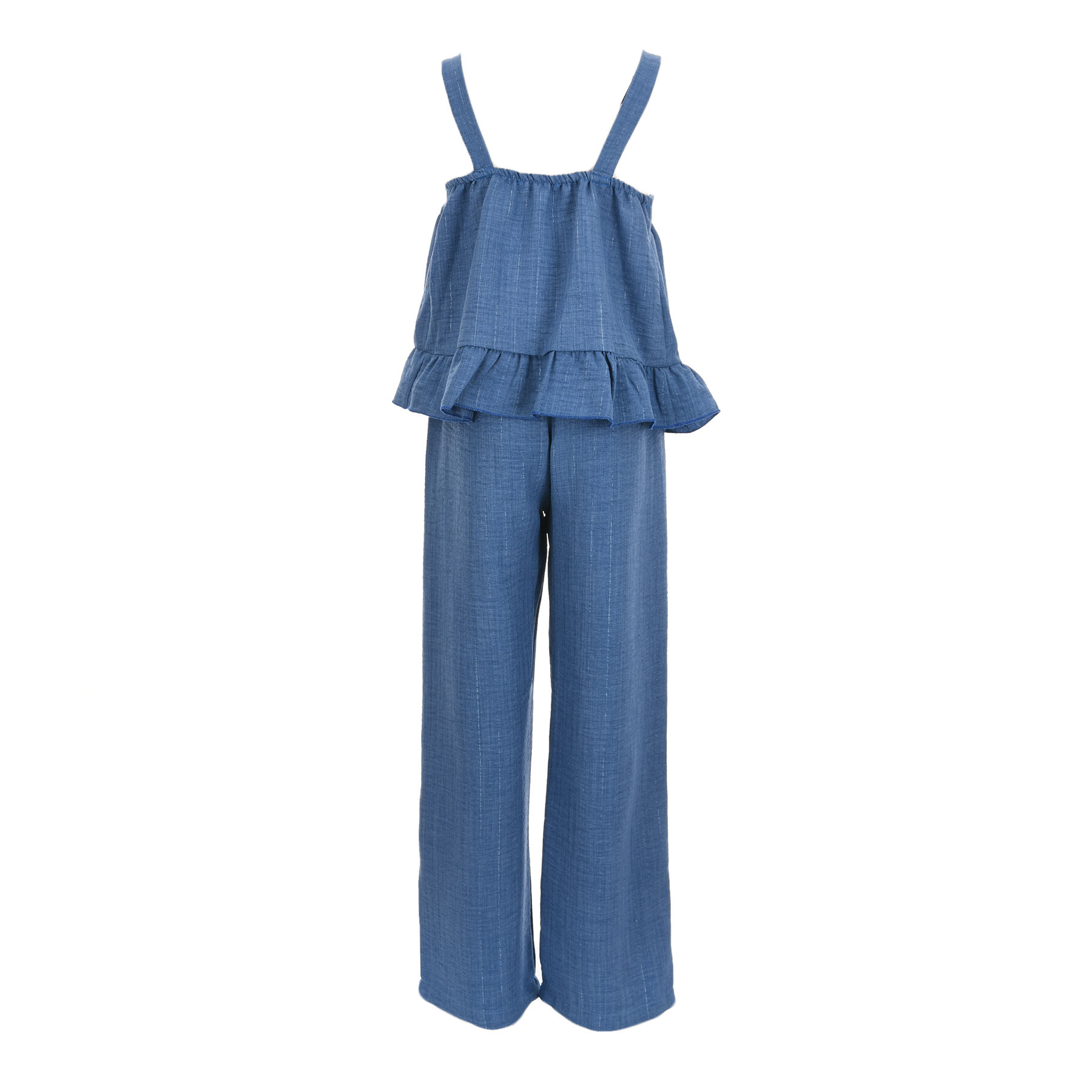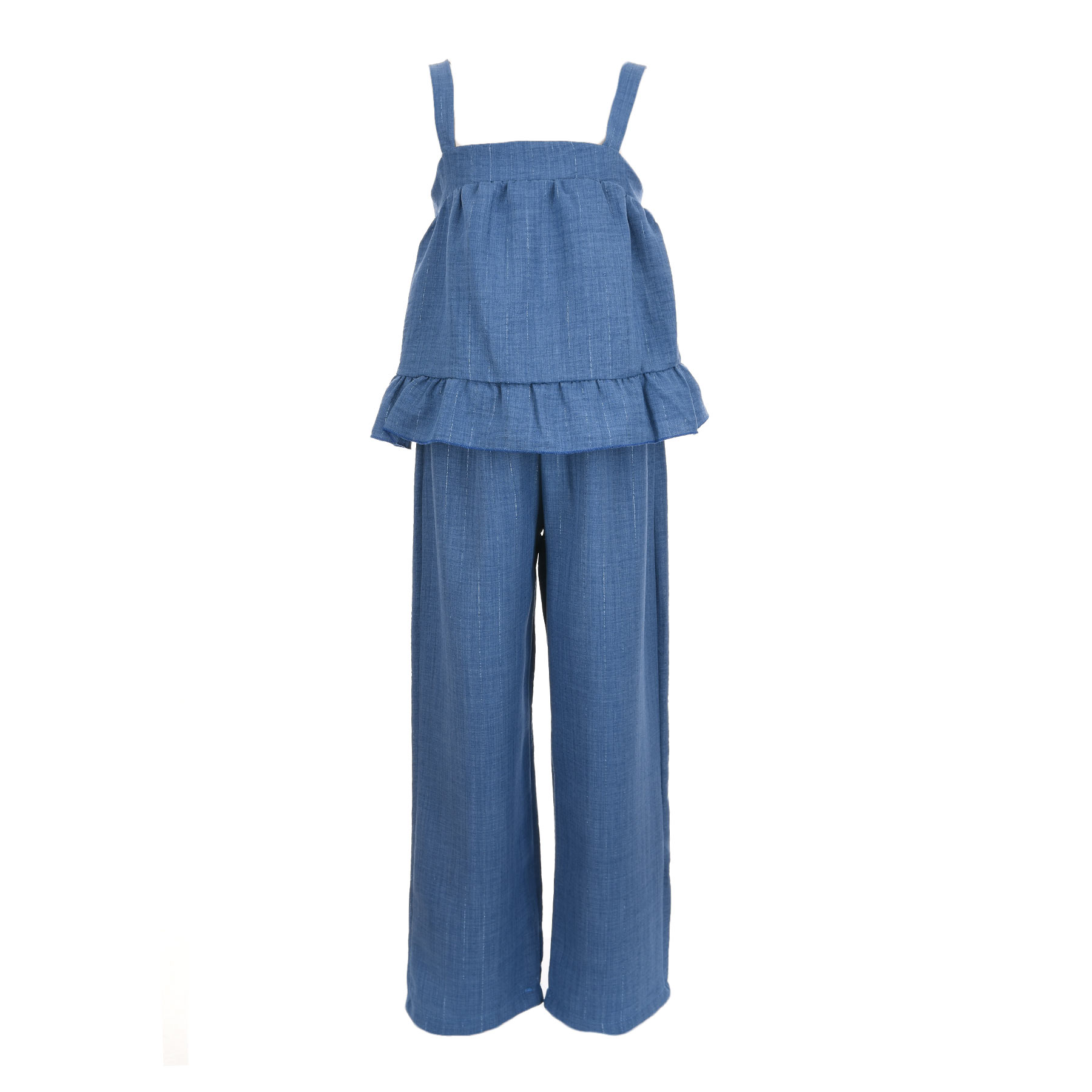 Ανανεώστε το καλοκαιρινό στυλ της μικρής σας με το κομψό και άνετο παιδικό σετ Nekidswear σε μπλε απόχρωση τύπου τζιν. Ένα μοντέρνο σύνολο που συνδυάζει θηλυκότητα και πρακτικότητα, ιδανικό για καθημερινές αλλά και πιο ιδιαίτερες εμφανίσεις.Το σετ αποτελείται από αμάνικο τοπ με τιράντες και διακριτικό βολάν στο τελείωμα, που χαρίζει ρομαντική πινελιά, καθώς και άνετη παντελόνα σε φαρδιά γραμμή για ελευθερία κινήσεων. Το ύφασμα τύπου τζιν προσφέρει casual χαρακτήρα, ενώ η ελαφριά υφή του το καθιστά ιδανικό για άνοιξη και καλοκαίρι.