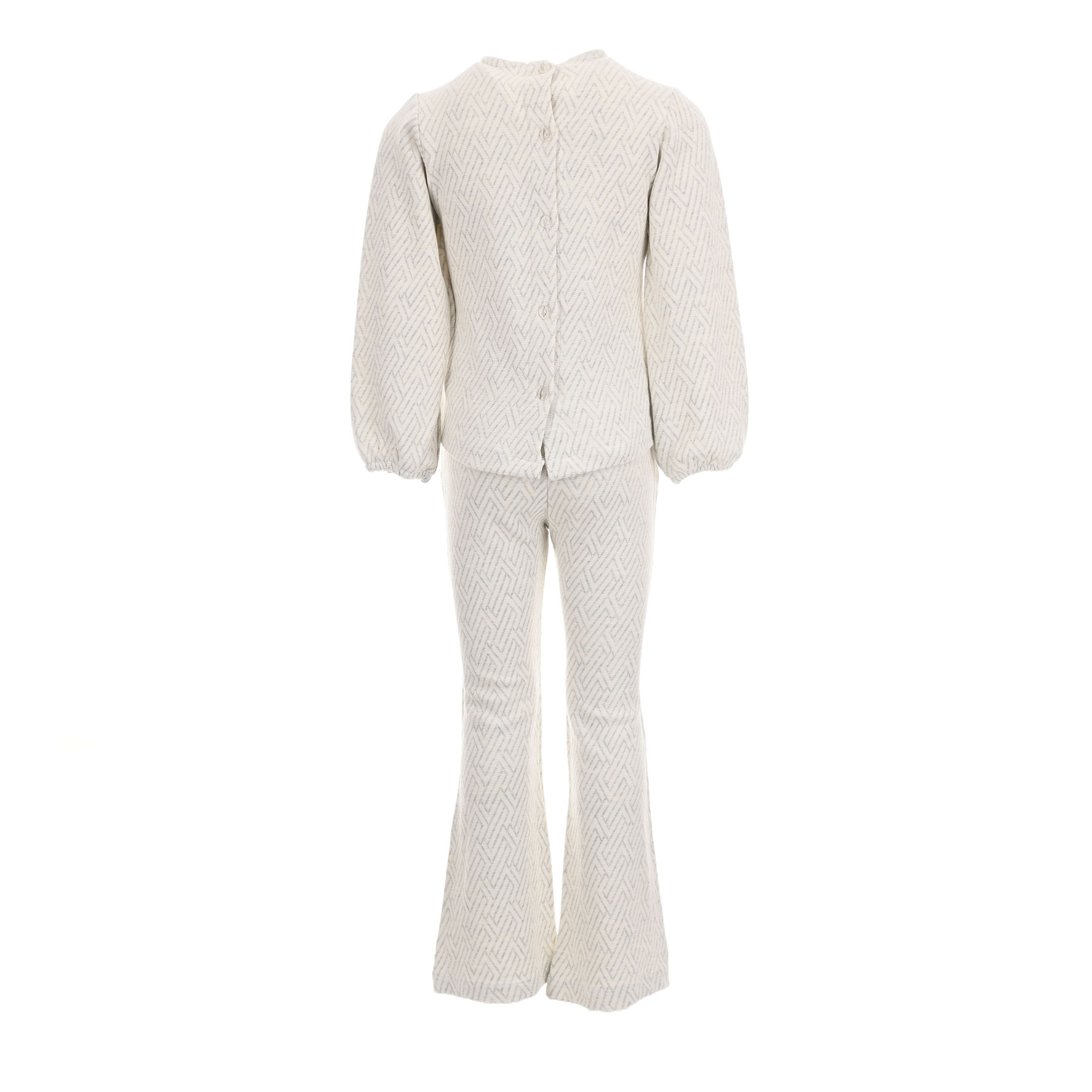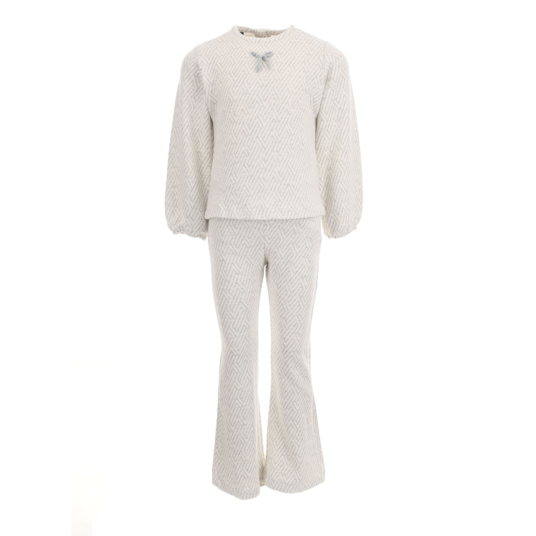 Ανανεώστε τη χειμερινή γκαρνταρόμπα της μικρής σας με αυτό το κομψό παιδικό σετ με παντελόνα για κορίτσια Restart σε εκρού χρώμα. Το σετ αποτελείται από μακρυμάνικο μπλουζάκι με διακριτικό ανάγλυφο μοτίβο και φιόγκο στο λαιμό, που προσδίδει ρομαντική και φινετσάτη νότα. Η ασορτί παντελόνα με καμπάνα ολοκληρώνει το outfit, προσφέροντας άνεση και στυλ σε κάθε περίσταση.