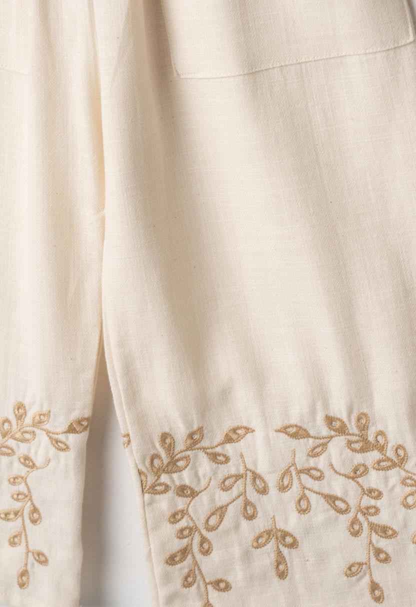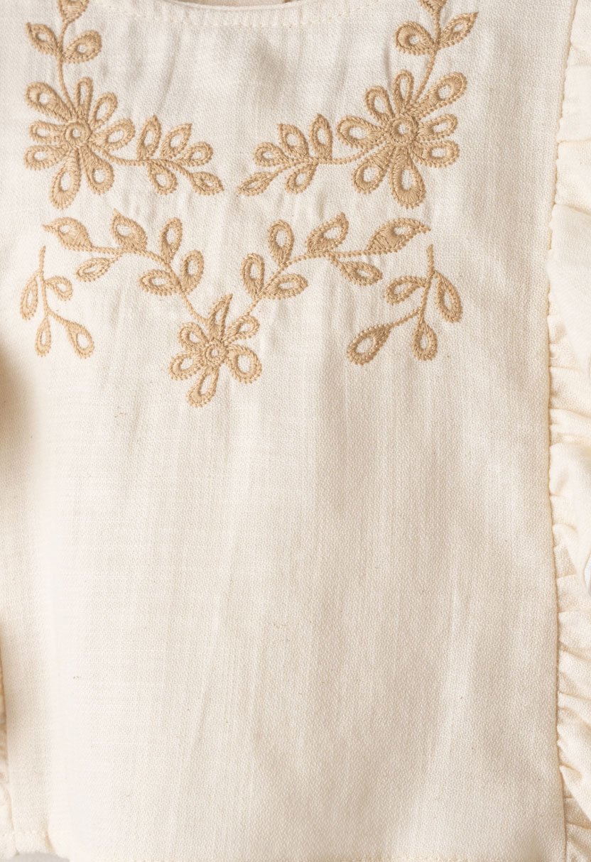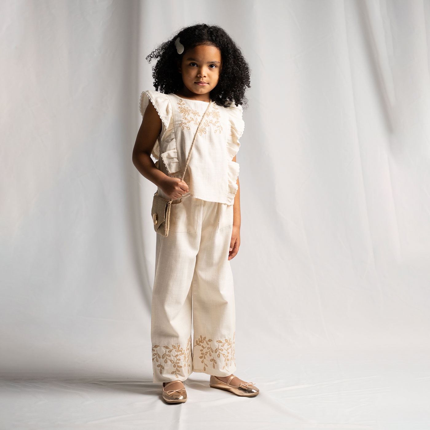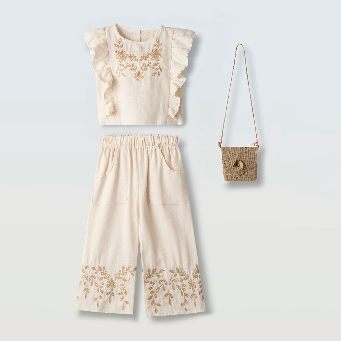 Το παιδικό σετ Ebita σε μπεζ λινό ύφασμα αποτελεί μια κομψή και φυσική επιλογή για καλοκαιρινές εμφανίσεις με διακριτική πολυτέλεια. Ο συνδυασμός του αέρινου τοπ με τη φαρδιά λινή παντελόνα δημιουργεί ένα άνετο και εκλεπτυσμένο σύνολο, ιδανικό για ιδιαίτερες περιστάσεις αλλά και προσεγμένες καθημερινές εμφανίσεις.Το αμάνικο τοπ διαθέτει ρομαντικά βολάν στα μανίκια και διακριτικό κέντημα στο μπροστινό μέρος, προσθέτοντας girly χαρακτήρα και κομψότητα. Η λινή υφή του υφάσματος προσφέρει δροσερή αίσθηση και φυσική εφαρμογή, ιδανική για ζεστές ημέρες.Η παντελόνα σε φαρδιά γραμμή με ελαστική μέση εξασφαλίζει άνεση και ελευθερία κινήσεων, ενώ το διακοσμητικό κέντημα στο τελείωμα ολοκληρώνει αρμονικά το σύνολο. Το σετ συνοδεύεται από τσαντάκι ώμου σε φυσική υφή, προσθέτοντας πρακτικότητα και στυλ.