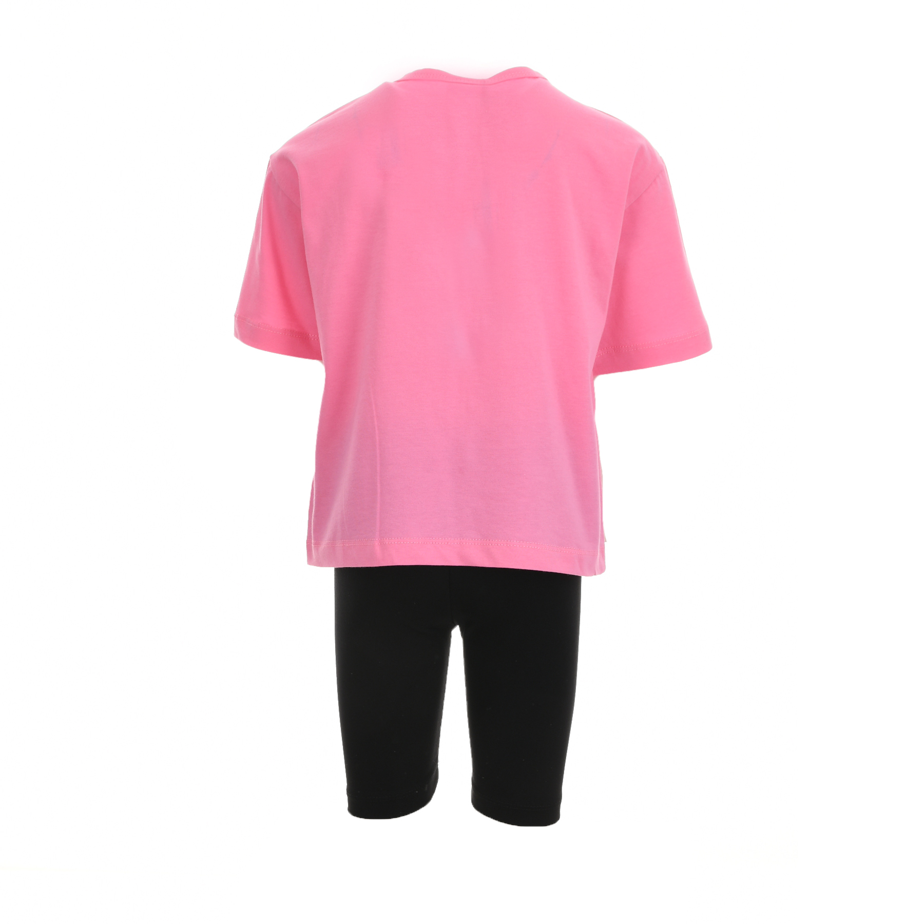 Η κοντομάνικη μπλούζα σε έντονο ροζ με statement print Malibu Playground δίνει δυναμικό χαρακτήρα, ενώ το μαύρο ποδηλατικό κολάν προσφέρει άψογη εφαρμογή και ελευθερία κινήσεων όλη μέρα.