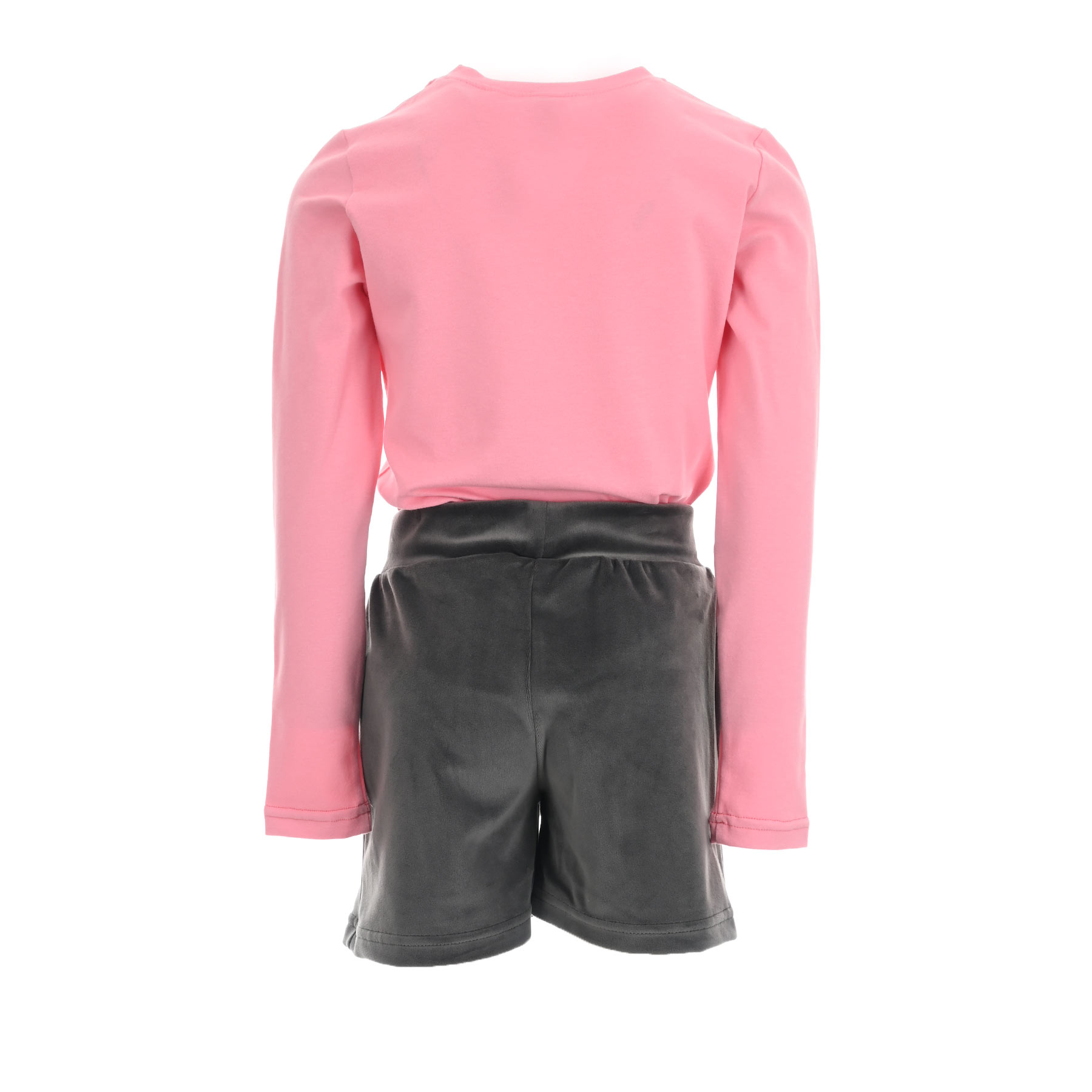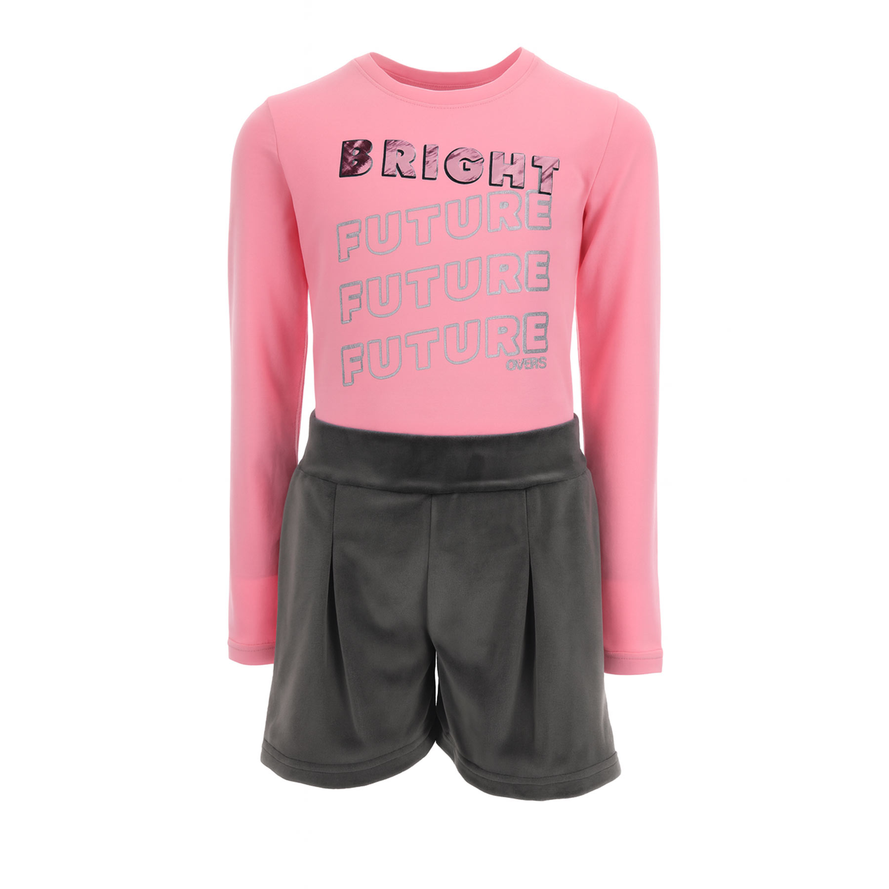 Ένα εντυπωσιακό και μοντέρνο σετ για κορίτσια από τη Joyce, ιδανικό για κάθε στιγμή της ημέρας. Το σετ περιλαμβάνει μπλούζα μακρυμάνικη σε απαλό ροζ χρώμα με μοντέρνο τύπωμα BRIGHT FUTURE, που χαρίζει θετική ενέργεια και στυλ, και σορτς από μαλακό βελουτέ ύφασμα σε ανθρακί απόχρωση.