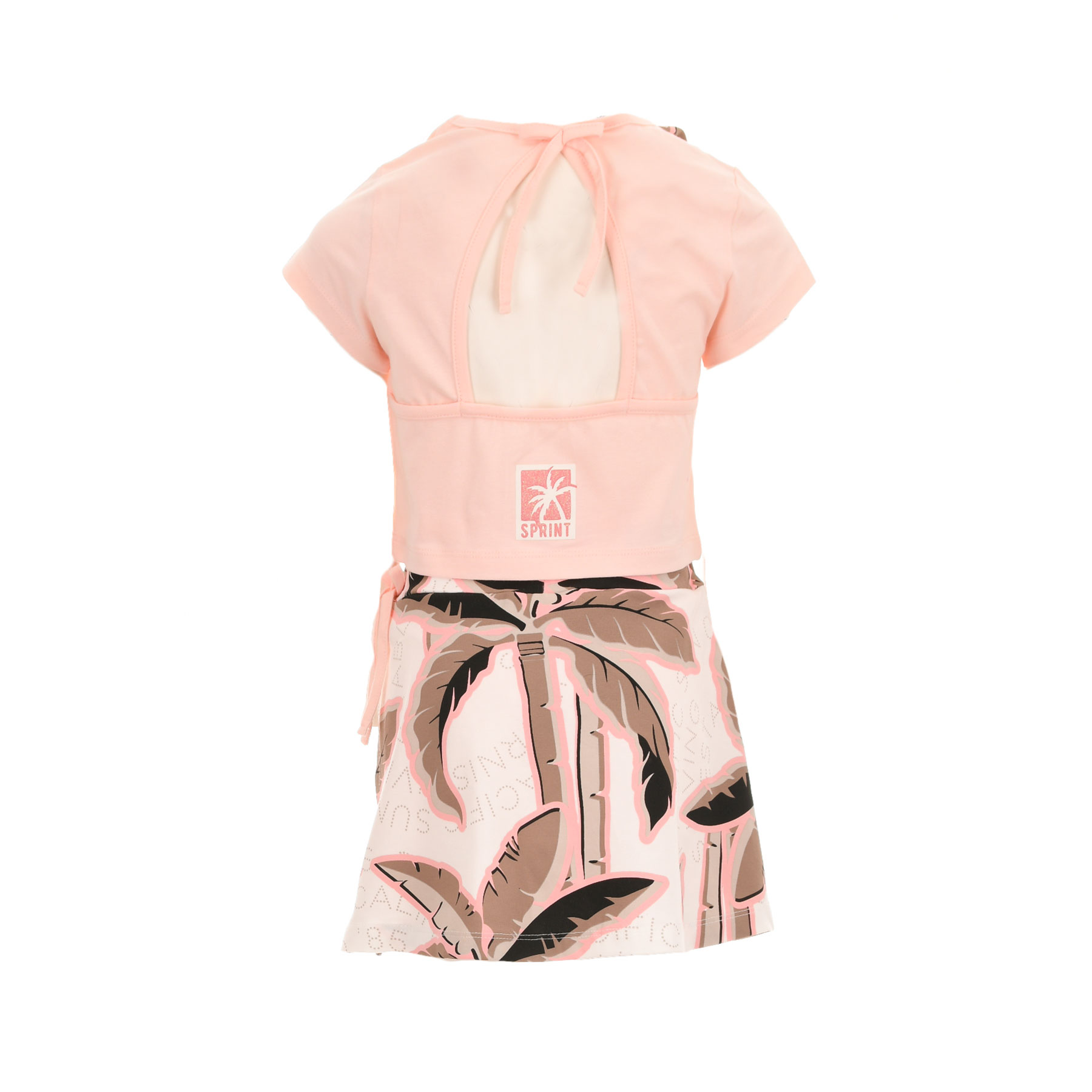 Καλοκαιρινή διάθεση και τροπικό στυλ σε ένα υπέροχο παιδικό σετ Sprint! Το σετ 3 τεμαχίων σε απαλή σομόν απόχρωση περιλαμβάνει κοντομάνικη μπλούζα και σορτς-φούστα με εντυπωσιακό tropical print φοίνικα, προσφέροντας άνεση και ξεχωριστό look στις μικρές fashionistas.Η μπλούζα διαθέτει minimal τύπωμα Sun Chasers που αποπνέει καλοκαιρινή ενέργεια, ενώ η σορτς-φούστα συνδυάζει την ελευθερία του σορτς με την κομψότητα της φούστας. Ιδανικό για βόλτες, διακοπές και καθημερινές εμφανίσεις με στυλ.