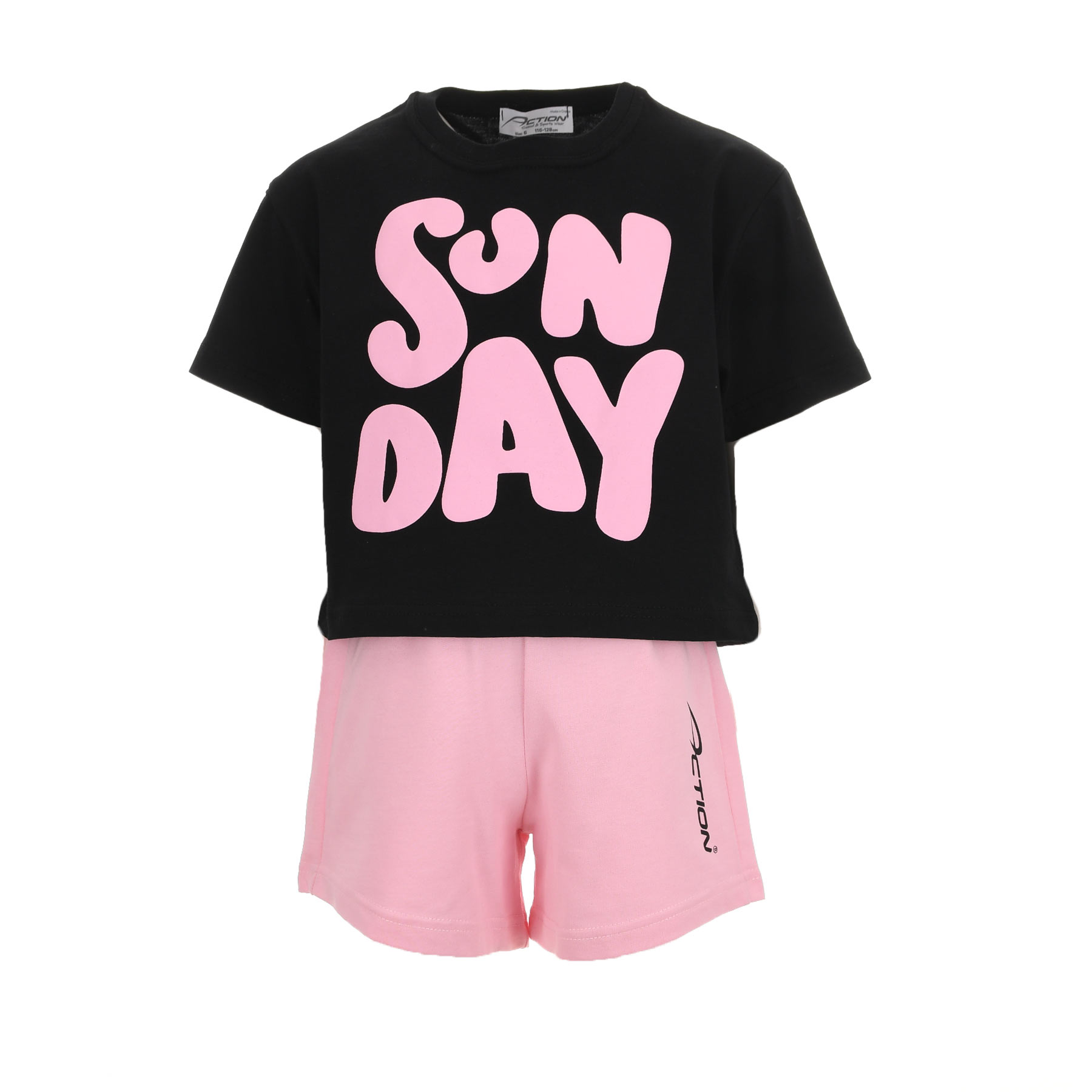 Το παιδικό σετ με σορτς για κορίτσια Action Sportswear σε μαύρο-ροζ συνδυασμό είναι η τέλεια επιλογή για girly και άνετες εμφανίσεις. Η μαύρη μπλούζα με εντυπωσιακό τύπωμα SUNDAY δίνει playful χαρακτήρα, ενώ το ροζ σορτσάκι ολοκληρώνει το look με χρώμα και στυλ.