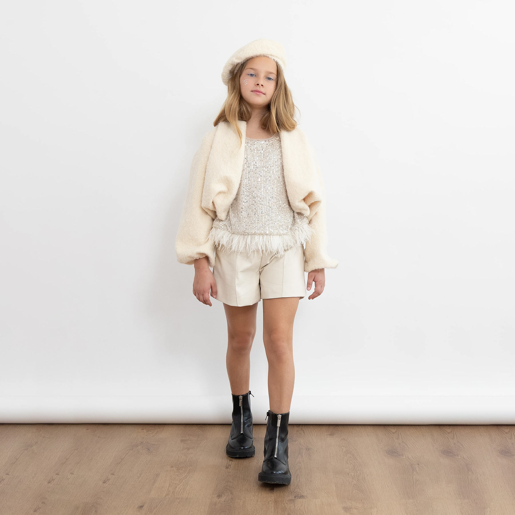 Το παιδικό σετ Alice σε εκρού απόχρωση είναι η ιδανική επιλογή για κορίτσια που αγαπούν το στυλ, τη λάμψη και τις ξεχωριστές εμφανίσεις. Με εντυπωσιακό top διακοσμημένο με πούλιες και λεπτομέρεια φτερών στο τελείωμα, το σύνολο προσφέρει μια luxury αισθητική ιδανική για γιορτές, πάρτι, εμφανίσεις σε εκδηλώσεις ή φωτογράφηση.