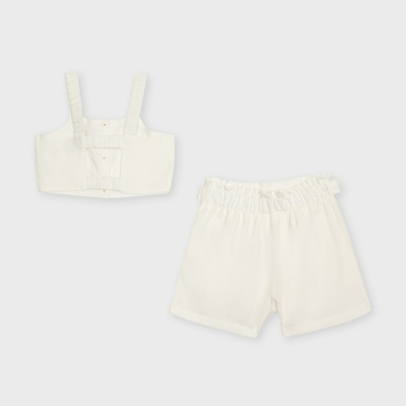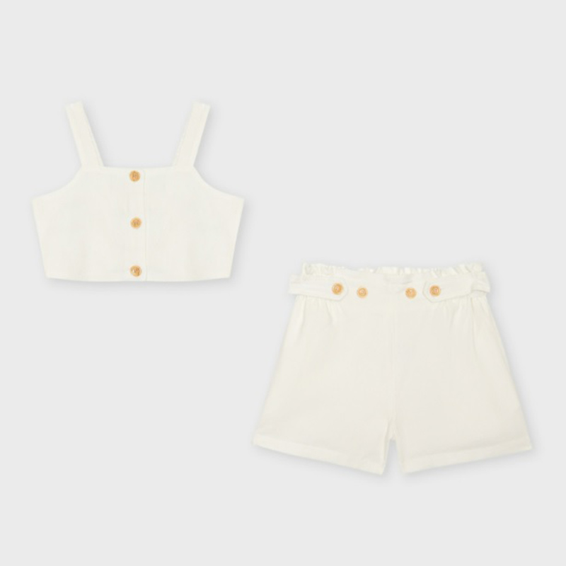 Το παιδικό σετ με σορτς για κορίτσια Ativo σε εκρού απόχρωση είναι η απόλυτη επιλογή για κομψές και δροσερές καλοκαιρινές εμφανίσεις. Αποτελείται από crop top με κουμπιά και σορτσάκι με διακοσμητικές λεπτομέρειες, δημιουργώντας ένα ολοκληρωμένο και stylish outfit.