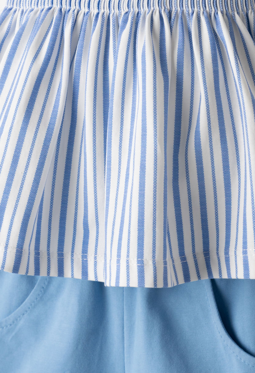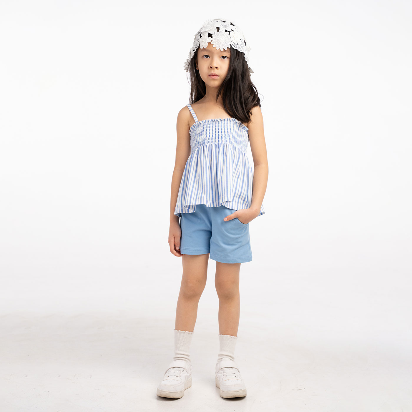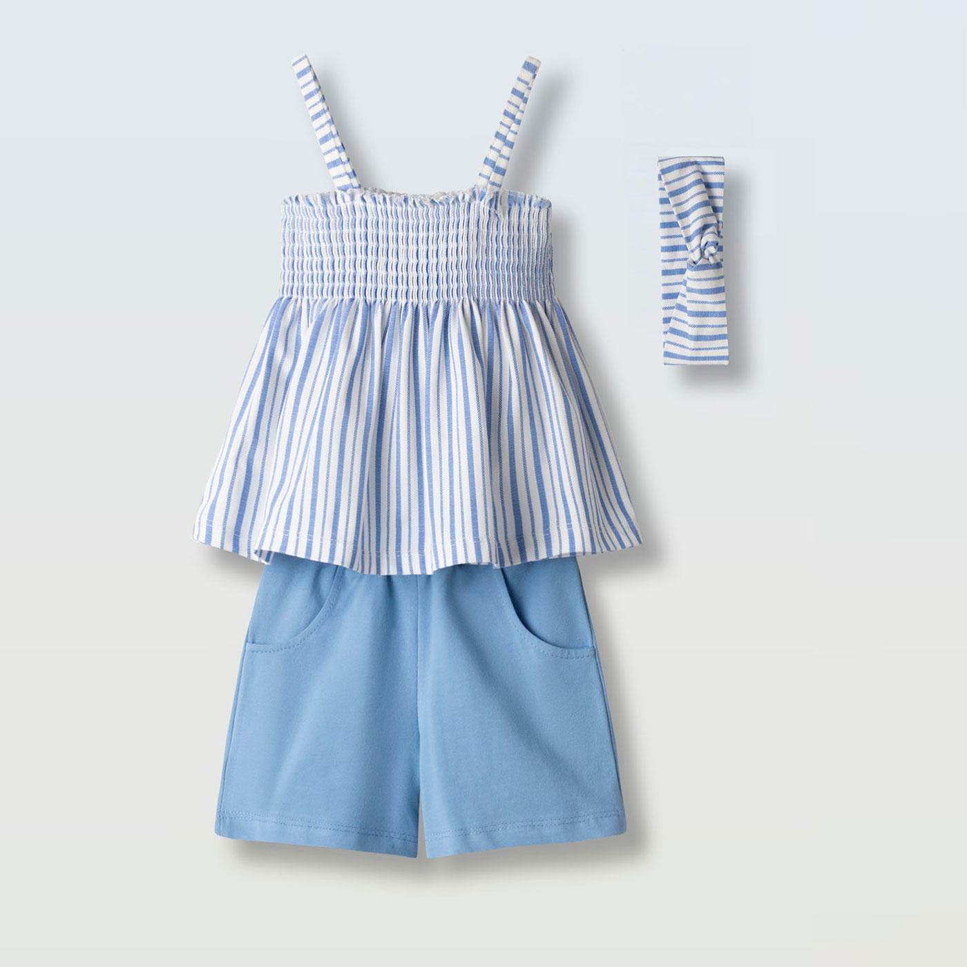 Ένα δροσερό και κομψό παιδικό σετ 3 τεμαχίων για κορίτσια από την Ebita, ιδανικό για τις ζεστές ημέρες της άνοιξης και του καλοκαιριού. Το σετ περιλαμβάνει ριγέ τιραντάκι μπλουζάκι, σορτς και ασορτί κορδέλα μαλλιών, δημιουργώντας ένα ολοκληρωμένο outfit με καλοκαιρινή φρεσκάδα.Το λευκό-σιέλ ριγέ τοπ με λεπτές τιράντες και σφηκοφωλιά στο μπούστο προσφέρει άνετη εφαρμογή και χαριτωμένο στυλ. Το σιέλ σορτς είναι μαλακό και πρακτικό, εξασφαλίζοντας ελευθερία κινήσεων για παιχνίδι και βόλτες. Η ασορτί κορδέλα ολοκληρώνει το look με κομψότητα.Κατασκευασμένο από ελαφριά και φιλικά προς το παιδικό δέρμα υφάσματα, είναι ιδανικό για καθημερινή χρήση αλλά και πιο ιδιαίτερες καλοκαιρινές εμφανίσεις.