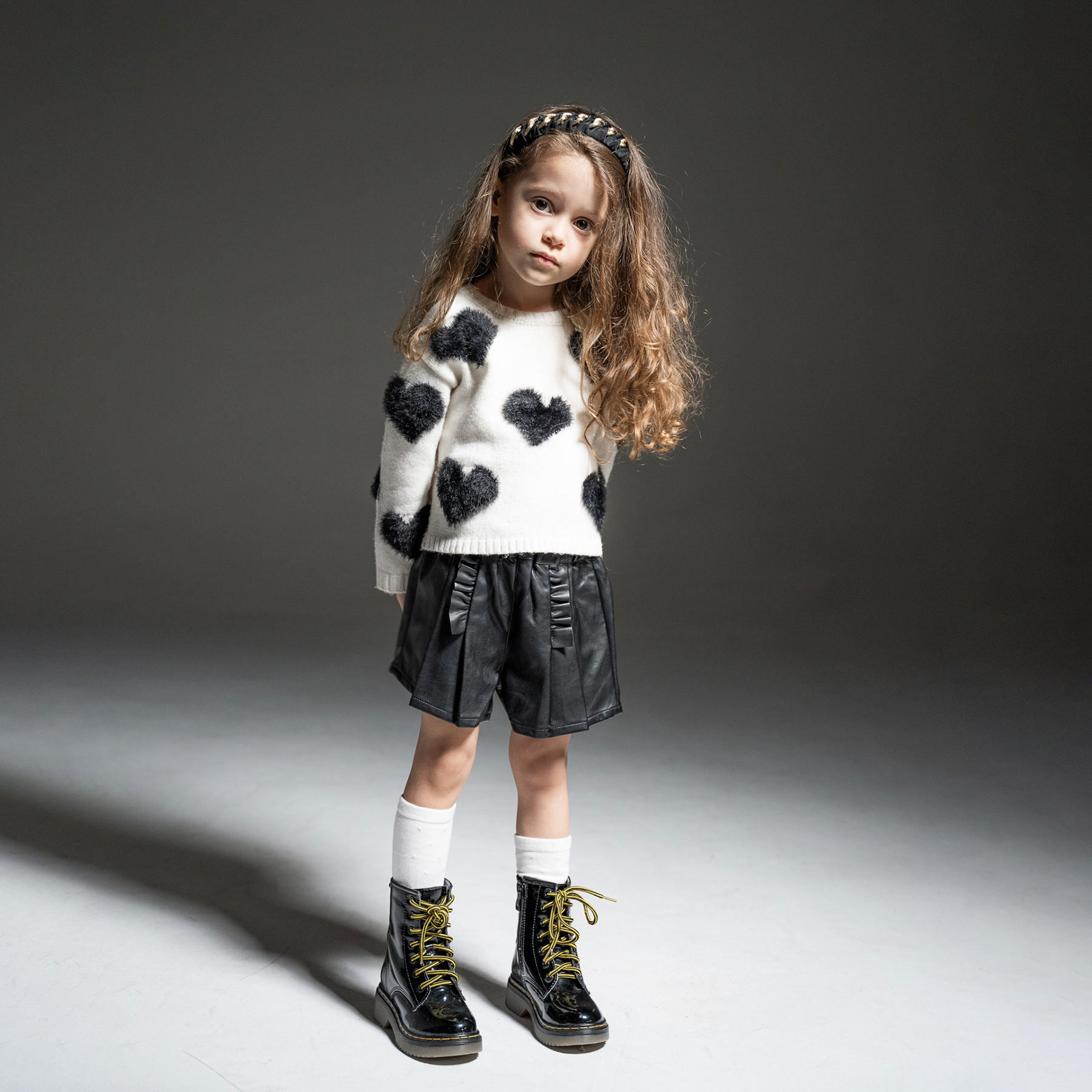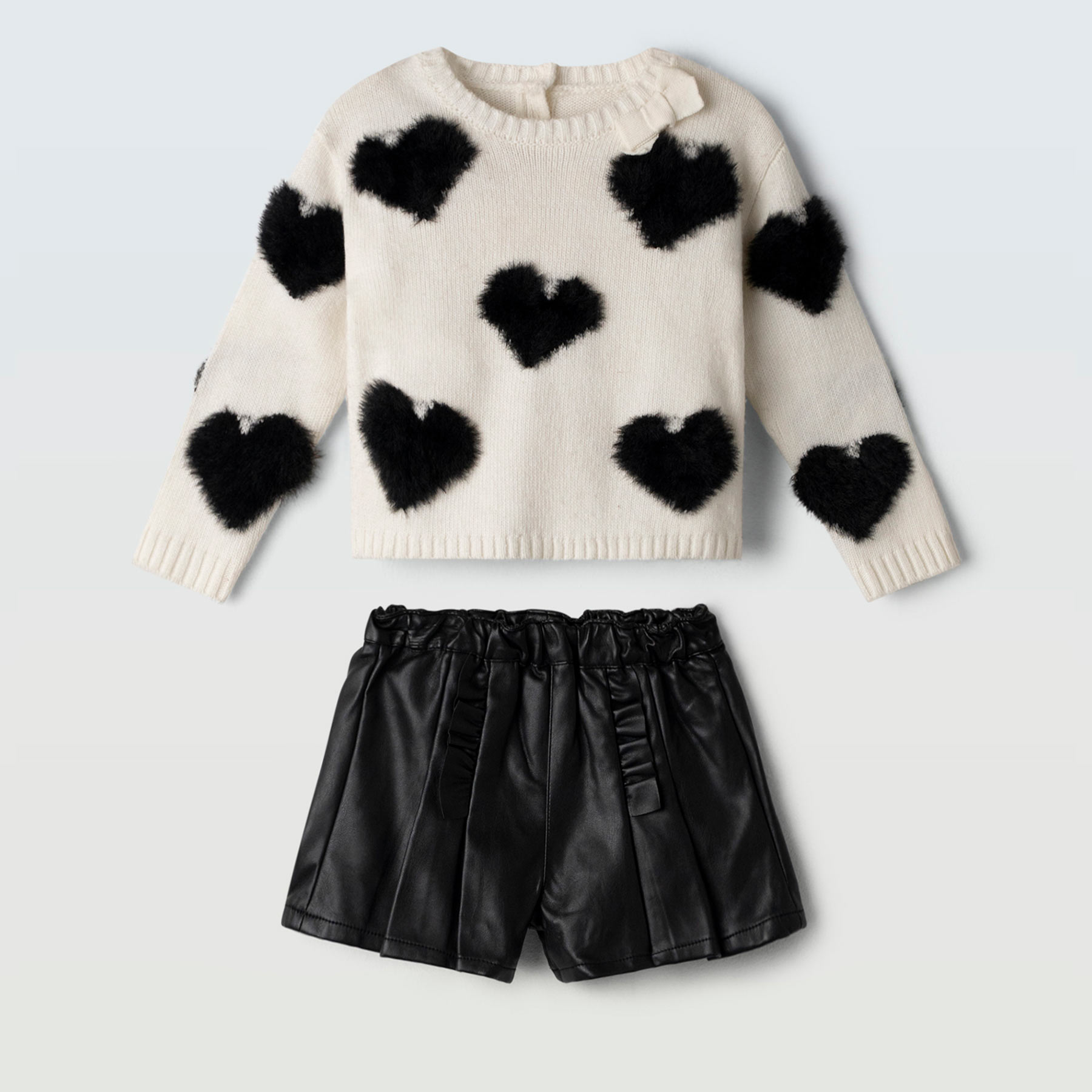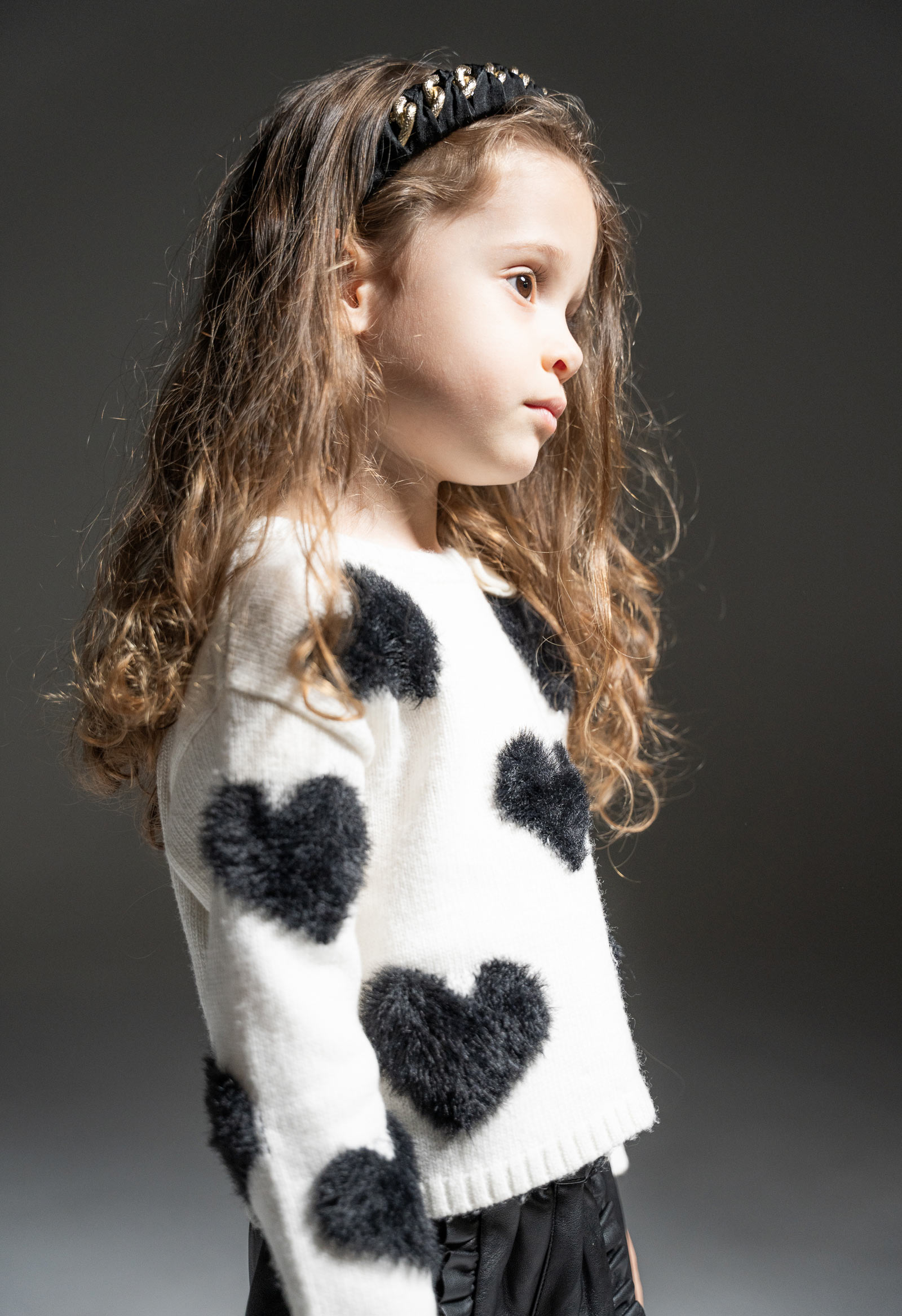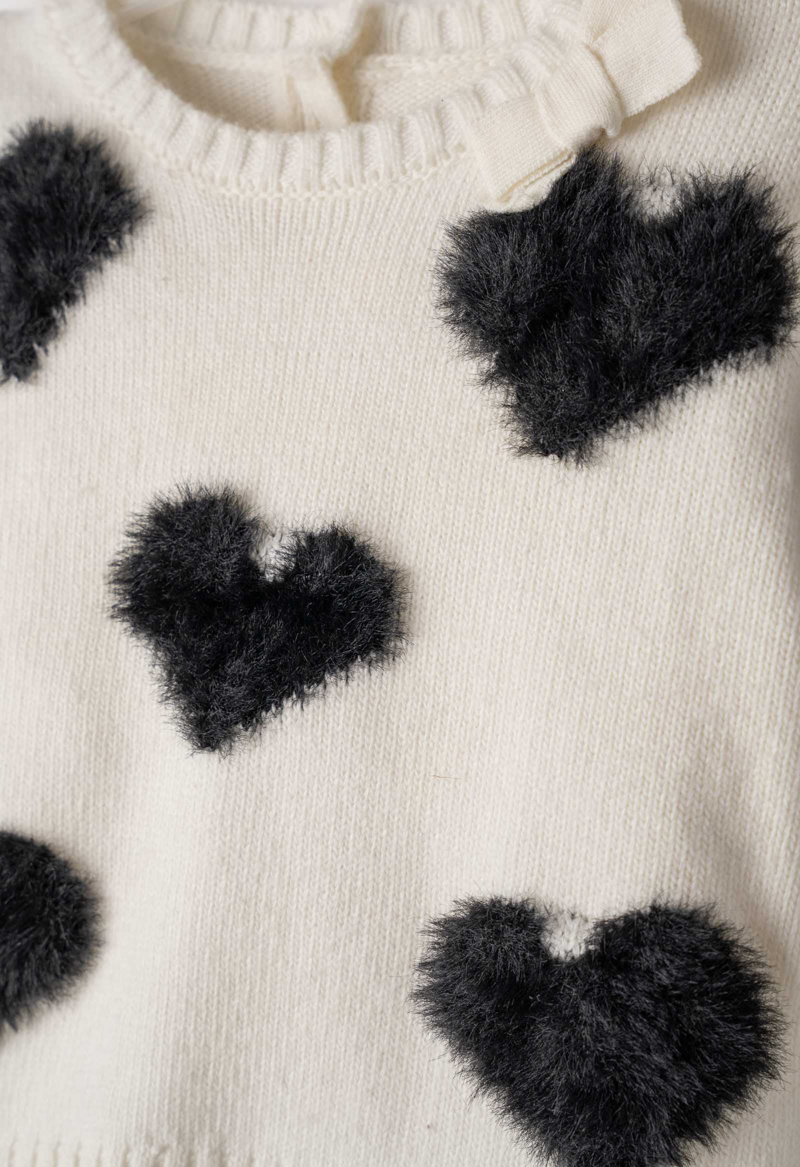 Πλεκτή μπλούζα σε εκρού χρώμα, διακοσμημένη με ανάγλυφες μαύρες καρδιές από φλοκάτη υφή και διακριτικό φιόγκο στον ώμο για μια ρομαντική πινελιά.