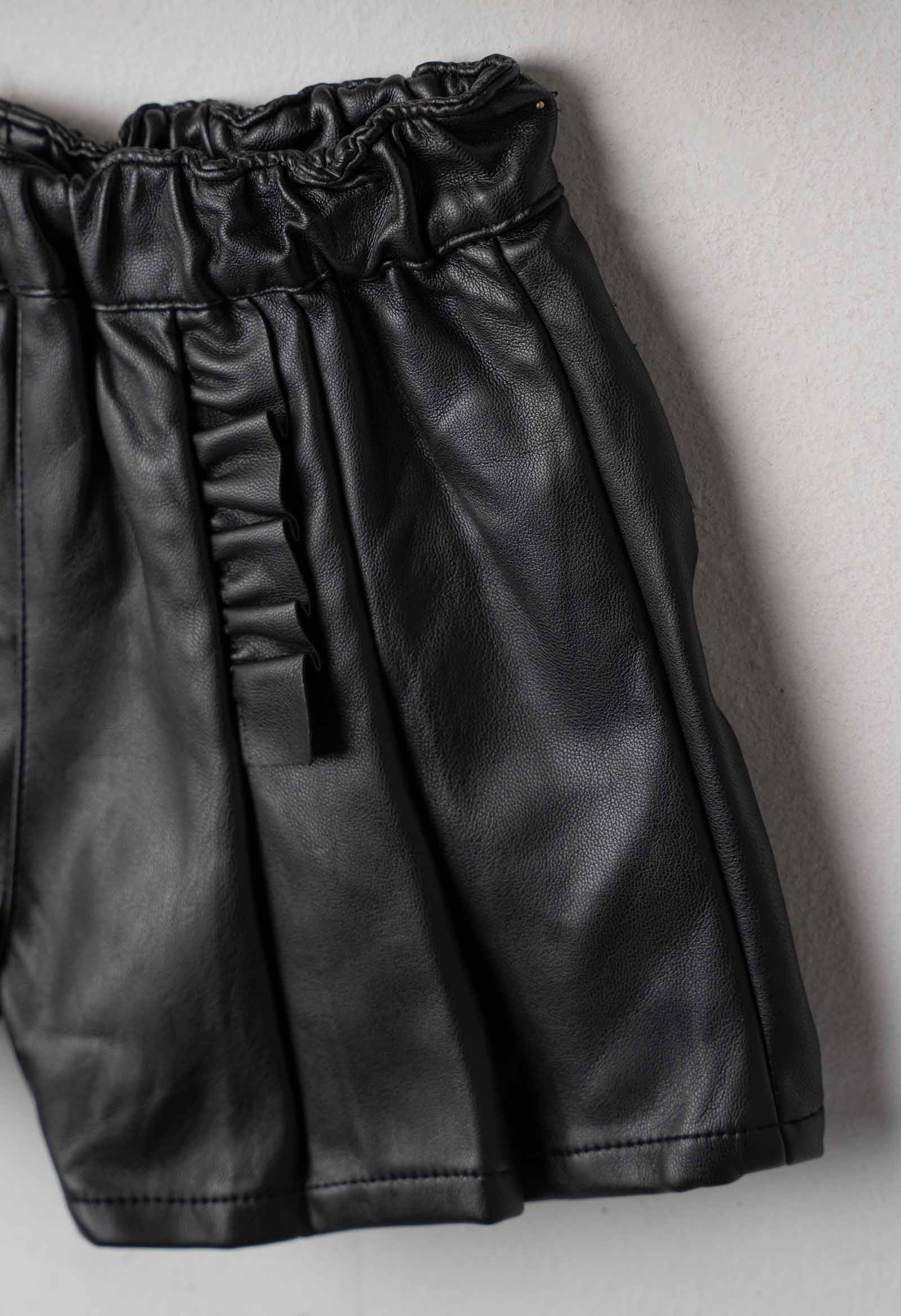Σορτς από οικολογικό δέρμα σε μαύρο χρώμα, με λάστιχο στη μέση για άνετη εφαρμογή και διακοσμητικές πιέτες που προσδίδουν κομψότητα.