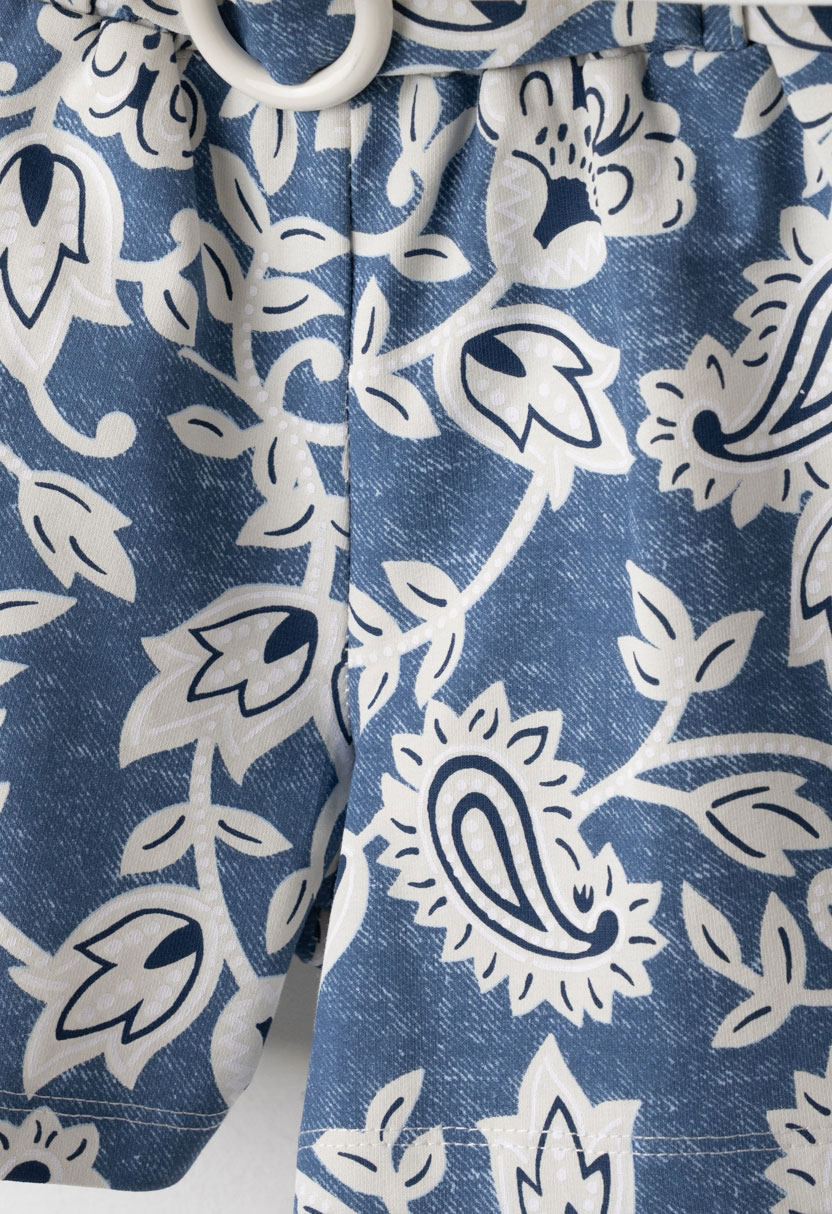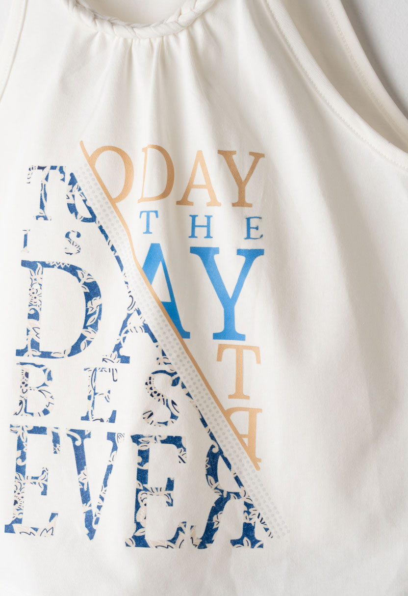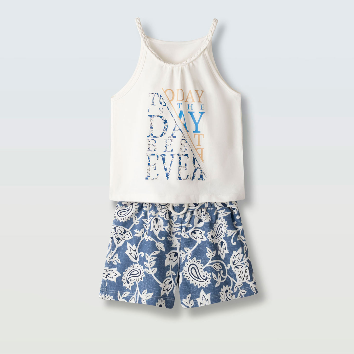 Καλοκαιρινό παιδικό σετ για κορίτσια σε φρέσκο λευκό-σιέλ συνδυασμό, που περιλαμβάνει αμάνικο τοπ και φλοράλ σορτσάκι. Το τοπ σε λευκή βάση με μοντέρνο τύπωμα και πλεχτή λεπτομέρεια στη λαιμόκοψη χαρίζει κομψό και νεανικό ύφος, ενώ το απαλό ύφασμα προσφέρει άνεση και διαπνοή στις ζεστές ημέρες.Το σορτσάκι με σιέλ φλοράλ σχέδιο δίνει καλοκαιρινό χαρακτήρα στο σύνολο, ενώ η ελαστική μέση με ζώνη και διακοσμητική αγκράφα εξασφαλίζει σταθερή αλλά άνετη εφαρμογή. Ιδανικό σετ για δραστήριες μικρές κυρίες που θέλουν στυλ και ελευθερία κινήσεων όλη μέρα.