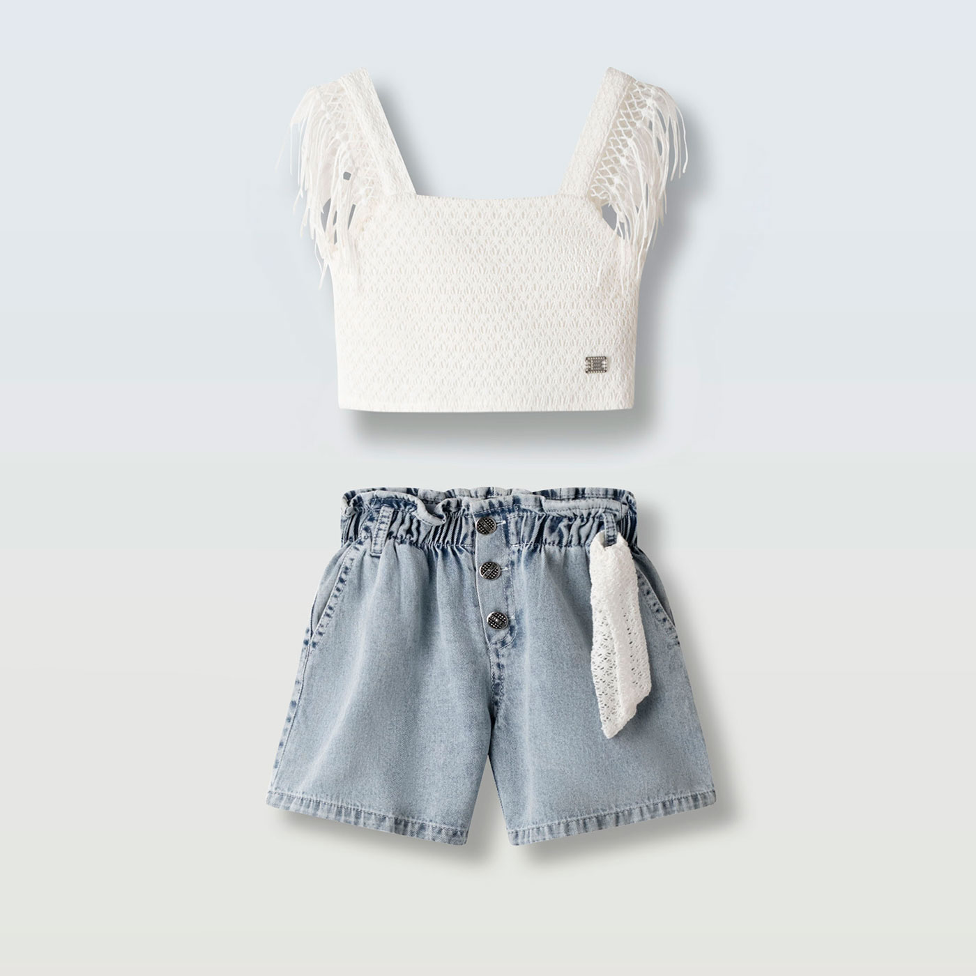 Το παιδικό σετ Ebita σε λευκό και τζιν είναι μια κομψή και καλοκαιρινή επιλογή που συνδυάζει ρομαντική διάθεση με casual χαρακτήρα. Ιδανικό για βόλτες, εκδηλώσεις και καλοκαιρινές εμφανίσεις, προσφέρει άνεση και στυλ σε κάθε περίσταση.Το λευκό τοπ ξεχωρίζει για την ανάγλυφη υφή του και τις εντυπωσιακές λεπτομέρειες στους ώμους, που χαρίζουν αέρινη και girly αισθητική. Η εφαρμογή του είναι άνετη, ενώ το ελαφρύ ύφασμα το καθιστά ιδανικό για ζεστές ημέρες.Το τζιν σορτς σε χαλαρή γραμμή διαθέτει ελαστική μέση για σταθερή και άνετη εφαρμογή, διακοσμητικά κουμπιά στο μπροστινό μέρος και αποσπώμενη υφασμάτινη ζώνη που ολοκληρώνει το look. Ένα ολοκληρωμένο σύνολο που συνδυάζεται εύκολα με σανδάλια ή sneakers.