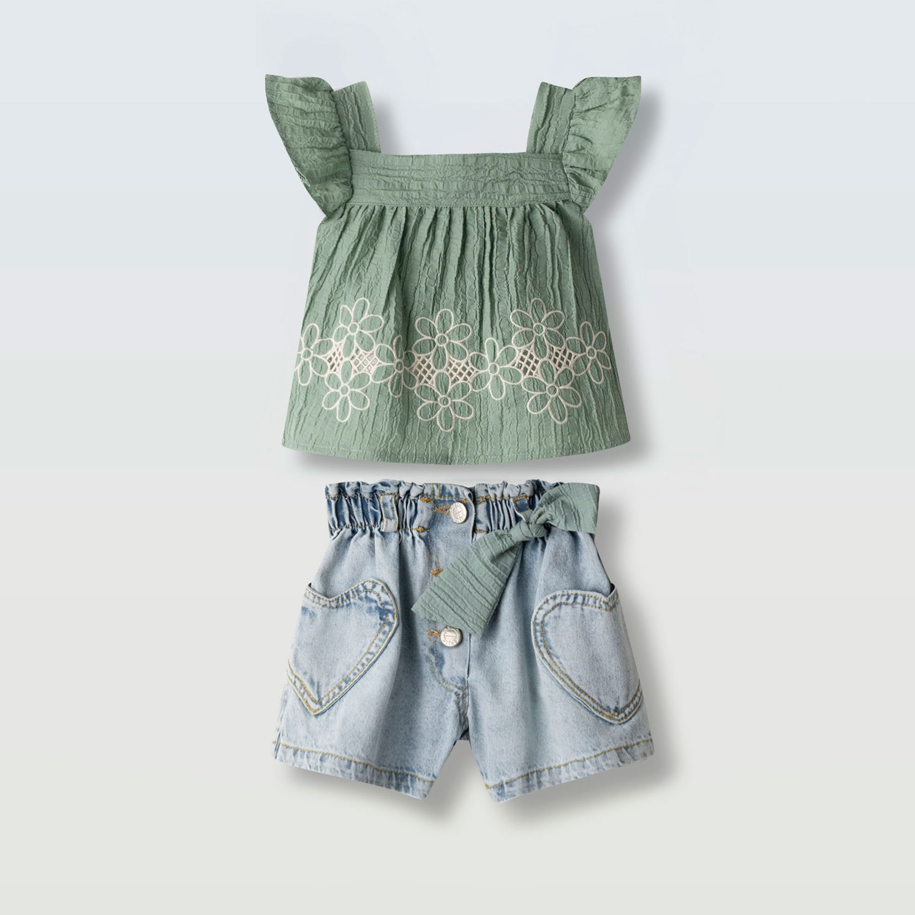 Το πράσινο top διαθέτει ρομαντικά βολάν στους ώμους και όμορφα κεντημένα λουλούδια στο τελείωμα, χαρίζοντας girly αισθητική και κομψότητα. Το τζιν σορτς διαθέτει ελαστική μέση με διακοσμητικό φιόγκο και χαριτωμένες τσέπες σε σχήμα καρδιάς που προσθέτουν παιχνιδιάρικο χαρακτήρα στο outfit.