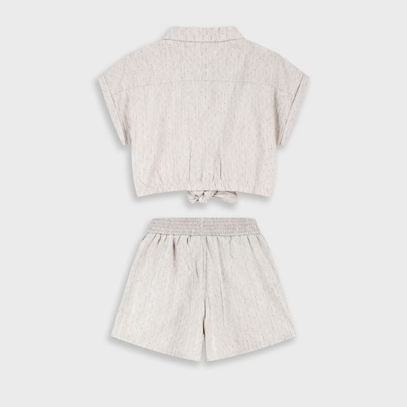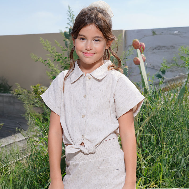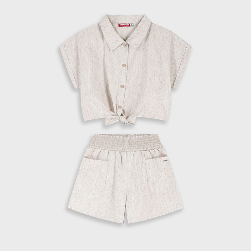 Ανανεώστε την καλοκαιρινή γκαρνταρόμπα της μικρής σας με αυτό το κομψό και άνετο παιδικό σετ για κορίτσια από την Energiers σε διαχρονική μπεζ απόχρωση. Το σετ αποτελείται από κοντομάνικο πουκάμισο με γιακά και σορτσάκι με ελαστική μέση, προσφέροντας ιδανικό συνδυασμό στυλ και πρακτικότητας για κάθε καθημερινή ή πιο προσεγμένη εμφάνιση.Το πουκάμισο διαθέτει κουμπιά στο μπροστινό μέρος και διακριτικό δέσιμο χαμηλά, δημιουργώντας ένα μοντέρνο cropped αποτέλεσμα που χαρίζει φρεσκάδα και θηλυκότητα στο look. Το σορτσάκι αγκαλιάζει άνετα το σώμα χάρη στη λάστιχο στη μέση και εξασφαλίζει ελευθερία κινήσεων όλη μέρα. Το ύφασμα έχει ελαφριά υφή με διακριτικές γυαλιστερές λεπτομέρειες που προσθέτουν μια κομψή πινελιά χωρίς υπερβολές.Ιδανική επιλογή για καλοκαιρινές βόλτες, οικογενειακές εξόδους, γιορτές ή διακοπές, το παιδικό σετ Energiers συνδυάζεται εύκολα με σανδάλια, αθλητικά παπούτσια ή εσπαντρίγιες, προσφέροντας πολλαπλές στιλιστικές επιλογές.
