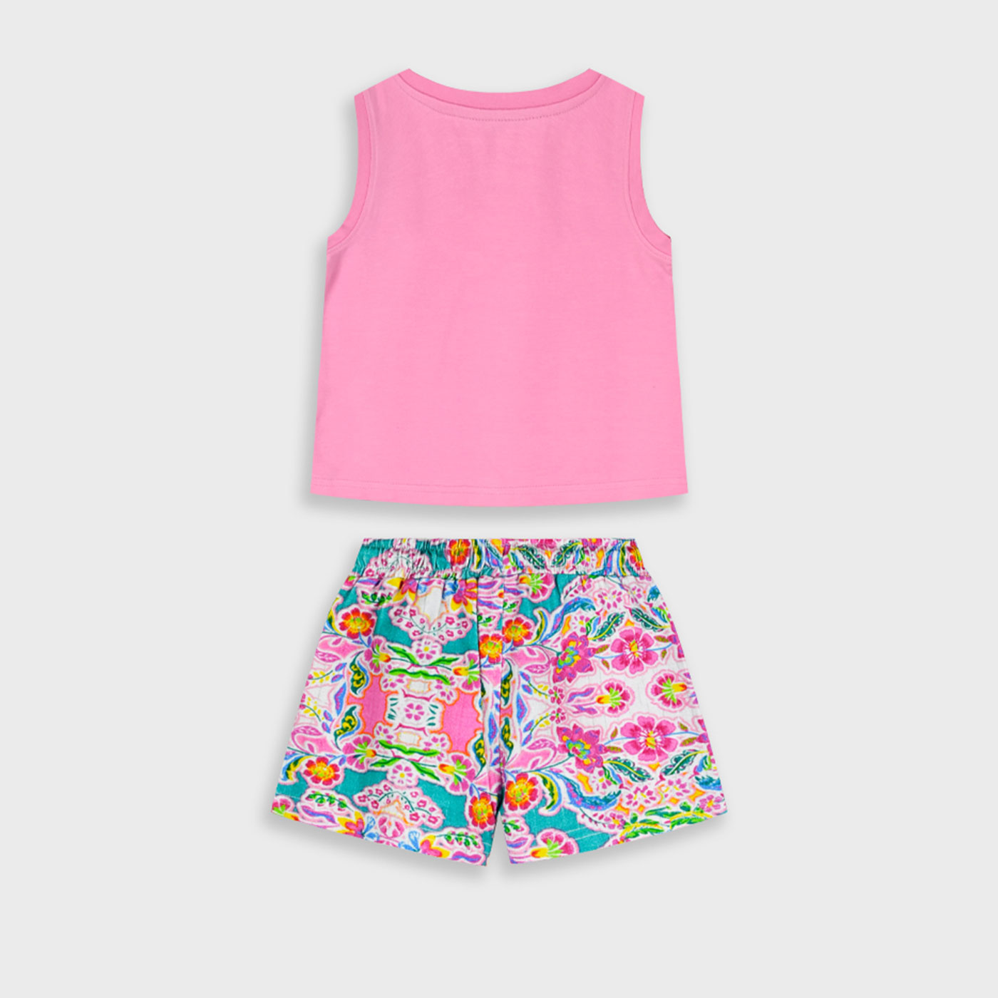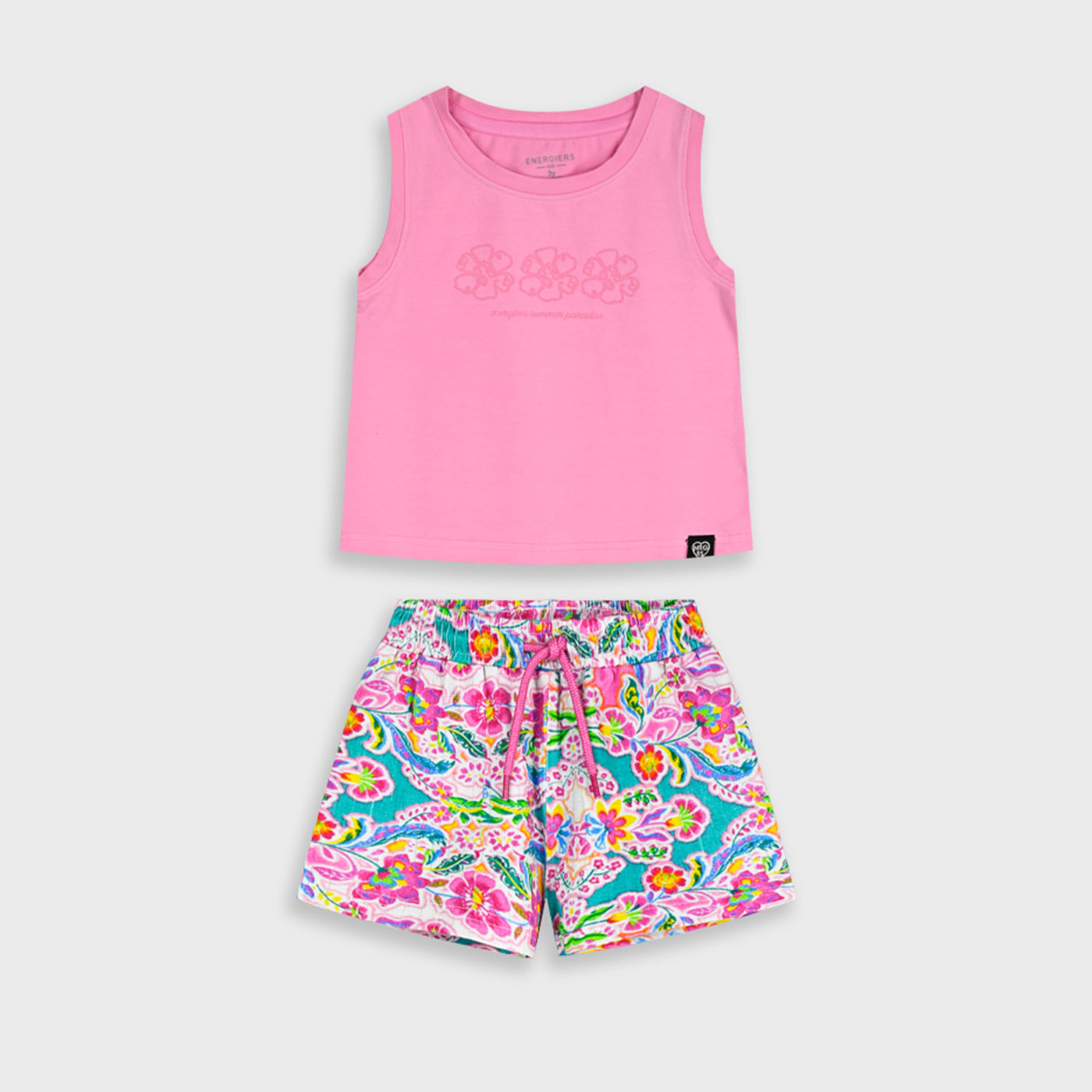 Το παιδικό σετ με σορτς για κορίτσια Energiers σε ροζ-φλοράλ απόχρωση αποτελεί μια χαρούμενη και άνετη επιλογή για τις καλοκαιρινές εμφανίσεις, συνδυάζοντας girly αισθητική και πρακτικότητα. Το αμάνικο ροζ τοπ, με διακριτικό σχέδιο στο στήθος, προσφέρει δροσερή αίσθηση και ελευθερία κινήσεων, ενώ το σορτς με πολύχρωμο φλοράλ μοτίβο χαρίζει ζωντάνια και ξεχωριστό στυλ σε κάθε outfit. Η ελαστική μέση με κορδόνι εξασφαλίζει σταθερή και άνετη εφαρμογή, ιδανική για παιχνίδι, βόλτες και καλοκαιρινές δραστηριότητες. Κατασκευασμένο από απαλό βαμβακερό ύφασμα, το σετ αγκαλιάζει απαλά το παιδικό δέρμα και προσφέρει άνεση όλη μέρα. Ένα μοντέρνο παιδικό σετ Energiers για κορίτσια που αγαπούν τα χρώματα, τα λουλούδια και τις στιλάτες, δροσερές εμφανίσεις.