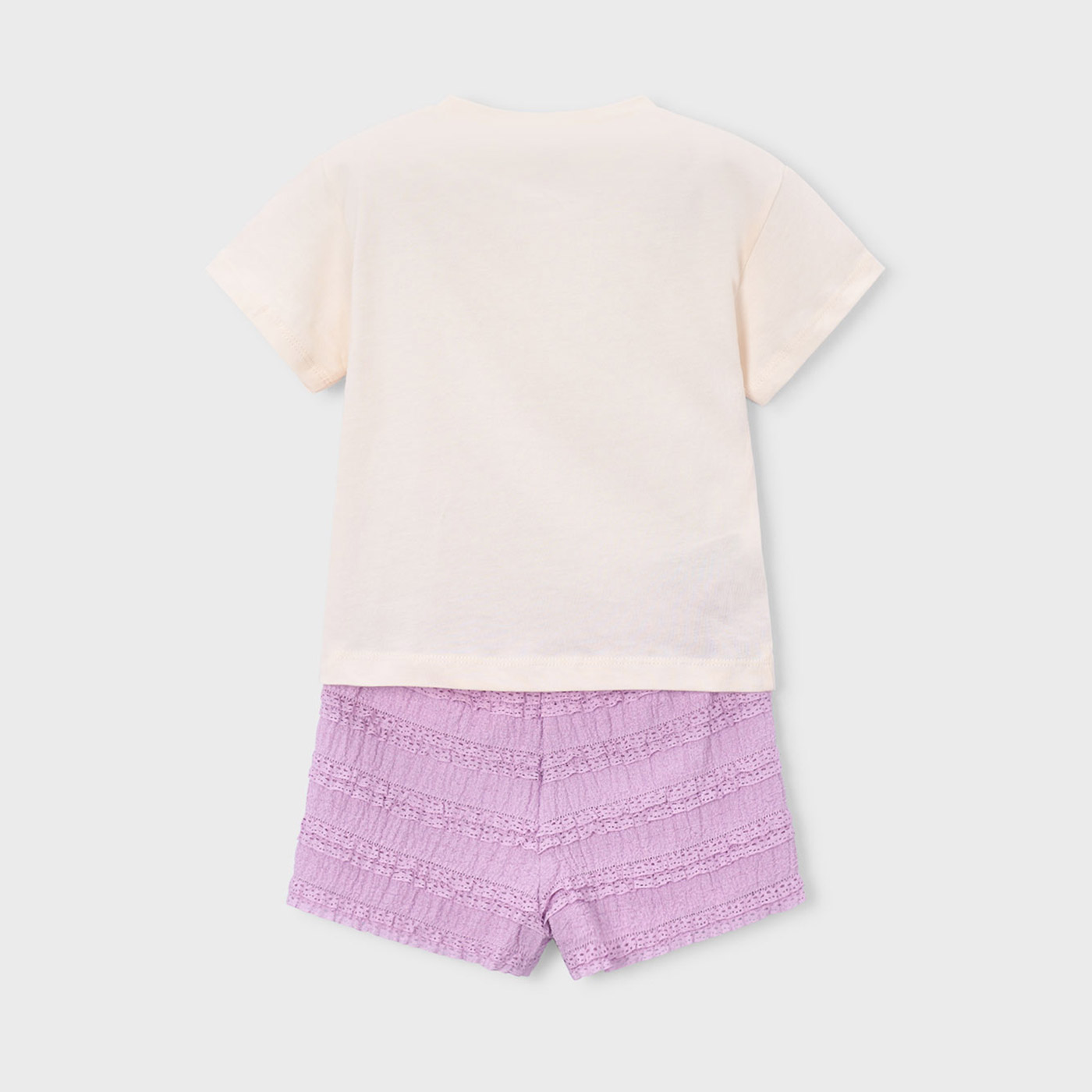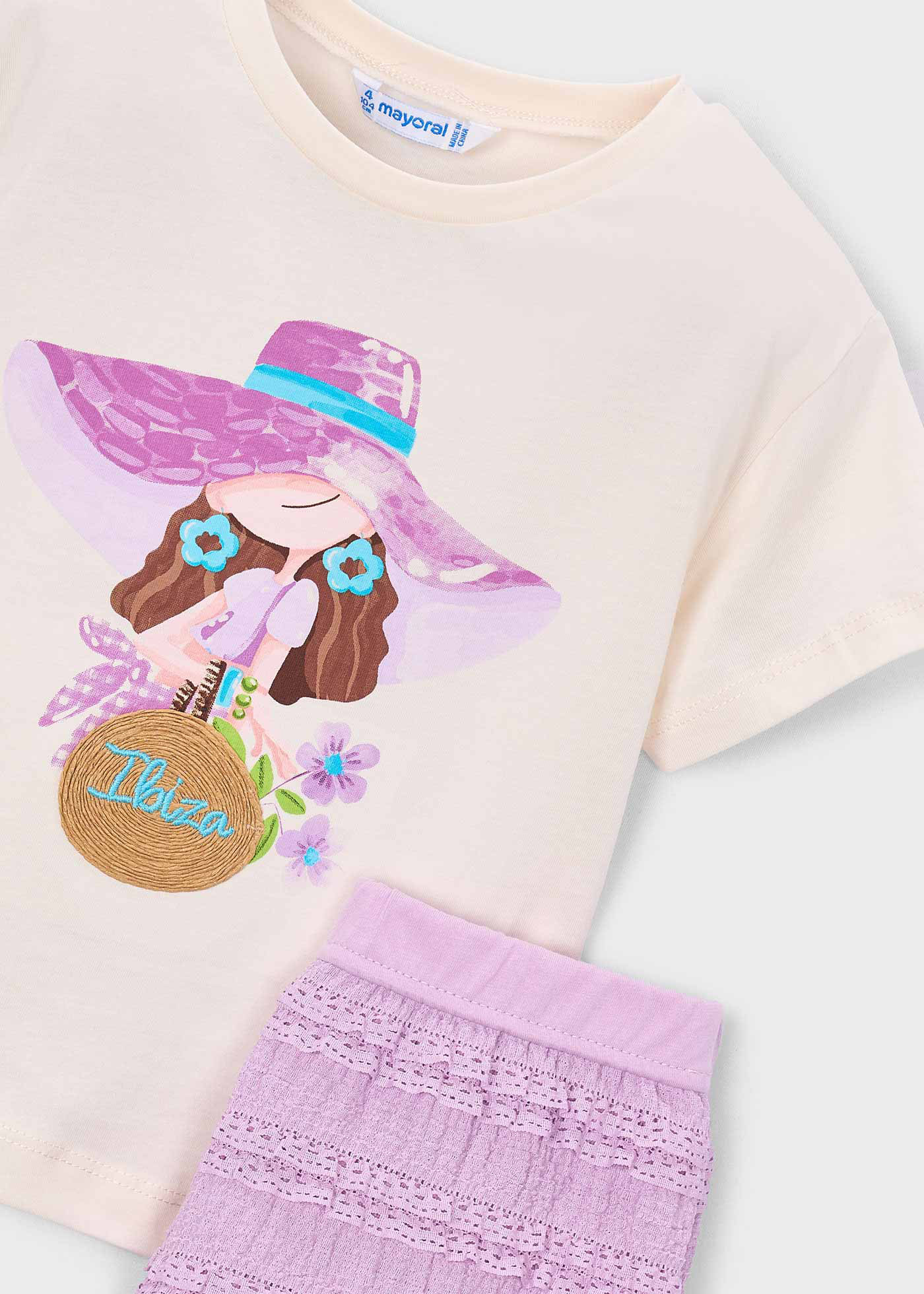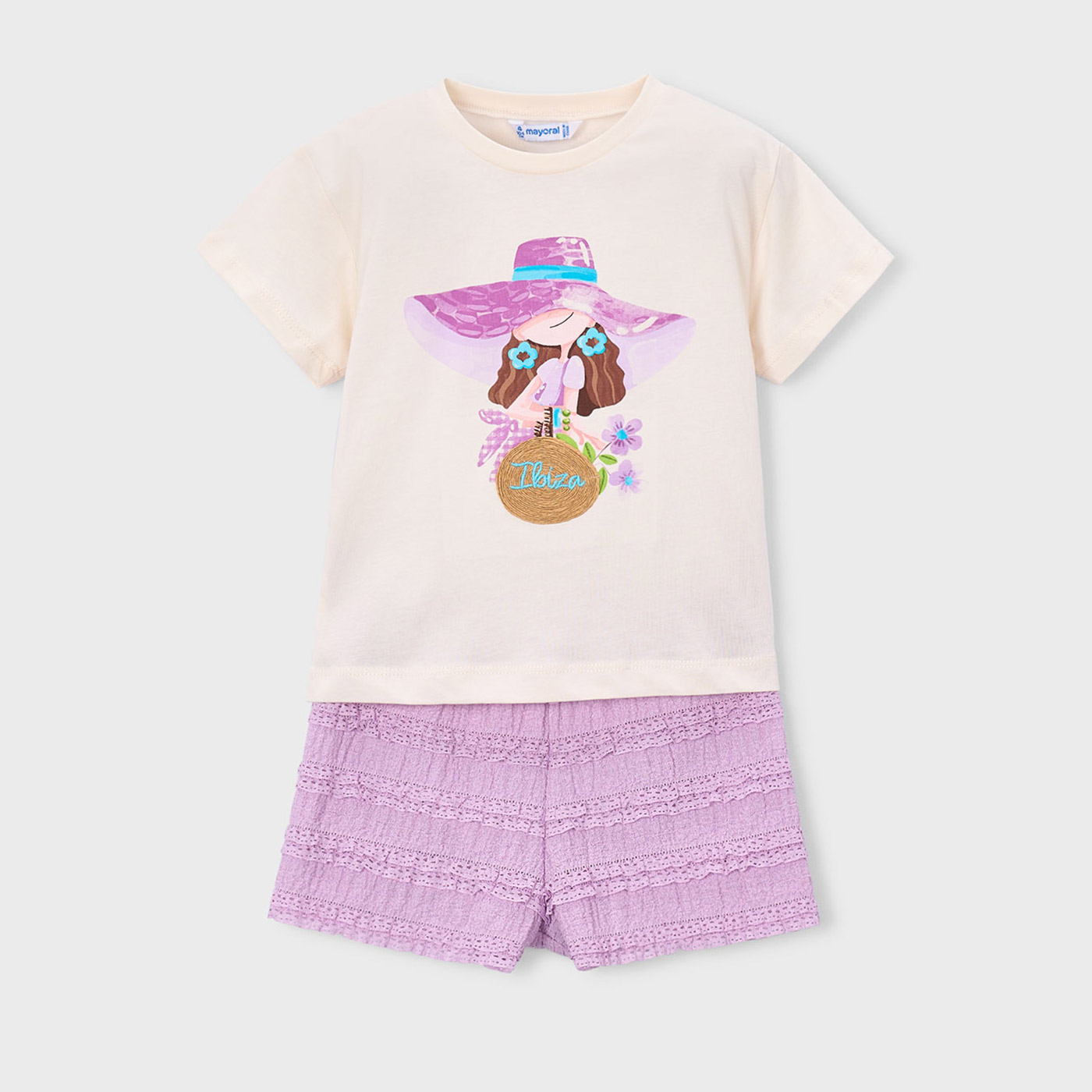 Χαρίστε καλοκαιρινή φρεσκάδα και στυλ στις εμφανίσεις της μικρής σας με αυτό το πανέμορφο παιδικό σετ Mayoral. Ένας ιδανικός συνδυασμός άνεσης και μόδας, σχεδιασμένος για δραστήριες μέρες γεμάτες παιχνίδι και χαμόγελα.Το σετ αποτελείται από εκρού κοντομάνικη μπλούζα με εντυπωσιακή στάμπα κοριτσιού με καπέλο και διακοσμητικές λεπτομέρειες, που προσθέτουν παιχνιδιάρικο χαρακτήρα και καλοκαιρινή διάθεση. Το λιλά σορτς ξεχωρίζει για την ανάγλυφη υφή του με διακριτικά βολάν και ελαστική μέση, εξασφαλίζοντας άνετη εφαρμογή και ελευθερία κινήσεων.