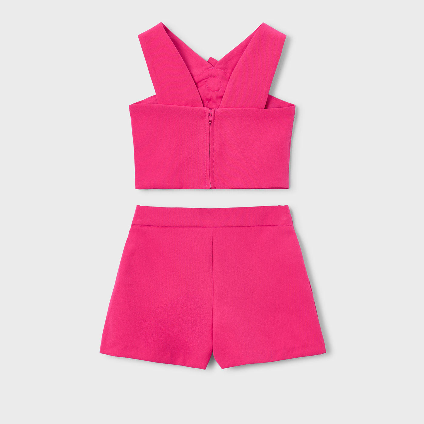 Αναδείξτε το καλοκαιρινό στυλ της μικρής σας με αυτό το εντυπωσιακό παιδικό σετ Mayoral σε φούξια χρώμα, που συνδυάζει κομψότητα, άνεση και μοντέρνο design. Το σετ αποτελείται από αμάνικο cropped τοπ με χιαστί τιράντες και διακοσμητικό λουλούδι στο μπροστινό μέρος, καθώς και σορτς με τσέπες στολισμένες με αντίστοιχα υφασμάτινα λουλούδια, δημιουργώντας ένα αρμονικό και ιδιαίτερο σύνολο.Το ύφασμα είναι απαλό και ελαφρύ, ιδανικό για τις ζεστές ημέρες του καλοκαιριού, ενώ η άνετη εφαρμογή επιτρέπει ελευθερία κινήσεων στο παιχνίδι και στη βόλτα. Το ζωηρό φούξια χρώμα προσθέτει χαρούμενη διάθεση και κάνει το σύνολο να ξεχωρίζει σε κάθε εμφάνιση.