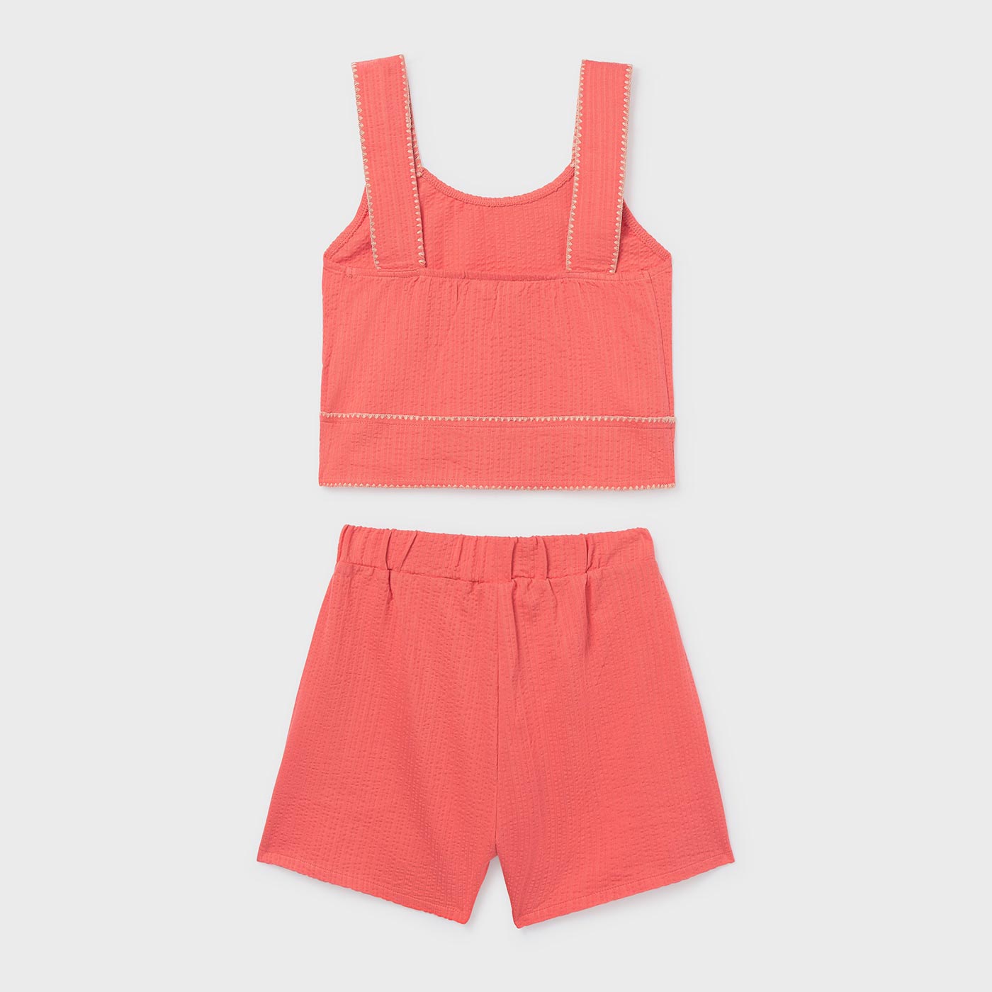 Το παιδικό σετ Mayoral με σορτς σε φωτεινή κοραλί απόχρωση είναι μια κομψή και άνετη επιλογή για τις καλοκαιρινές εμφανίσεις των κοριτσιών. Ένα σύνολο που συνδυάζει πρακτικότητα, δροσερή αίσθηση και μοντέρνα αισθητική, ιδανικό για καθημερινή χρήση, βόλτες και διακοπές.Το σετ αποτελείται από αμάνικο τοπ με φαρδιές τιράντες και διακριτικές διακοσμητικές ραφές που προσθέτουν μια κομψή πινελιά, καθώς και σορτς με ελαστική μέση για εύκολη εφαρμογή και άνεση. Το ύφασμα είναι ελαφρύ, απαλό και ευχάριστο στην αφή, ιδανικό για τις ζεστές ημέρες του καλοκαιριού. Οι πρακτικές μπροστινές τσέπες στο σορτς ολοκληρώνουν το σύνολο με λειτουργικότητα και στυλ.