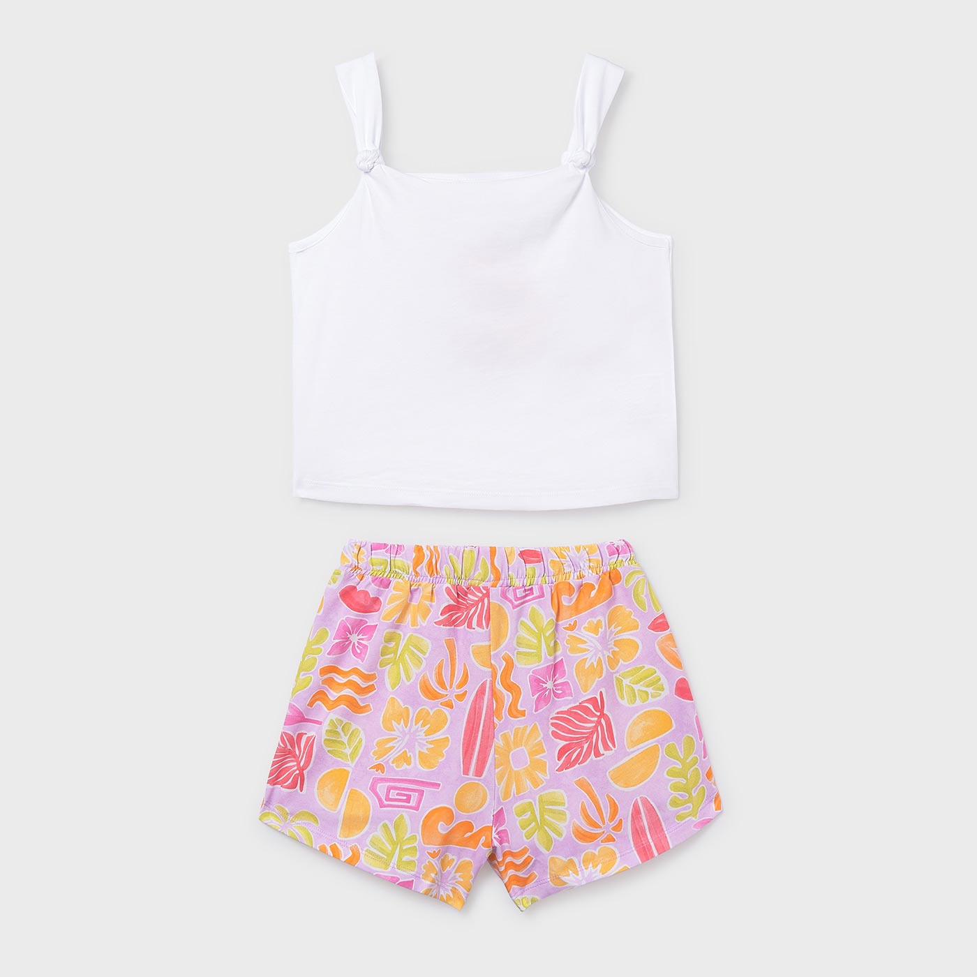 Φρέσκο, χαρούμενο και άνετο, αυτό το παιδικό σετ με σορτς για κορίτσια Mayoral σε συνδυασμό λευκού και λιλά είναι η ιδανική επιλογή για καλοκαιρινές εμφανίσεις γεμάτες χρώμα και θετική διάθεση.Το σετ περιλαμβάνει λευκό αμάνικο τοπ με λεπτές τιράντες και παιχνιδιάρικο στάμπωμα Love Surf στο μπροστινό μέρος, που χαρίζει καλοκαιρινό χαρακτήρα. Το λιλά σορτς με πολύχρωμο τροπικό print διαθέτει ελαστική μέση για άνετη εφαρμογή και ελευθερία κινήσεων. Το απαλό και ελαφρύ ύφασμα το καθιστά ιδανικό για ζεστές ημέρες.Ιδανικό για διακοπές, βόλτες, παιχνίδι αλλά και καθημερινές εμφανίσεις, αυτό το σετ συνδυάζει άνεση, στιλ και ποιότητα με την υπογραφή της Mayoral.