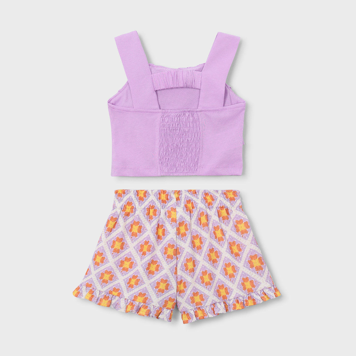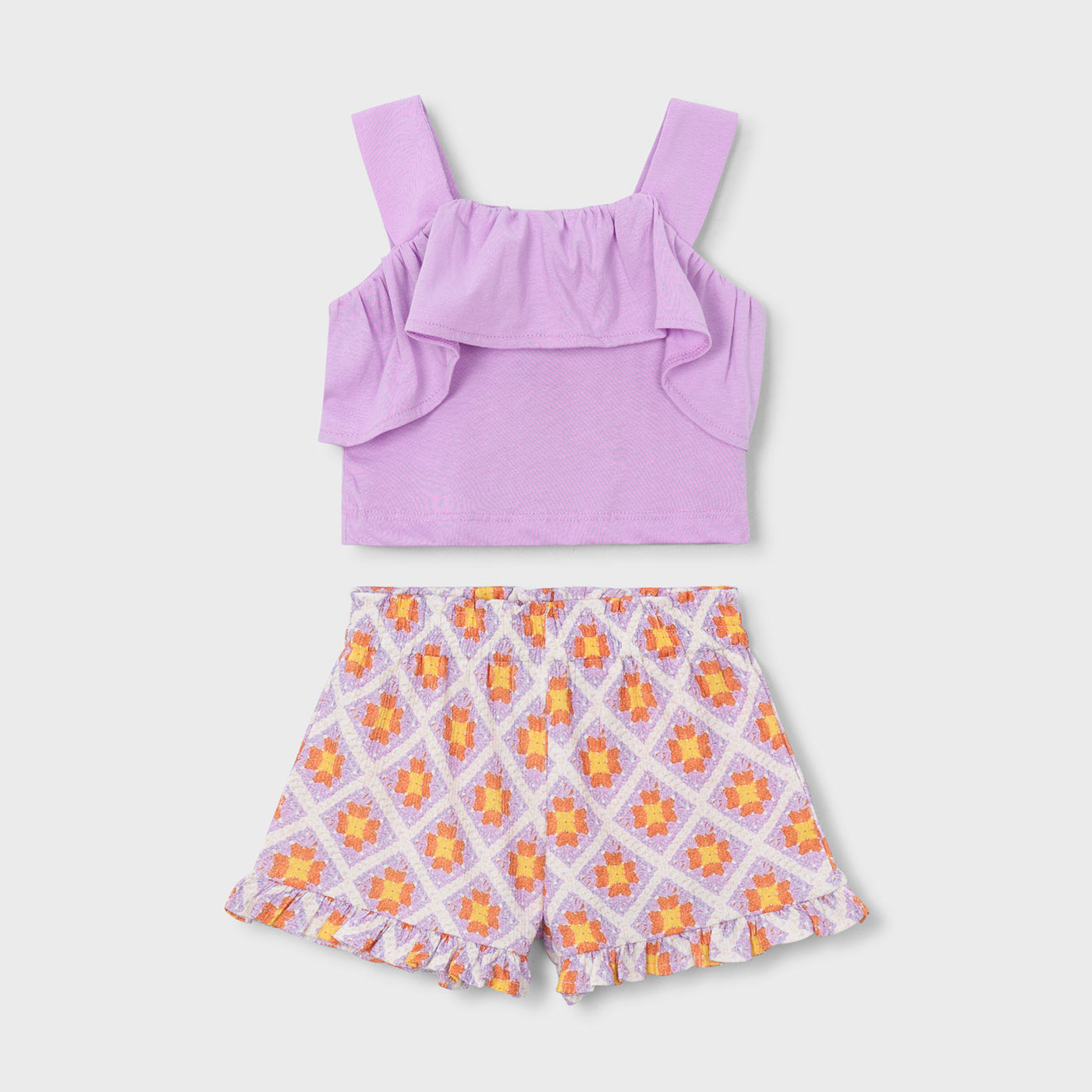 Φρέσκο, μοντέρνο και απόλυτα καλοκαιρινό, αυτό το παιδικό σετ Mayoral για κορίτσια ξεχωρίζει για τα απαλά χρώματα και τον ιδιαίτερο σχεδιασμό του. Ιδανικό για τις ζεστές ημέρες, προσφέρει άνεση και στιλ σε κάθε εμφάνιση.Το σετ αποτελείται από λιλά crop top με φαρδιές τιράντες και εντυπωσιακό βολάν στο επάνω μέρος, που χαρίζει ρομαντική και fashion αισθητική. Στο πίσω μέρος διαθέτει σφηκοφωλιά, εξασφαλίζοντας τέλεια εφαρμογή και άνεση. Το σορτς διαθέτει ελαστική μέση και σταμπωτό μοτίβο σε λιλά, πορτοκαλί και λευκές αποχρώσεις, με διακριτικό βολάν στο τελείωμα για extra στιλ.Κατασκευασμένο από ελαφρύ και δροσερό ύφασμα, το σετ είναι ιδανικό για παιχνίδι, βόλτες και καλοκαιρινές εξόδους.