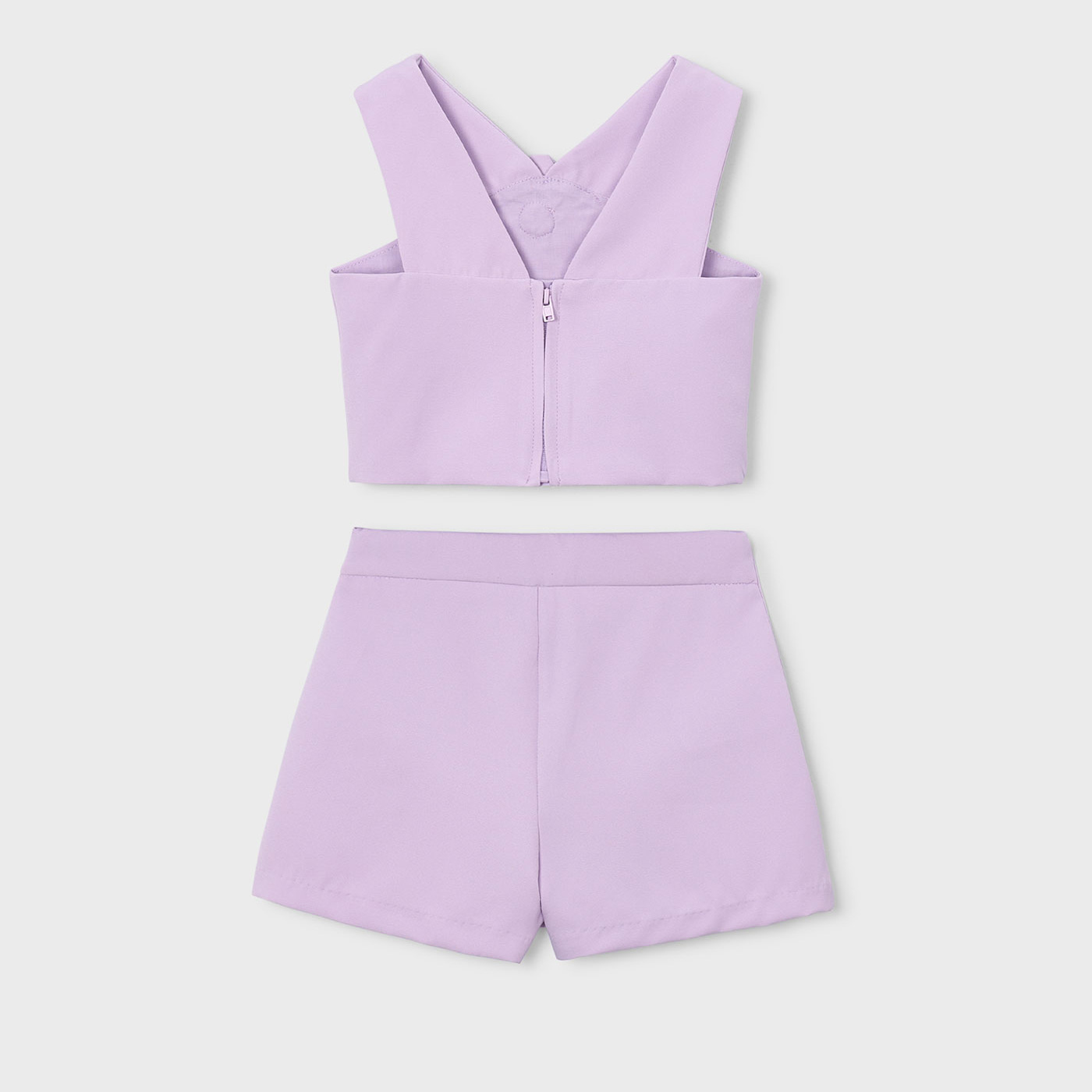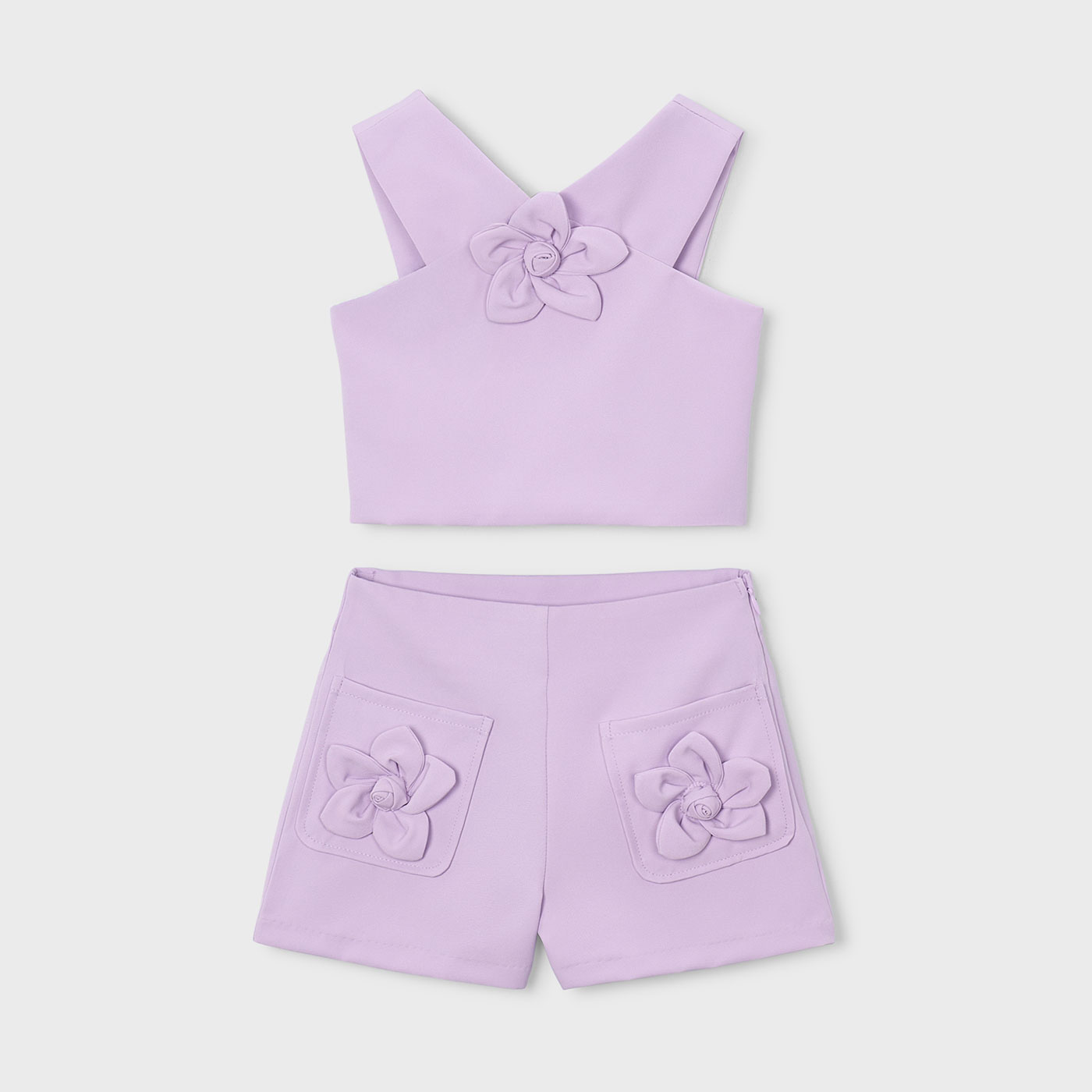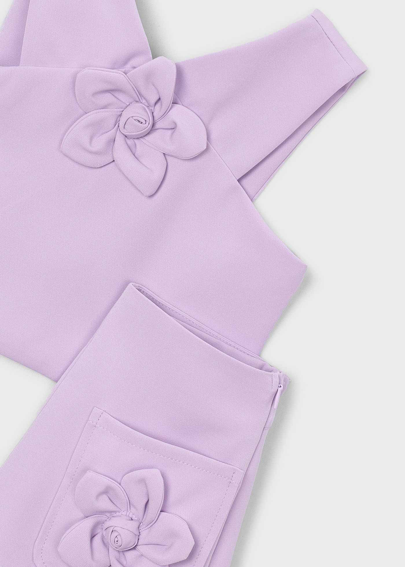 Αναδείξτε το καλοκαιρινό στυλ της μικρής σας με αυτό το εντυπωσιακό παιδικό σετ Mayoral σε λιλά χρώμα, που συνδυάζει κομψότητα, άνεση και μοντέρνο design. Το σετ αποτελείται από αμάνικο cropped τοπ με χιαστί τιράντες και διακοσμητικό λουλούδι στο μπροστινό μέρος, καθώς και σορτς με τσέπες στολισμένες με αντίστοιχα υφασμάτινα λουλούδια, δημιουργώντας ένα αρμονικό και ιδιαίτερο σύνολο.Το ύφασμα είναι απαλό και ελαφρύ, ιδανικό για τις ζεστές ημέρες του καλοκαιριού, ενώ η άνετη εφαρμογή επιτρέπει ελευθερία κινήσεων στο παιχνίδι και στη βόλτα. Το λιλά χρώμα προσθέτει χαρούμενη διάθεση και κάνει το σύνολο να ξεχωρίζει σε κάθε εμφάνιση.