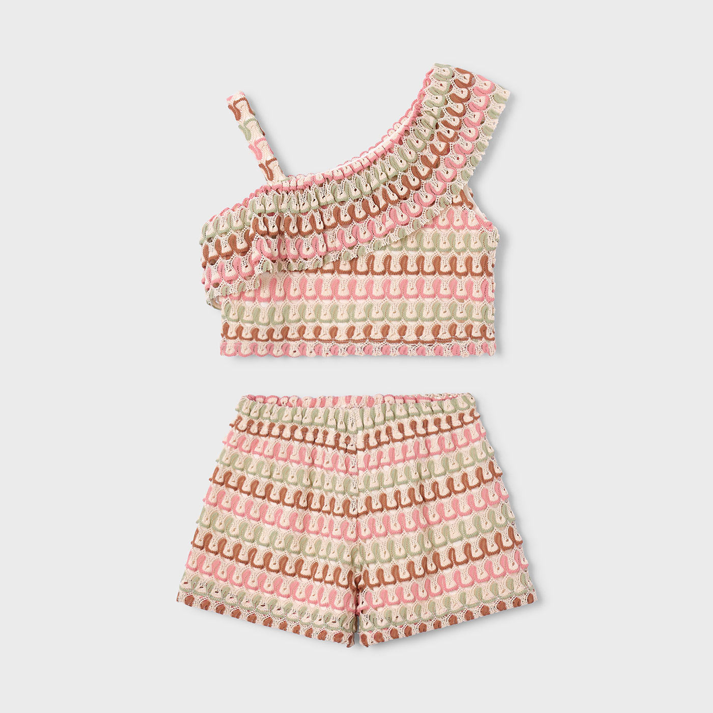 Ένα ιδιαίτερα κομψό και καλοκαιρινό παιδικό σετ Mayoral, σχεδιασμένο για μικρά κορίτσια που ξεχωρίζουν με το στυλ τους. Το σετ αποτελείται από αμάνικη μπλούζα one shoulder και σορτς, σε υπέροχο πλεκτόδαντελένιο σχέδιο με αρμονικό συνδυασμό αποχρώσεων μπεζ, σομόν και μέντας.Η μπλούζα διαθέτει ασύμμετρο κόψιμο με έναν ώμο και διακοσμητικό βολάν, προσδίδοντας μοντέρνα και κομψή αισθητική. Το σορτς έχει ελαστική μέση για άνετη εφαρμογή και ολοκληρώνει ιδανικά το σύνολο. Το ανάλαφρο και διάτρητο ύφασμα το καθιστά ιδανικό για τις ζεστές ημέρες, προσφέροντας άνεση και δροσερή αίσθηση.Ένα ξεχωριστό outfit που συνδυάζει boho χαρακτήρα, καλοκαιρινή φινέτσα και ποιότητα Mayoral.