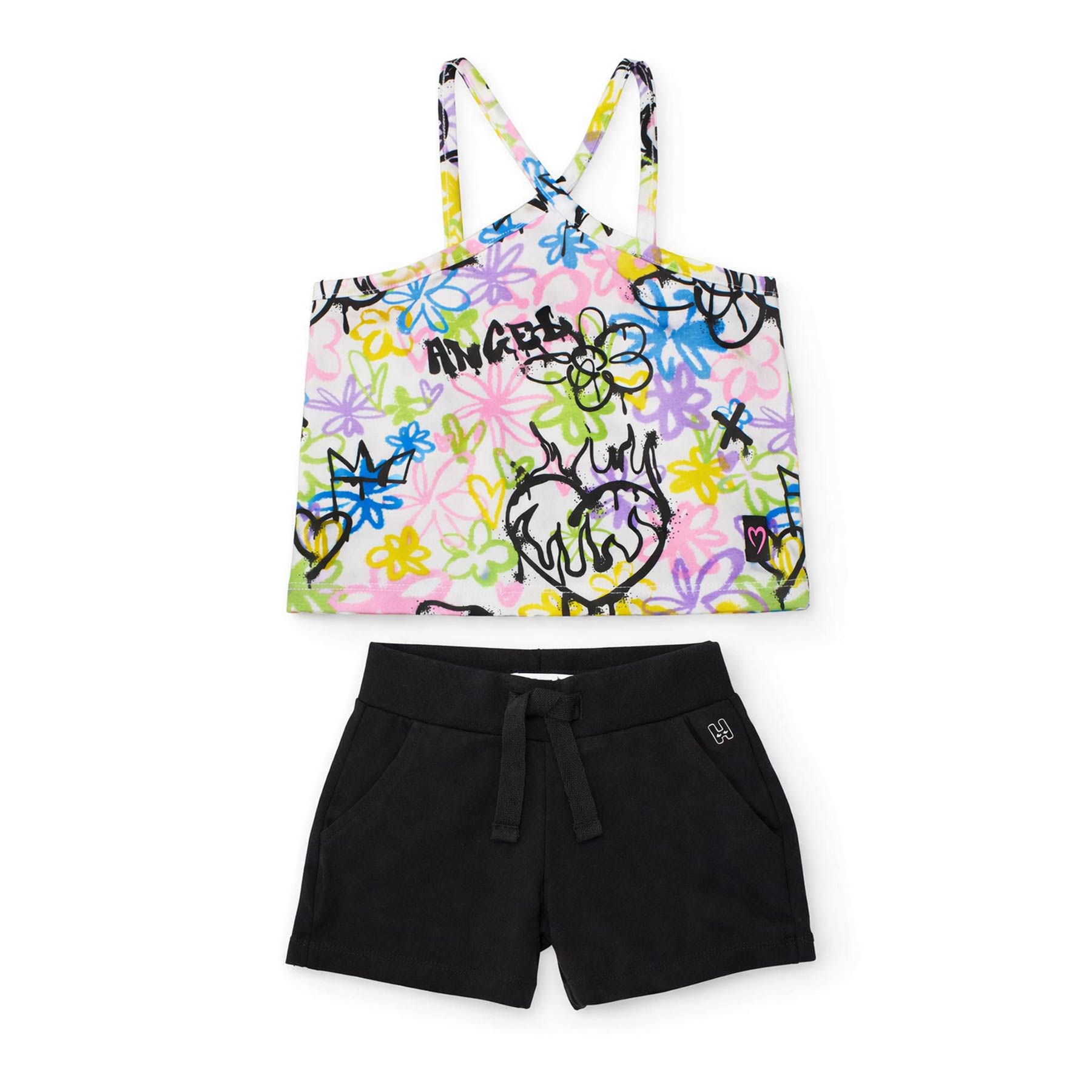 Το παιδικό σετ Nathkids φλοράλ-μαύρο ξεχωρίζει για τον δυναμικό του χαρακτήρα. Το πολύχρωμο floral top με καλλιτεχνικά στοιχεία συνδυάζεται ιδανικά με το minimal μαύρο σορτς, δημιουργώντας ένα ισορροπημένο και trendy αποτέλεσμα.