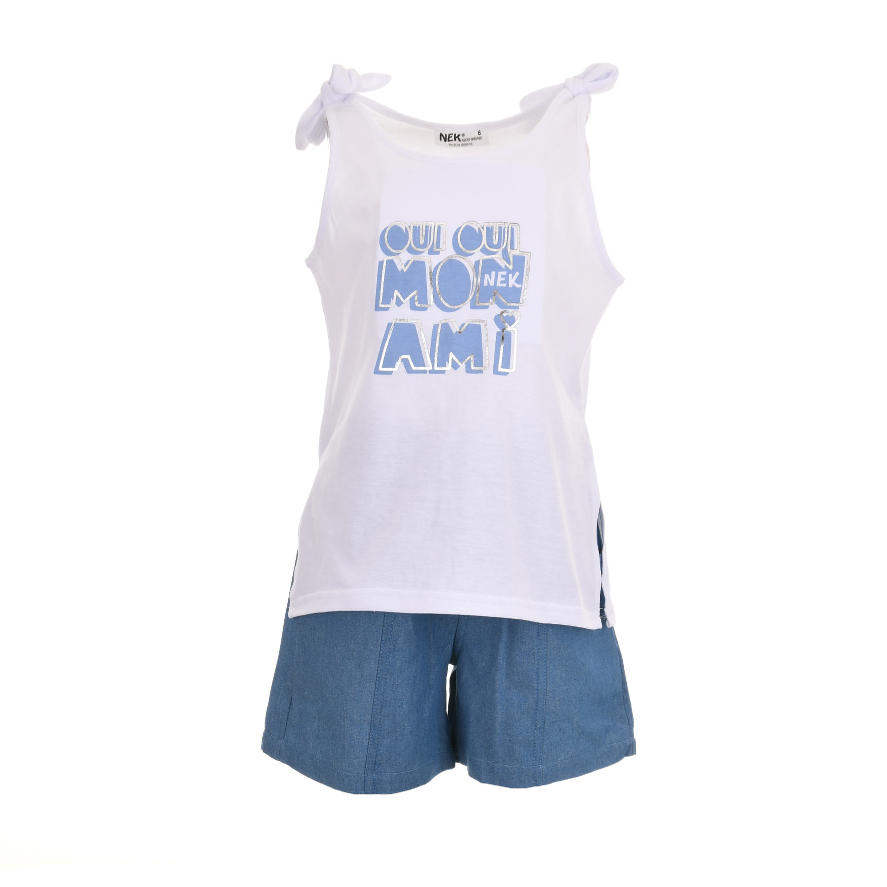 Το παιδικό σετ με σορτς για κορίτσια Nekidswear σε λευκό και τζιν είναι η ιδανική επιλογή για κομψές και άνετες καλοκαιρινές εμφανίσεις. Το σετ περιλαμβάνει λευκή αμάνικη μπλούζα με stylish τύπωμα και διακοσμητικούς φιόγκους στους ώμους, σε συνδυασμό με τζιν σορτσάκι που προσφέρει πρακτικότητα και ευκολία στην κίνηση.