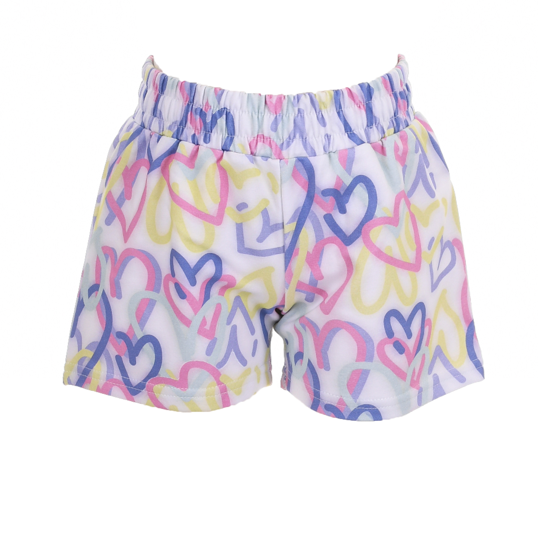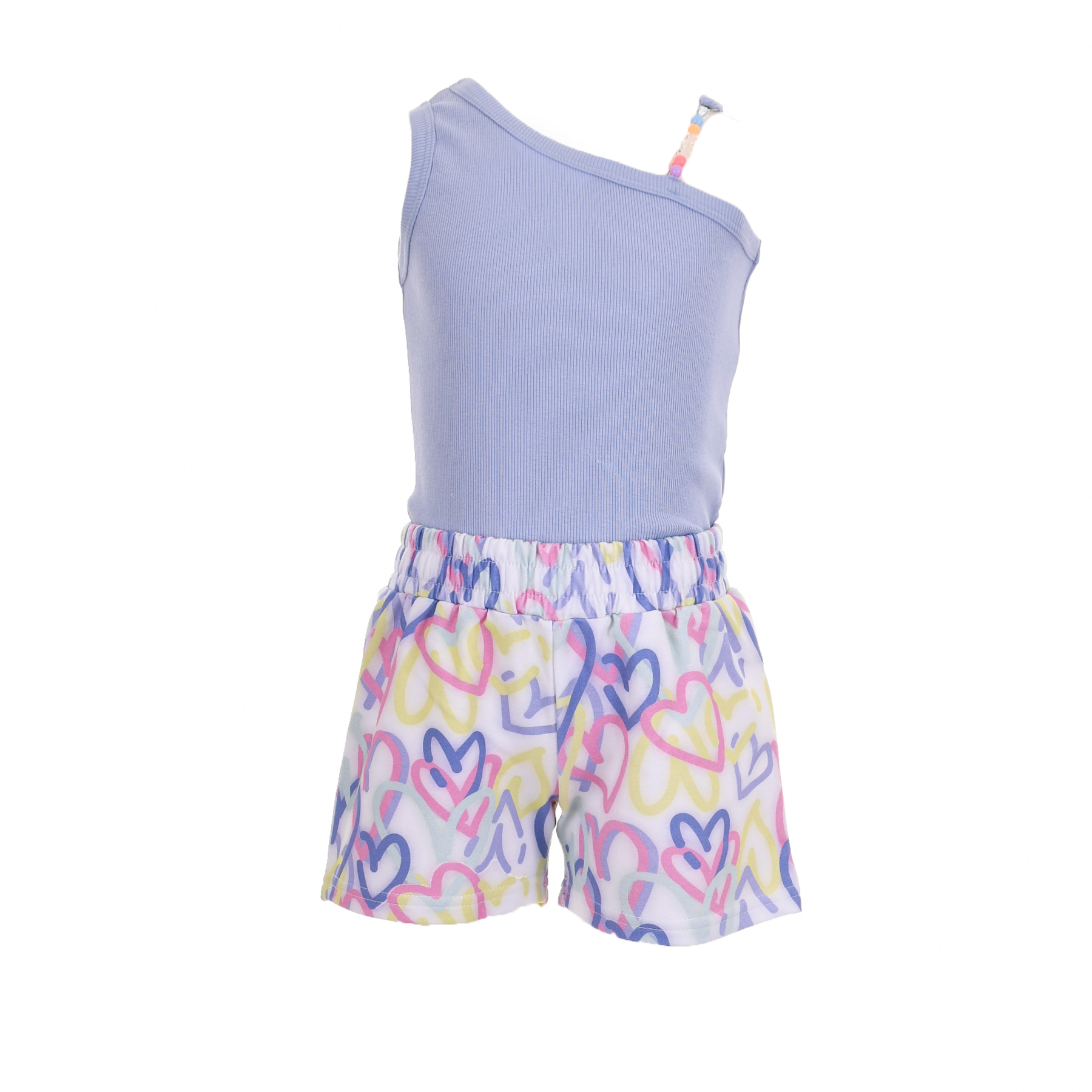 Το μοντέρνο τοπ σε απαλή λιλά απόχρωση χαρίζει ξεχωριστό στυλ, ενώ το εμπριμέ σορτσάκι με πολύχρωμες καρδιές προσθέτει παιχνιδιάρικη διάθεση και ζωντάνια στο look.