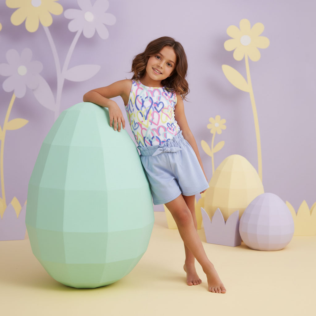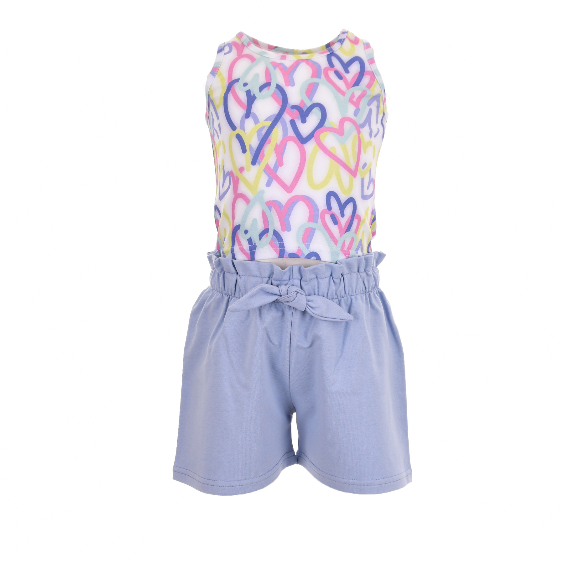 Η μπλούζα ξεχωρίζει για το πολύχρωμο σχέδιο με καρδιές, το οποίο χαρίζει ζωντάνια και χαρούμενο χαρακτήρα στο σύνολο. Το λιλά σορτς με ελαστική μέση και διακοσμητικό φιόγκο προσφέρει άνετη εφαρμογή και ελευθερία κινήσεων, καθιστώντας το ιδανικό για παιχνίδι, βόλτες και καλοκαιρινές δραστηριότητες.