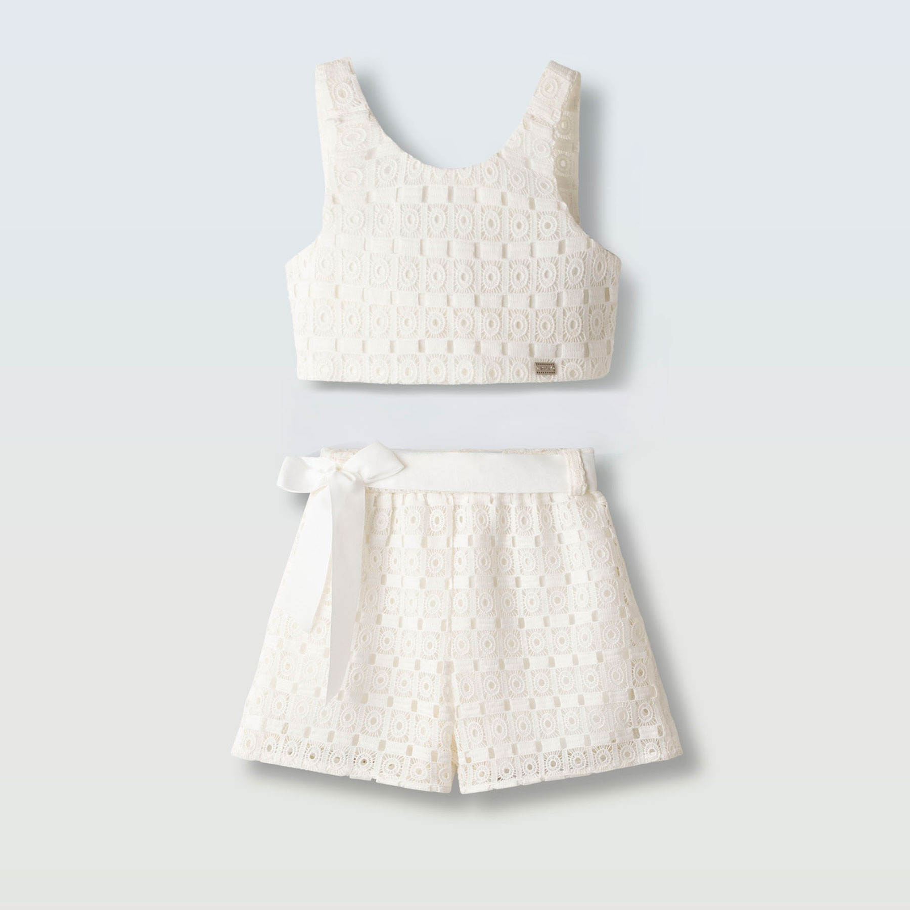 Το σετ αποτελείται από ένα crop top και ένα κομψό κεντητό σορτς.