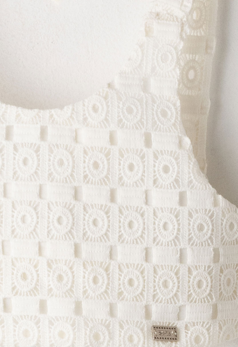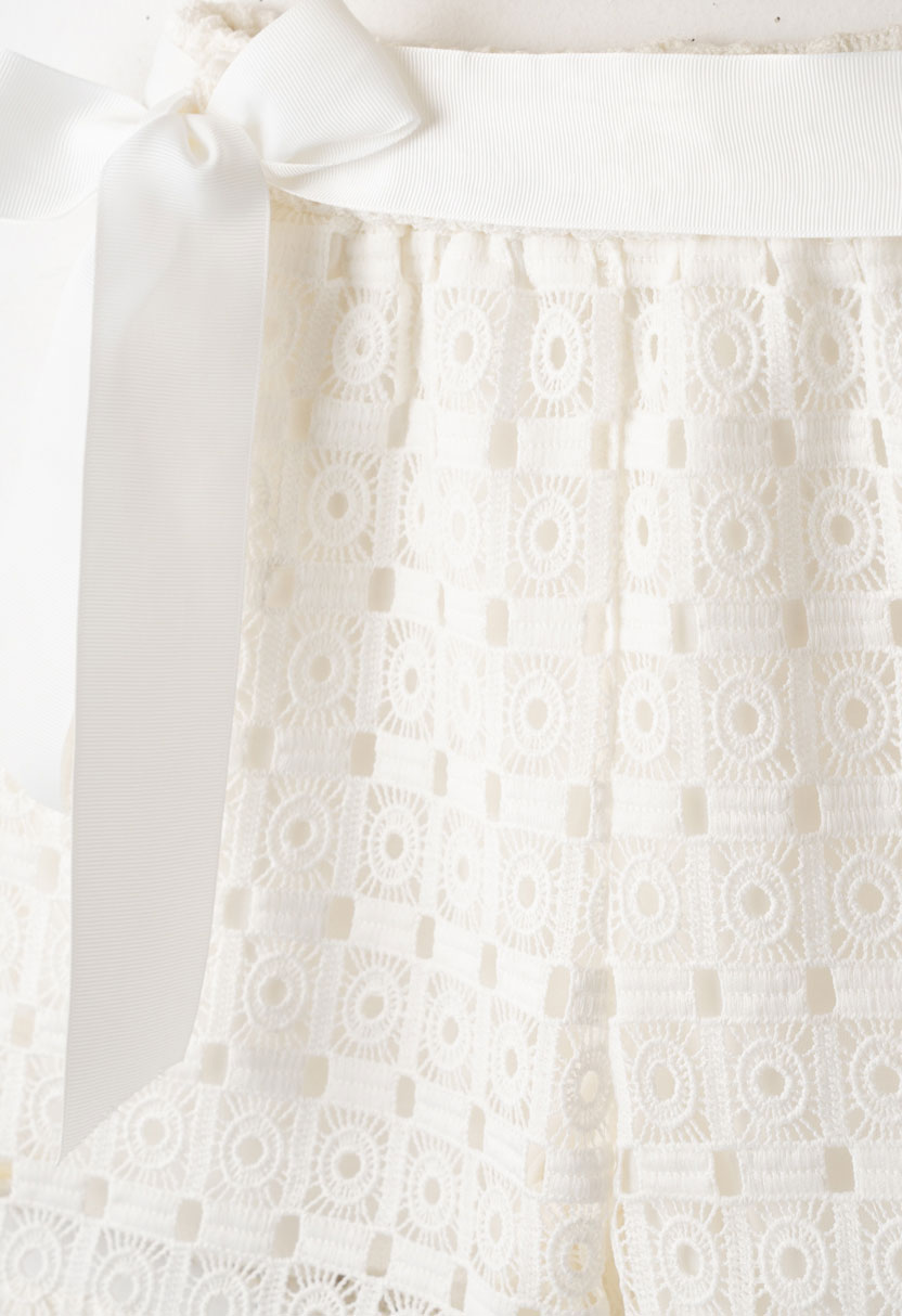 Το εκρού κεντητό ύφασμα με διακριτικά γεωμετρικά μοτίβα χαρίζει μία ρομαντική και φίνα αισθητική, ενώ το σορτς διαθέτει ζώνη με διακοσμητικό φιόγκο που προσθέτει μία χαριτωμένη και κομψή λεπτομέρεια. Η άνετη εφαρμογή και το ελαφρύ ύφασμα εξασφαλίζουν δροσερή αίσθηση και ελευθερία κινήσεων.