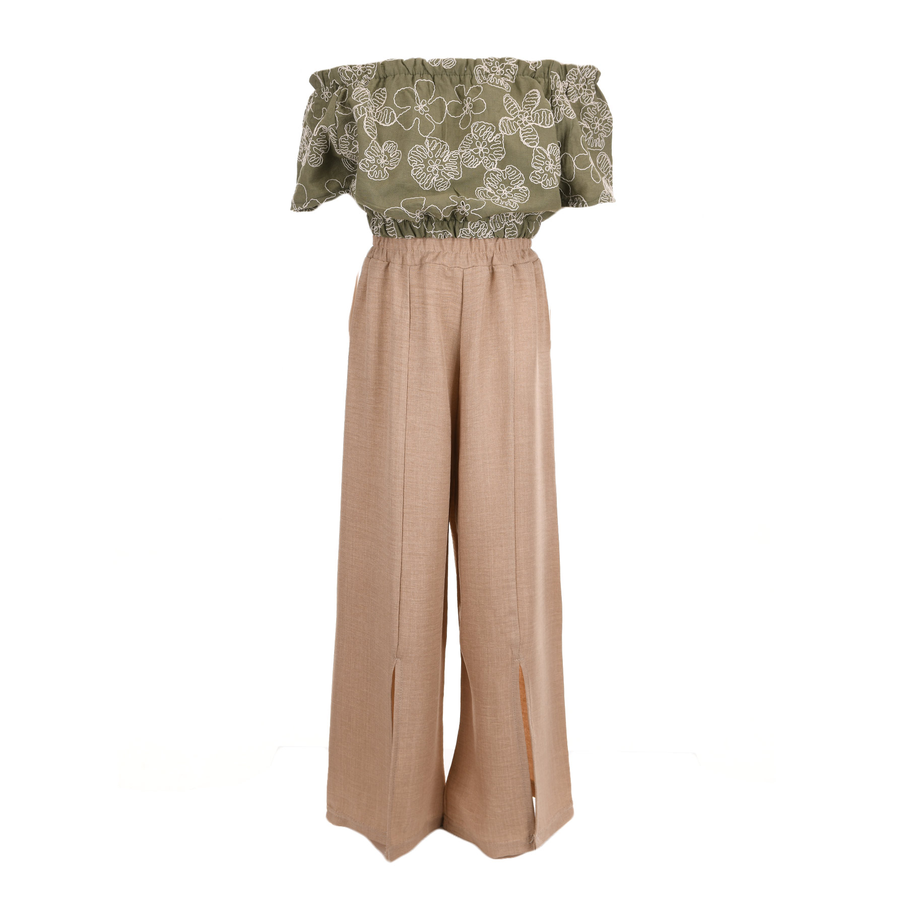Η off-shoulder μπλούζα με βολάν και διακριτικό floral μοτίβο χαρίζει θηλυκότητα και δροσερή αίσθηση, ενώ η παντελόνα σε φαρδιά γραμμή (wide-leg) εξασφαλίζει άνεση και ελευθερία κινήσεων. Η ελαστική μέση προσφέρει σταθερή και άνετη εφαρμογή, ιδανική για καθημερινή χρήση.