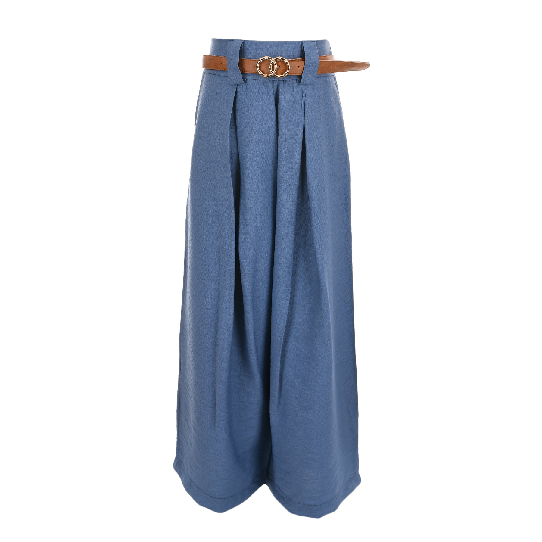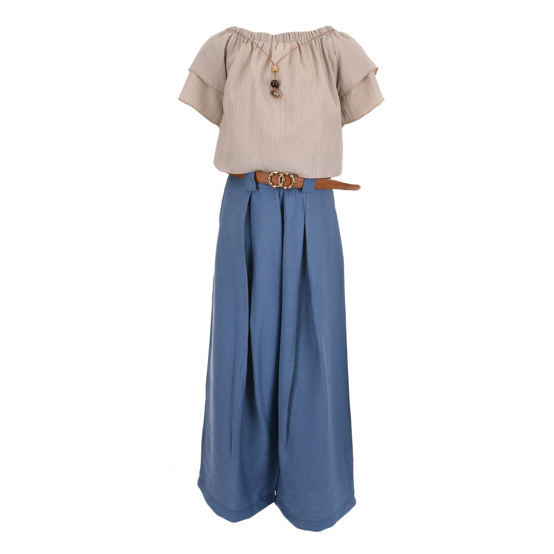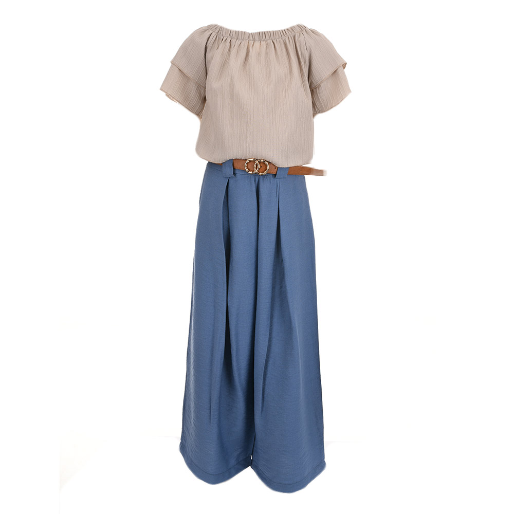 Η μπλούζα με ελαφριά υφή και βολάν στα μανίκια χαρίζει θηλυκότητα και αέρινη αίσθηση, ενώ η παντελόνα σε φαρδιά γραμμή (wide-leg) προσφέρει άνεση και κομψή κίνηση. Οι πιέτες στο μπροστινό μέρος και η ζώνη στη μέση προσθέτουν στιλιστική λεπτομέρεια που αναβαθμίζει το σύνολο.