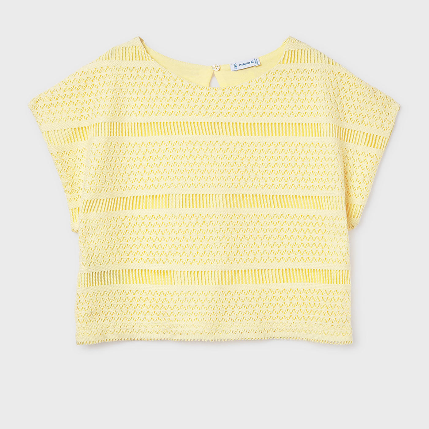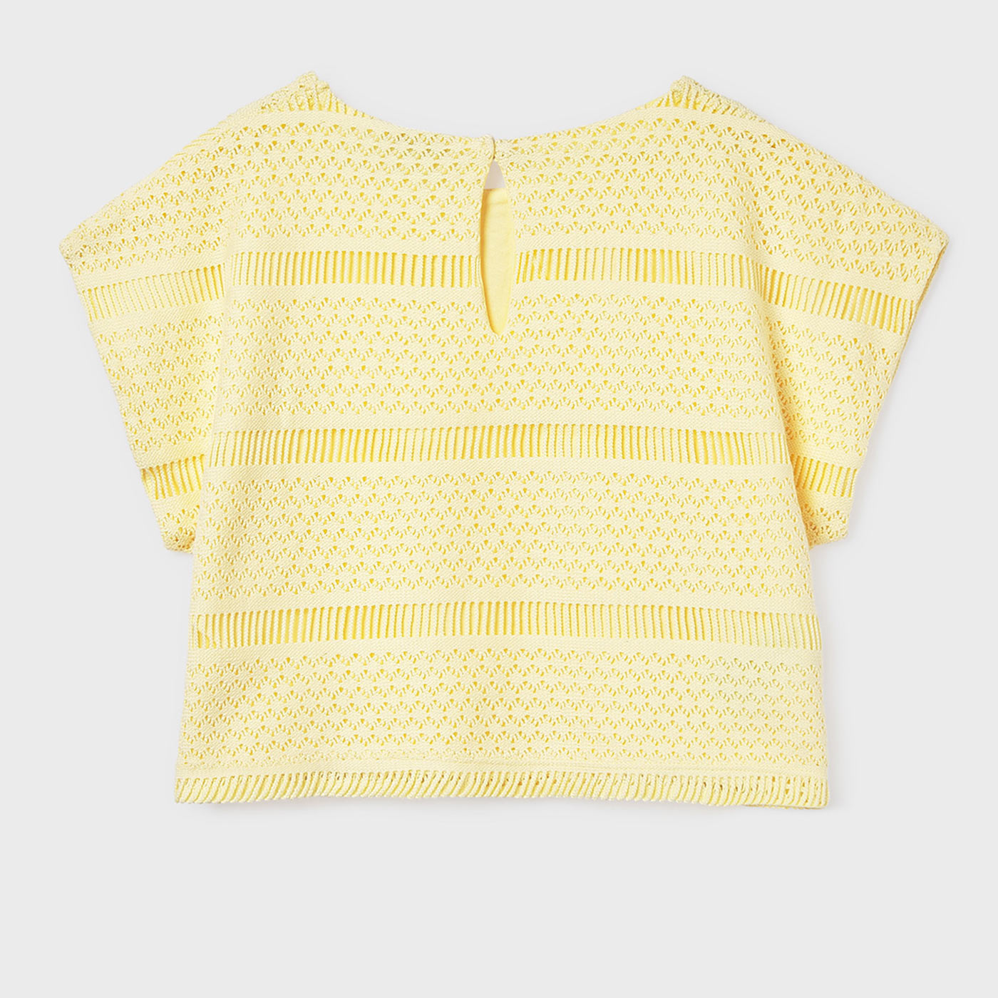 Φρέσκο, κομψό και απόλυτα καλοκαιρινό, αυτό το παιδικό crochet τοπ Mayoral σε λαμπερή κίτρινη απόχρωση είναι ιδανικό για ανάλαφρες και στυλάτες εμφανίσεις. Το πλεκτό crochet σχέδιο με διάτρητη υφή προσφέρει δροσερή αίσθηση και ξεχωριστό χαρακτήρα, ιδανικό για τις ζεστές ημέρες.Διαθέτει άνετη γραμμή και κοντό μήκος, ενώ τα μανίκια τύπου κιμονό χαρίζουν μοντέρνο και χαλαρό στυλ. Το κλείσιμο με κουμπί στο πίσω μέρος διευκολύνει το ντύσιμο, ενώ οι ανάγλυφες πλεκτές ρίγες προσθέτουν κομψή λεπτομέρεια. Συνδυάζεται εύκολα με φούστες, σορτς ή παντελόνια, δημιουργώντας ολοκληρωμένα καλοκαιρινά σύνολα.